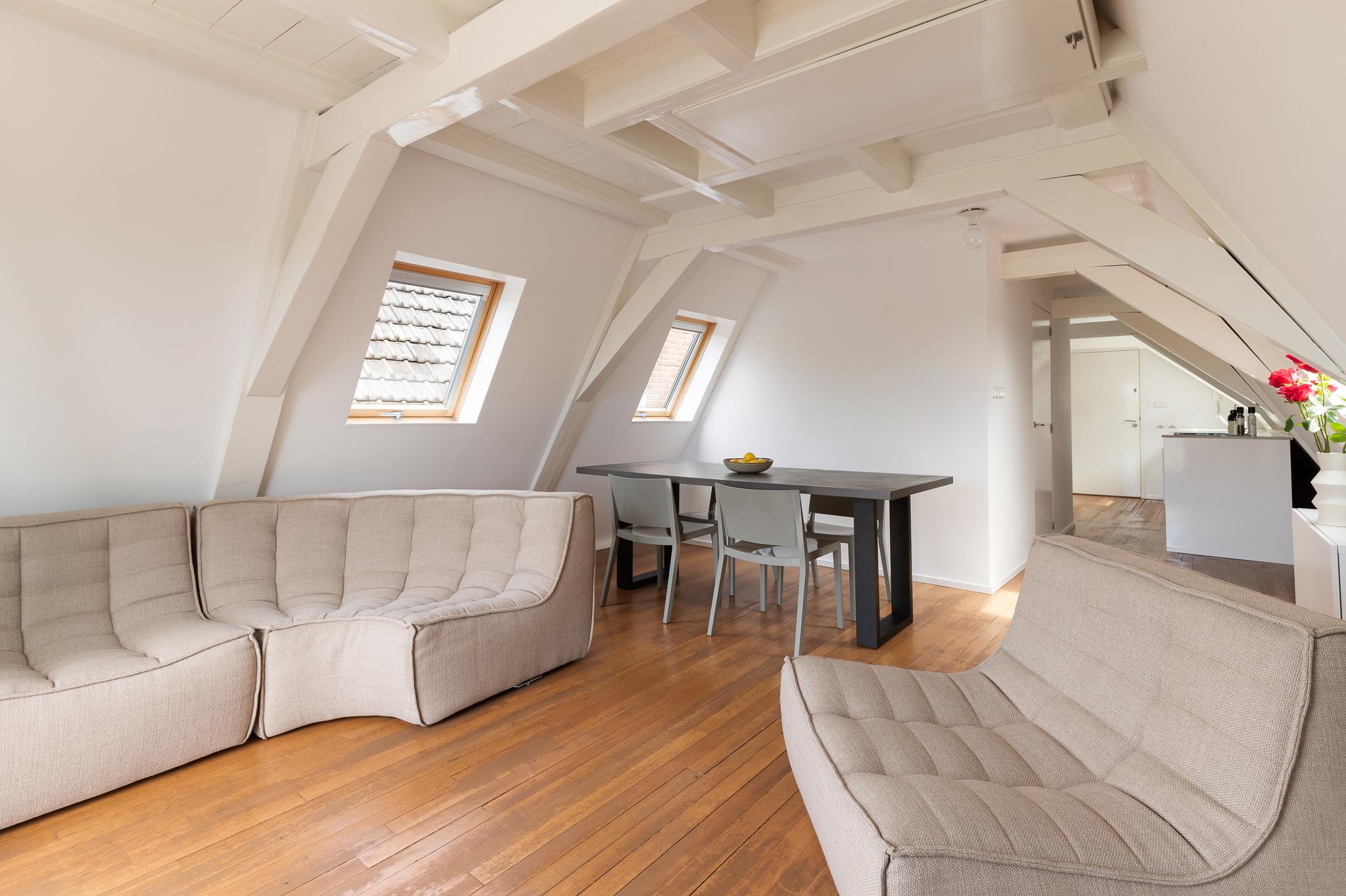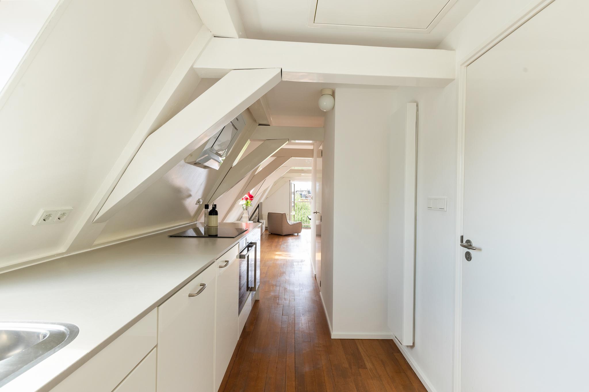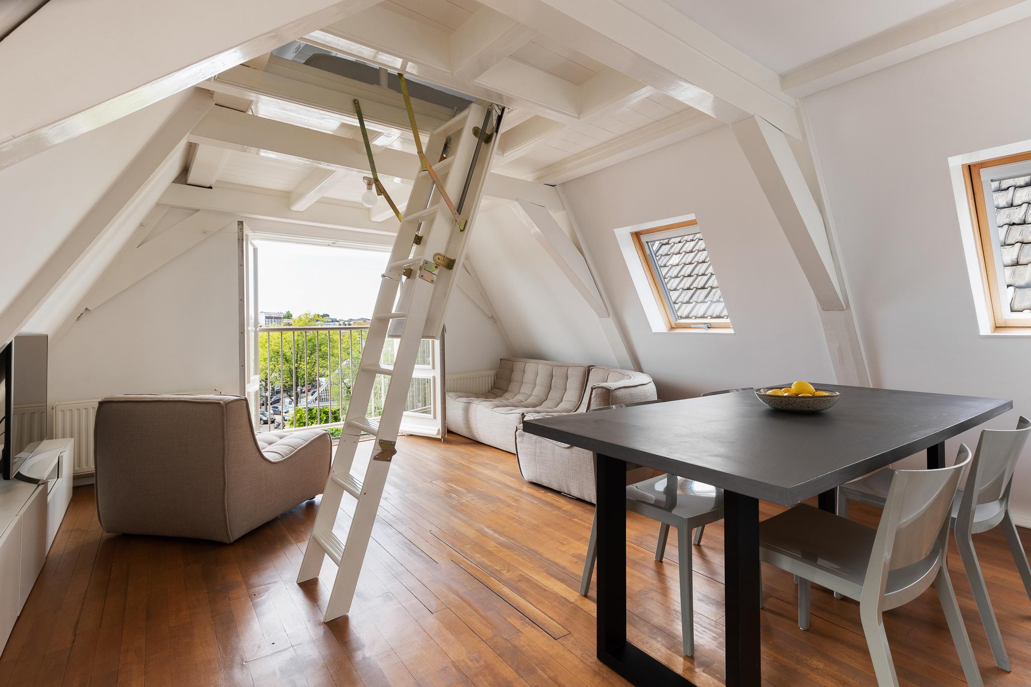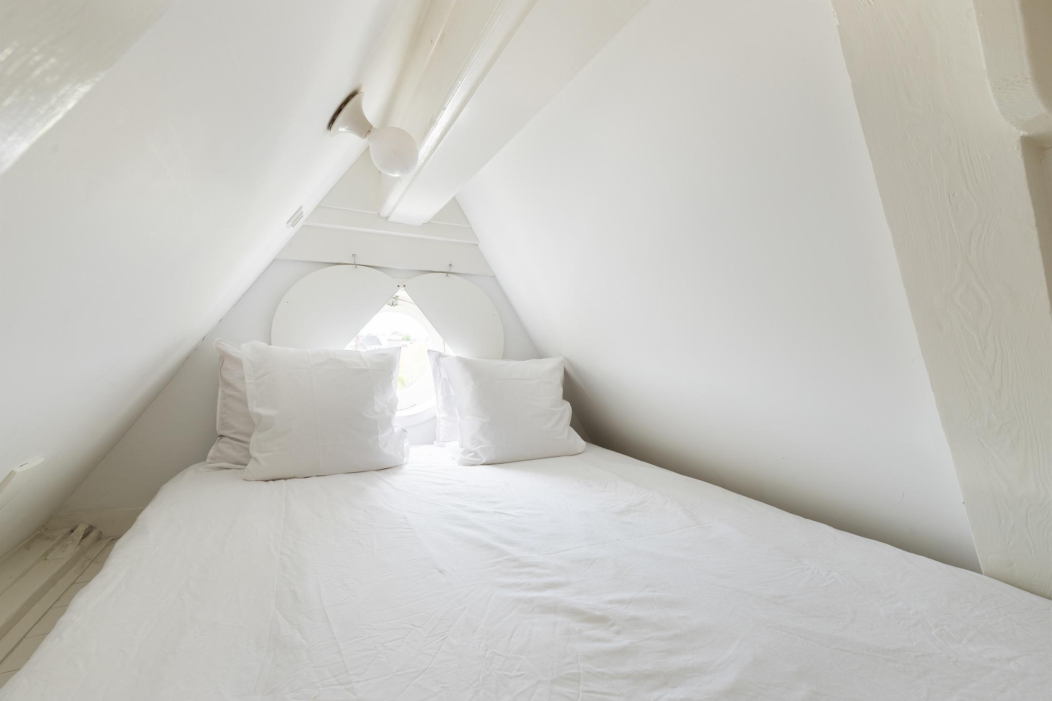 A pull-out staircase gives access to the second room on the 6th floor, which can be used as a second (guest) bedroom with a round window overlooking the canal.