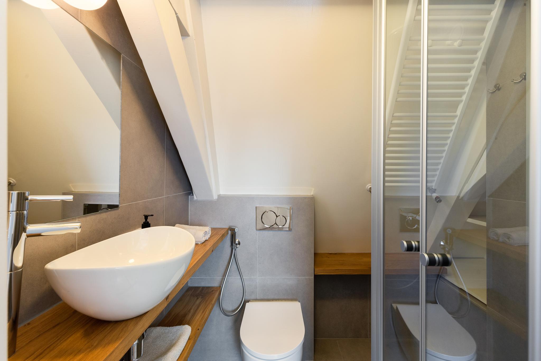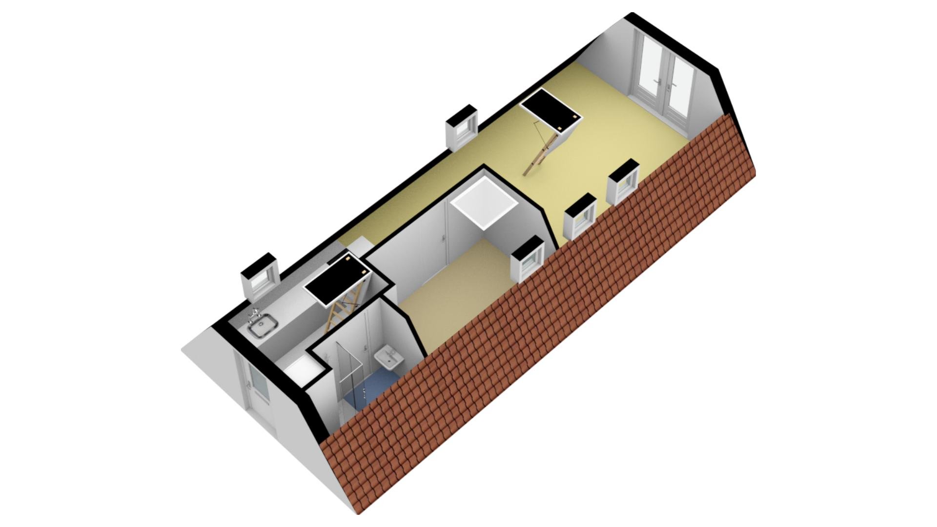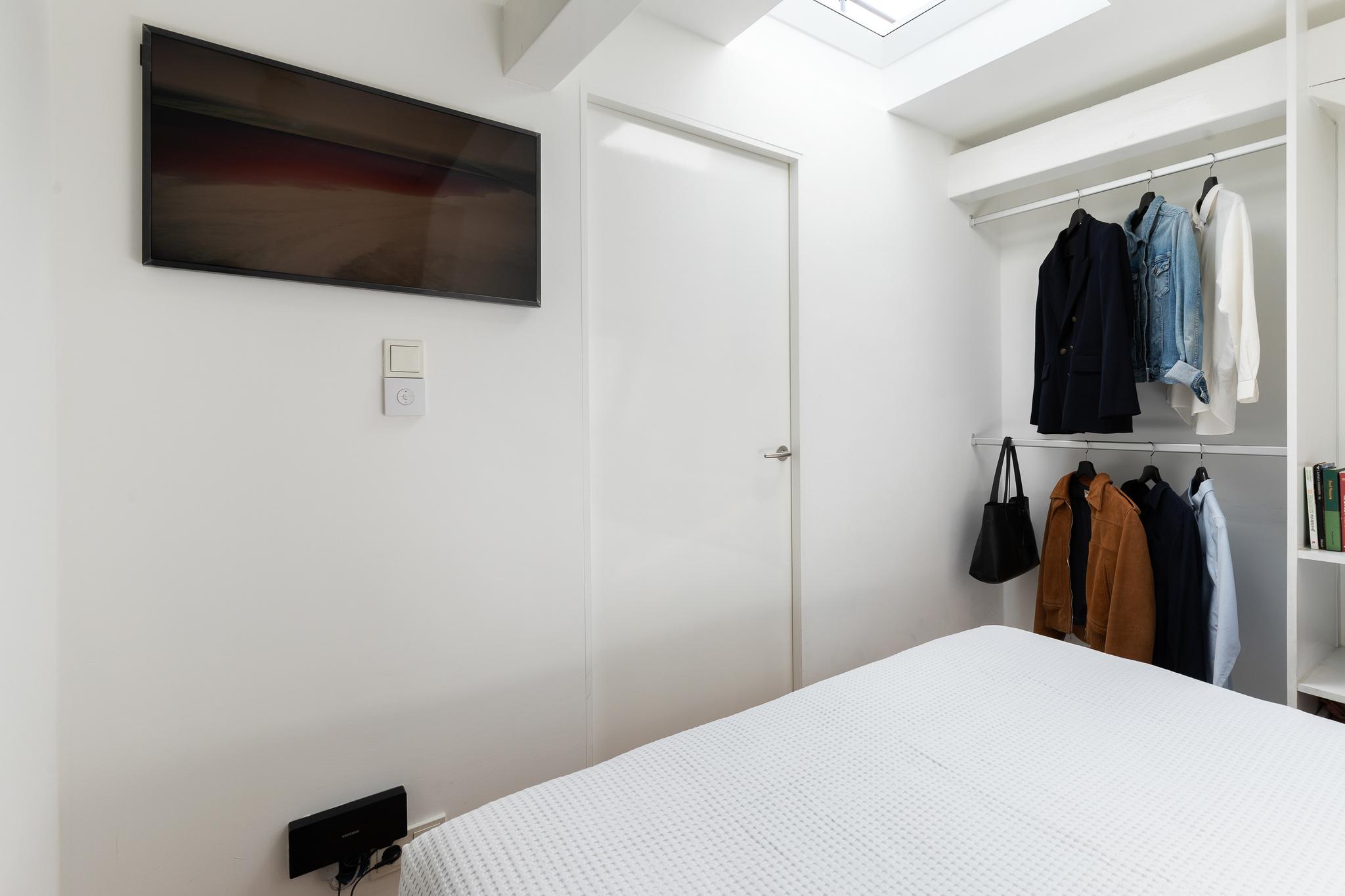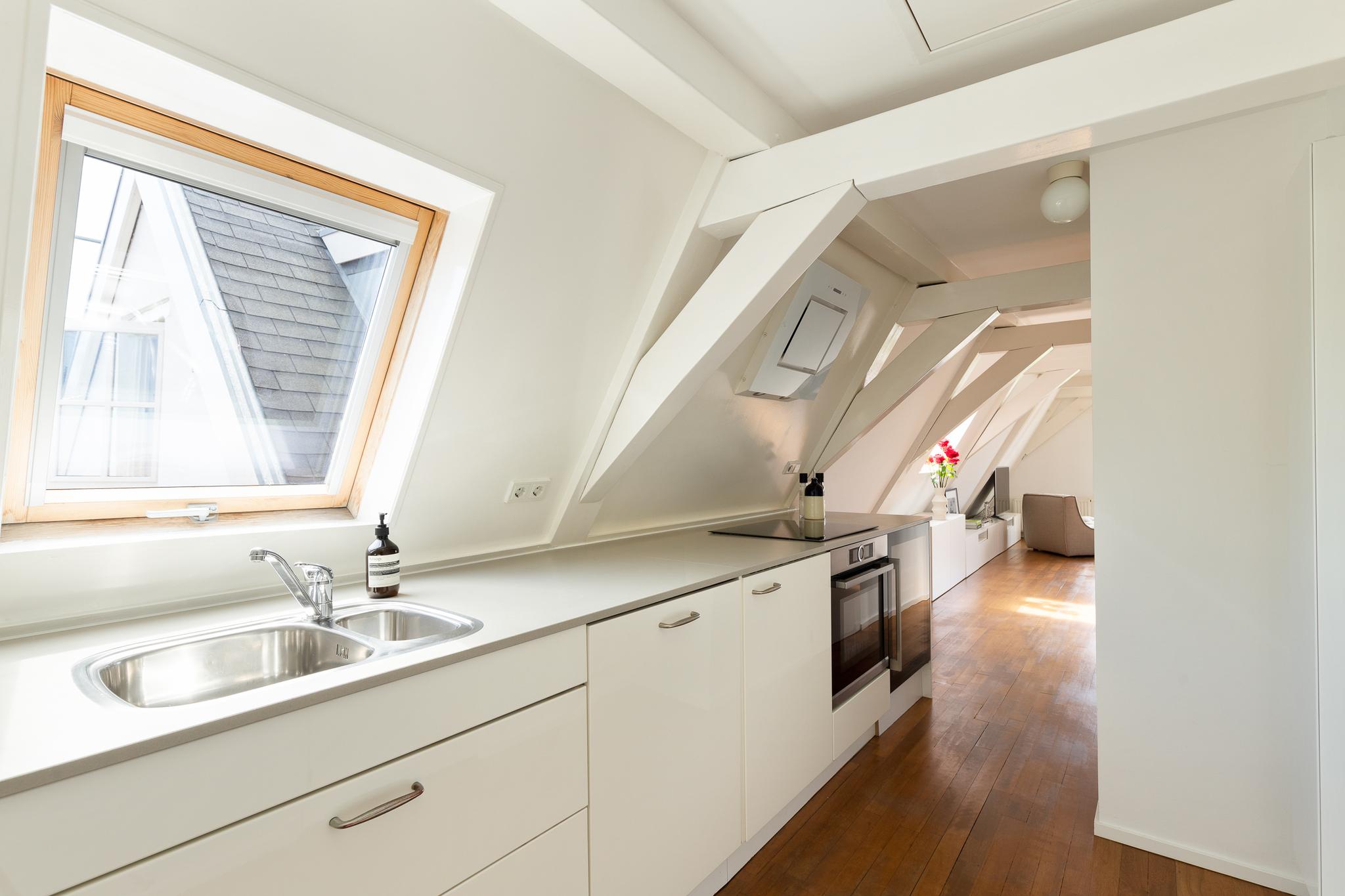 A pull-out staircase gives access to the second room on the 6th floor, which can be used as a second (guest) bedroom with a round window overlooking the canal.