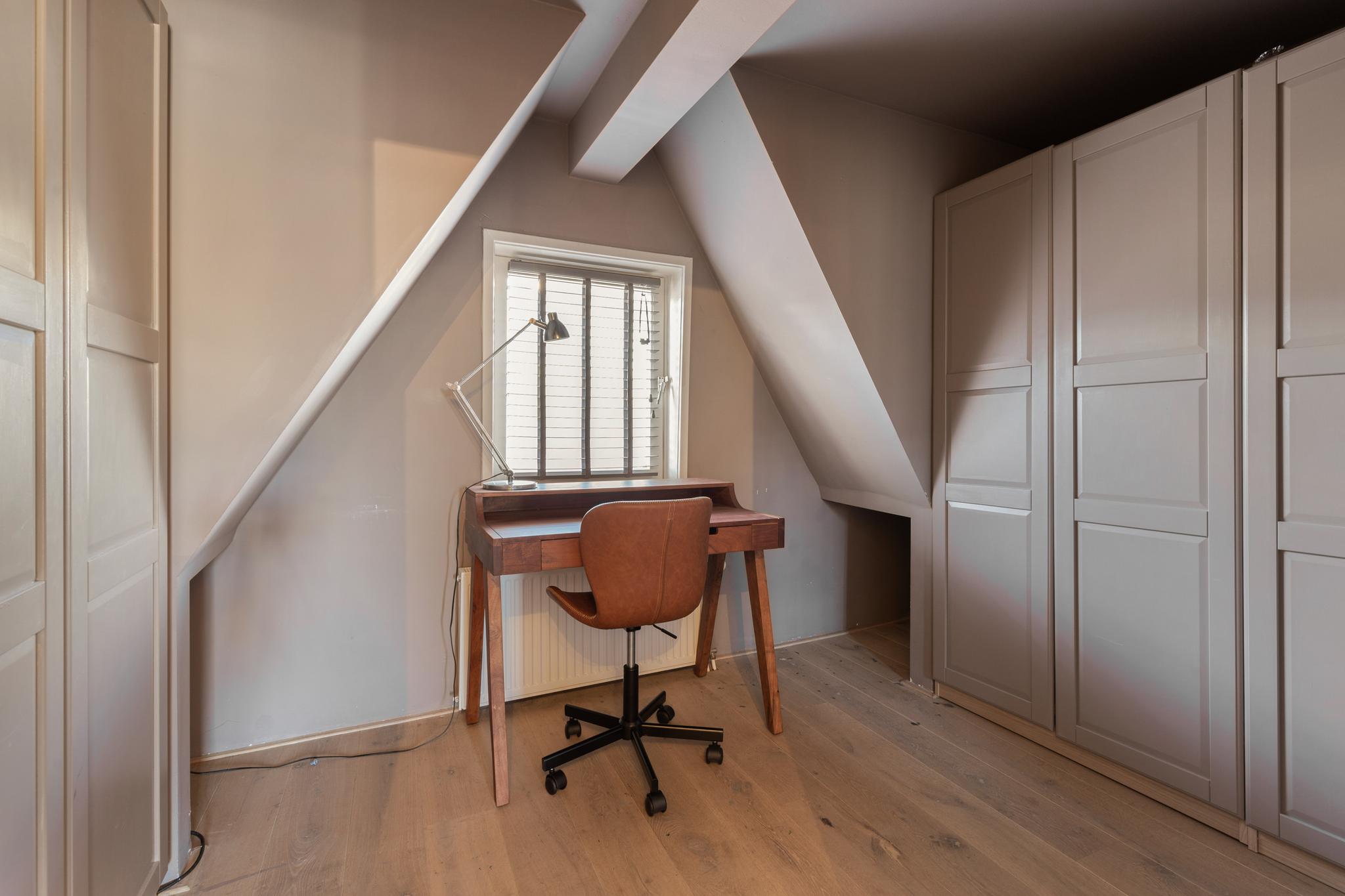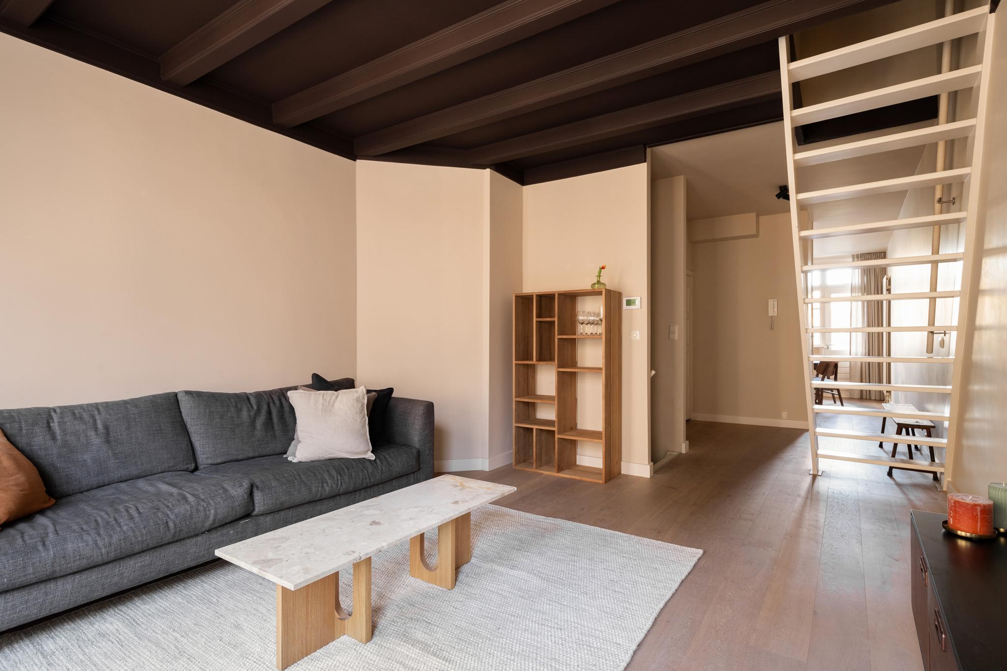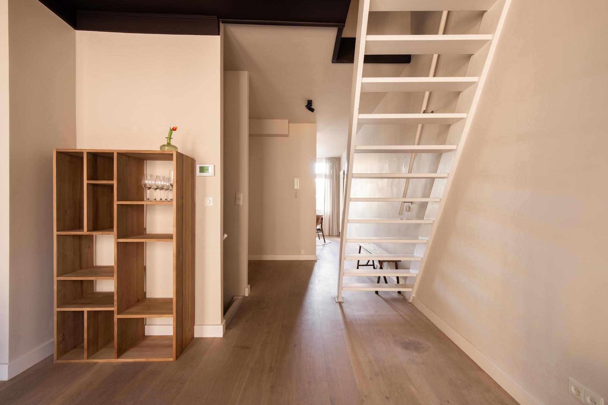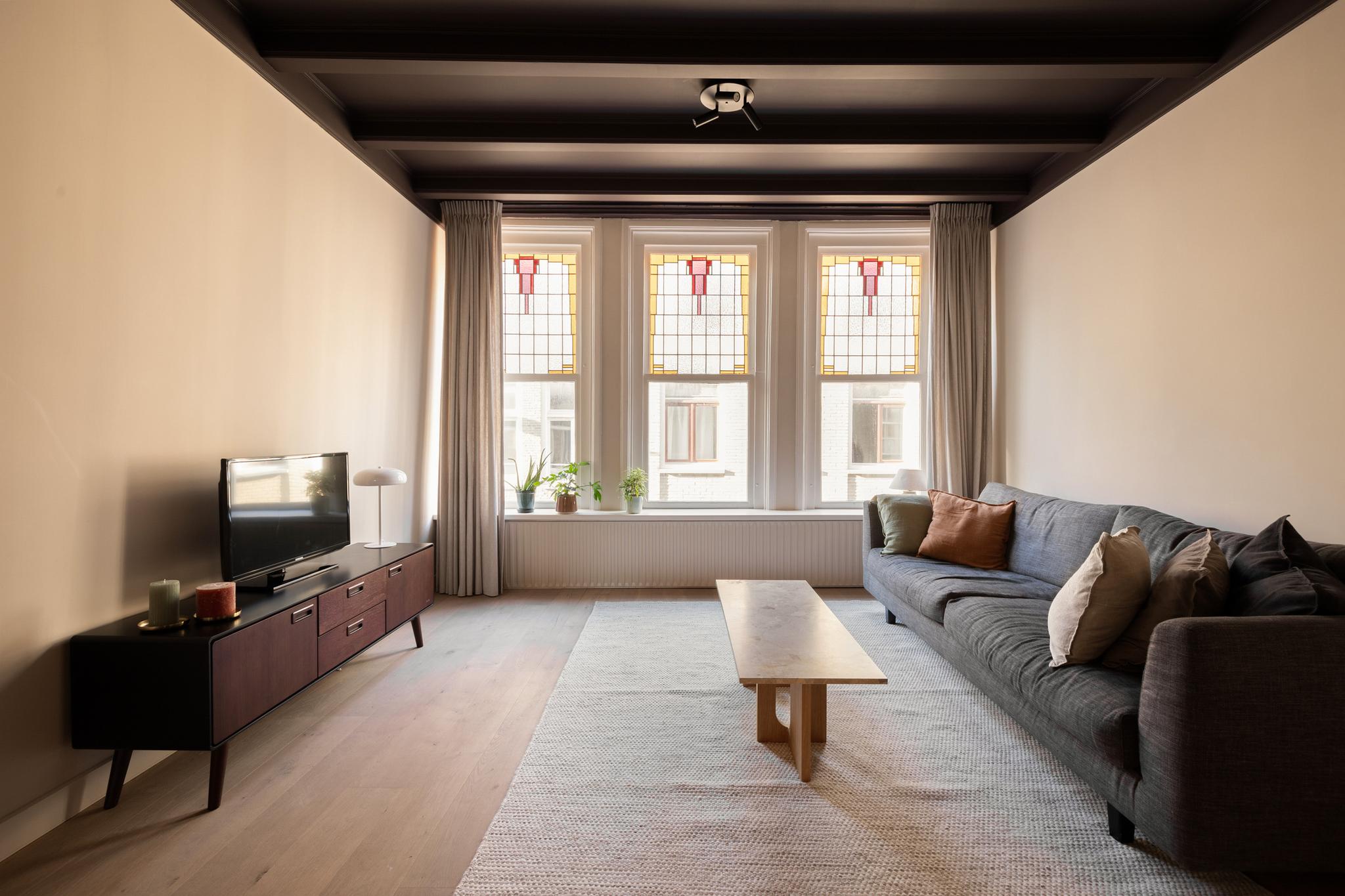 The neat, communal staircase leads up to the apartment’s entrance on the 1st floor, followed by a private staircase to the 2nd floor. Here, you enter the spacious and bright living with exceptionally high ceilings boasting authentic beams, as well as three large windows at the front side with original stained-glass, overlooking the charming Eerste Goudsbloemdwarsstraat.