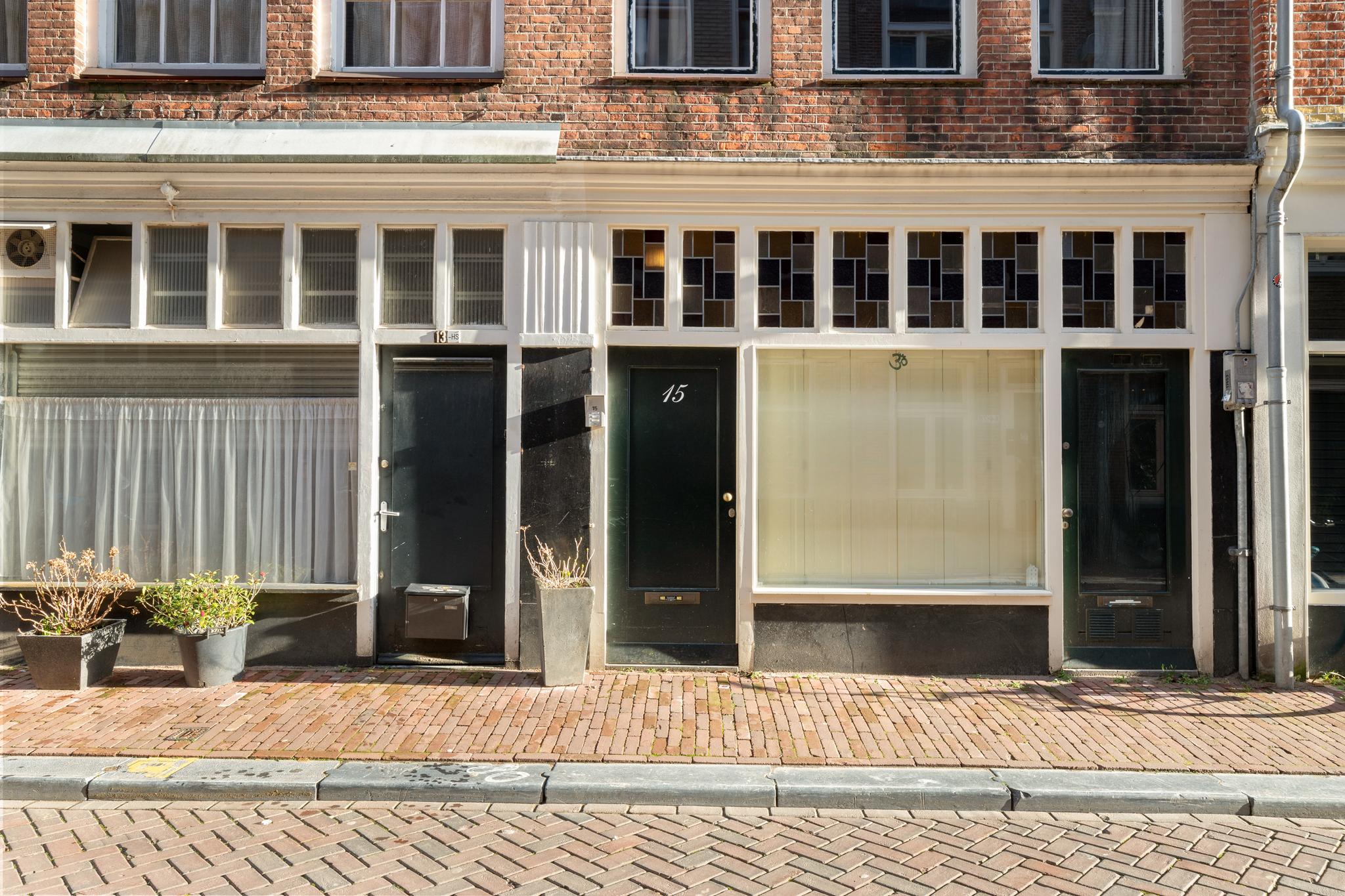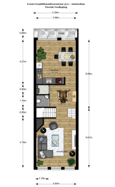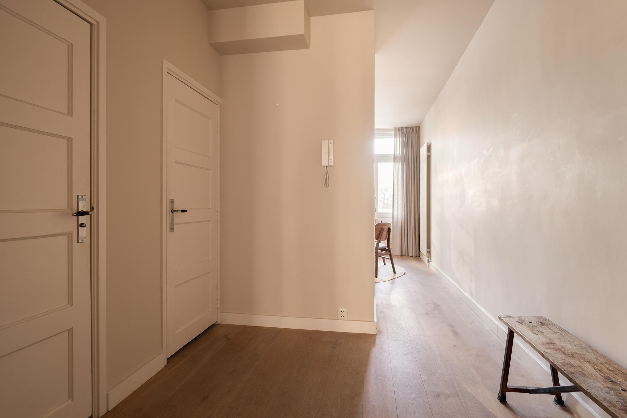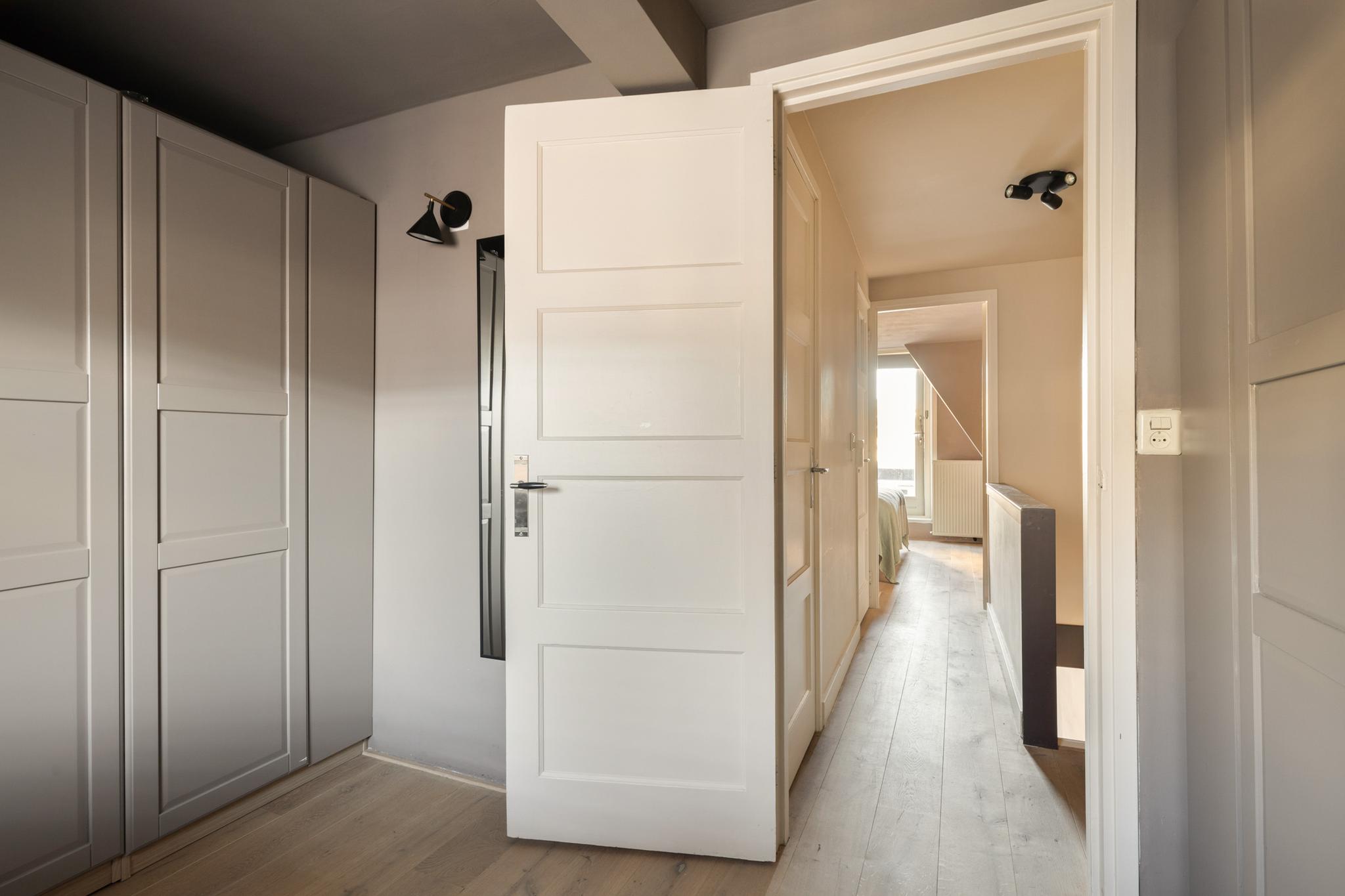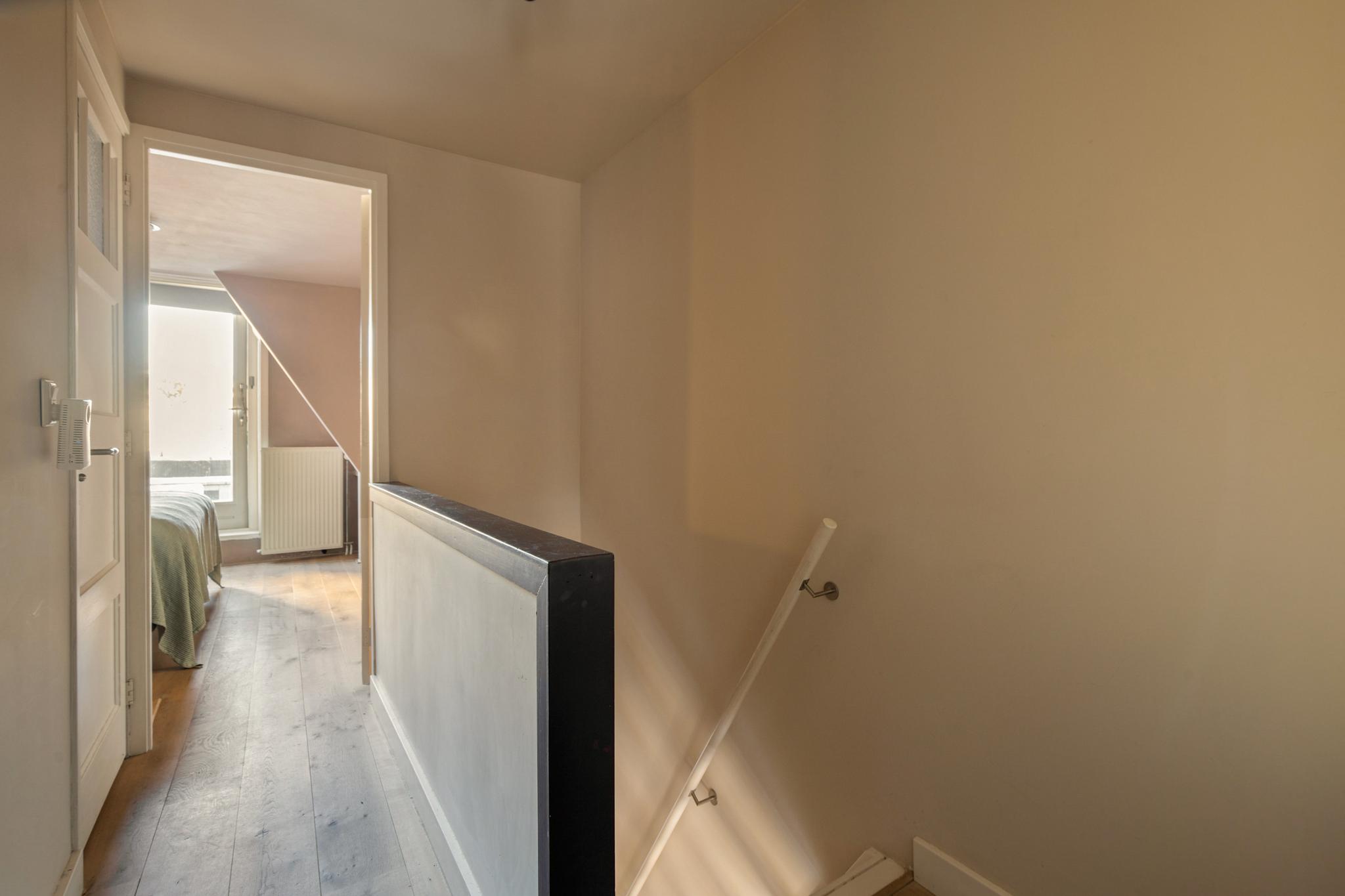 The neat, communal staircase leads up to the apartment’s entrance on the 1st floor, followed by a private staircase to the 2nd floor. Here, you enter the spacious and bright living with exceptionally high ceilings boasting authentic beams, as well as three large windows at the front side with original stained-glass, overlooking the charming Eerste Goudsbloemdwarsstraat.