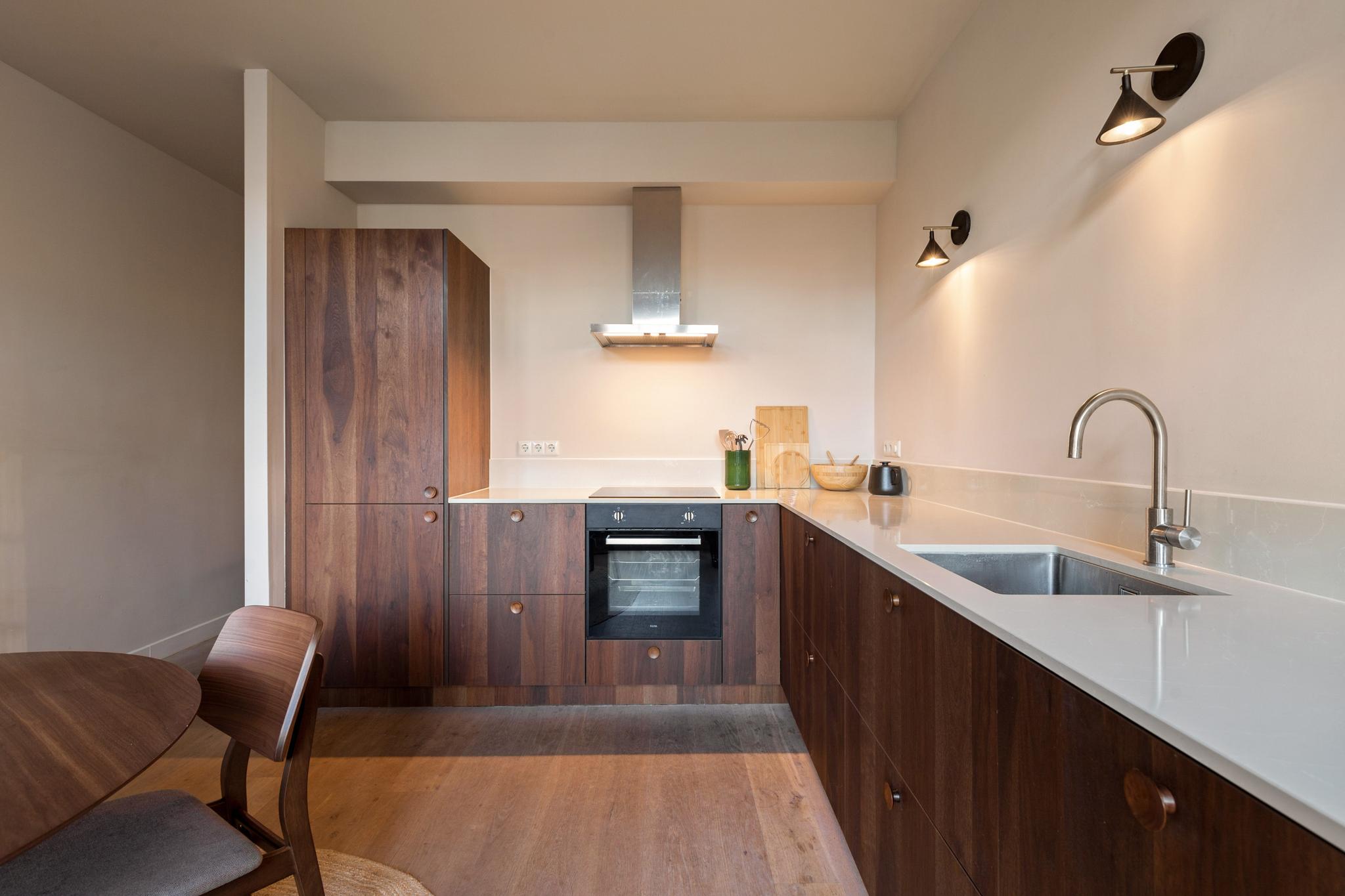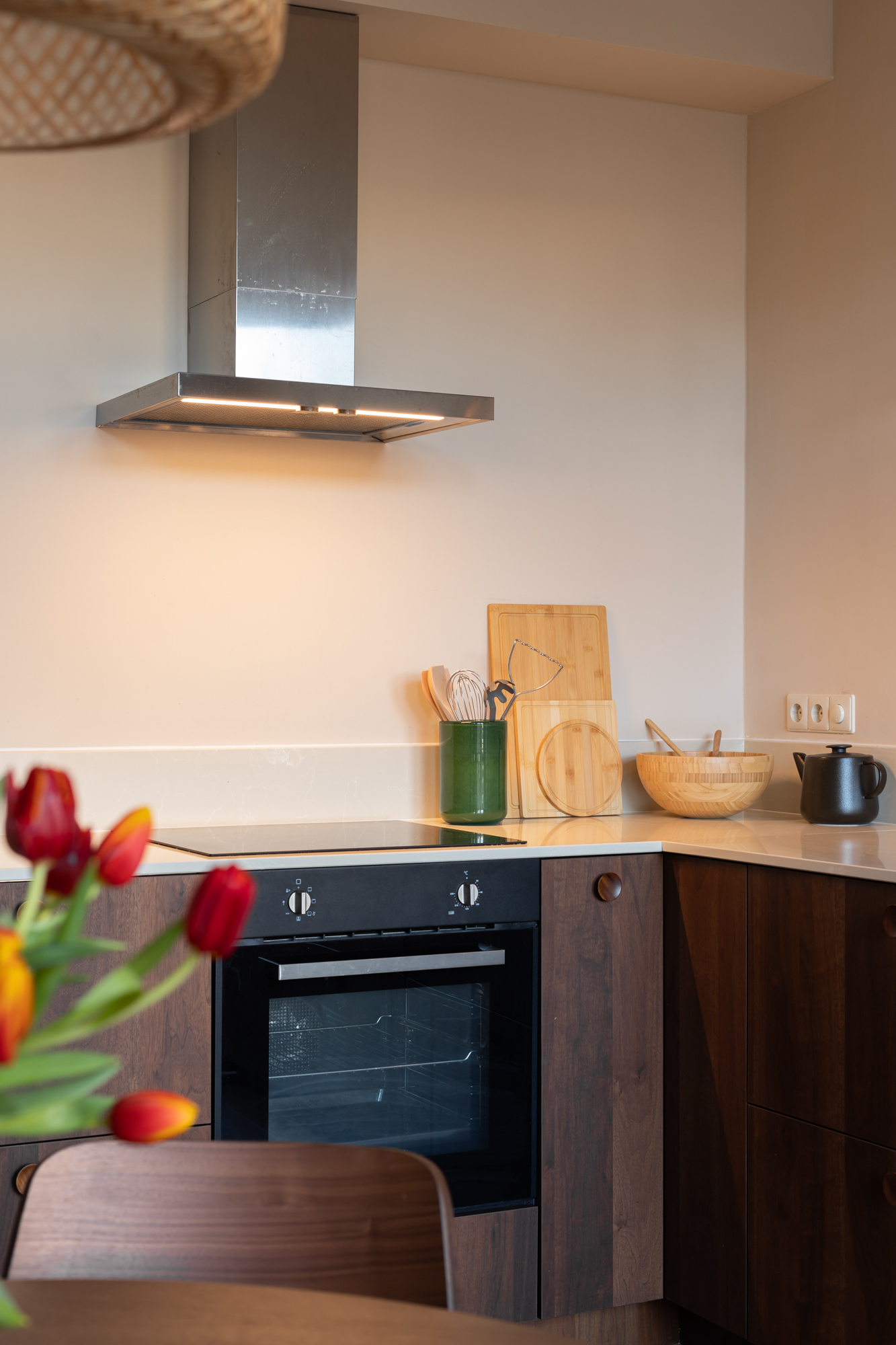 The rear side features a new and modern open-plan kitchen equipped with the necessary built-in appliances, as well as access to the balcony.