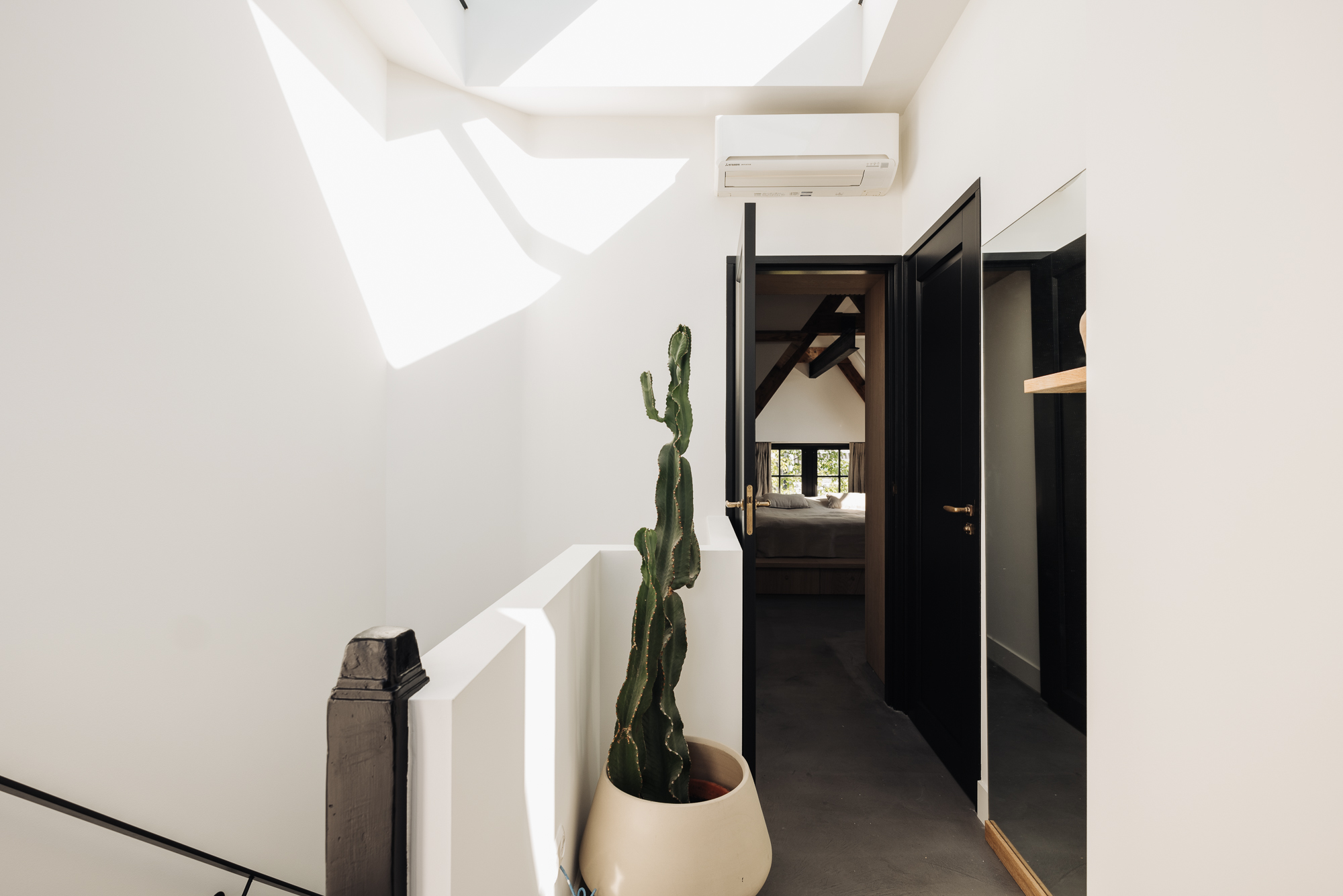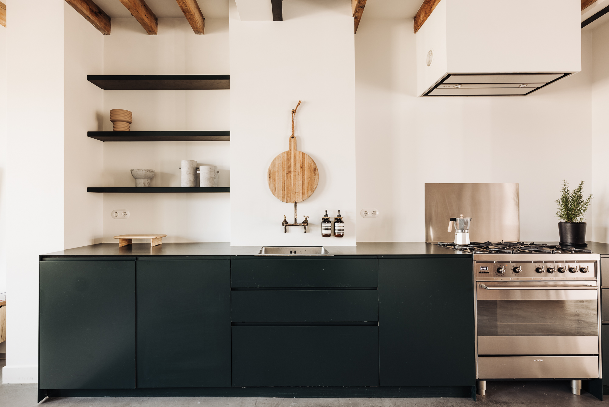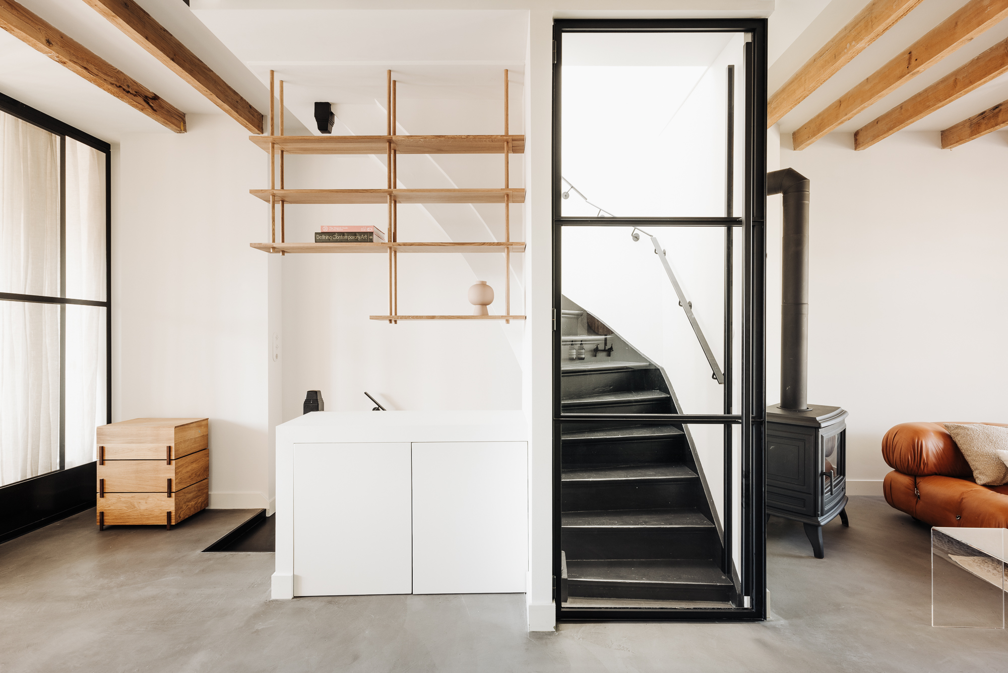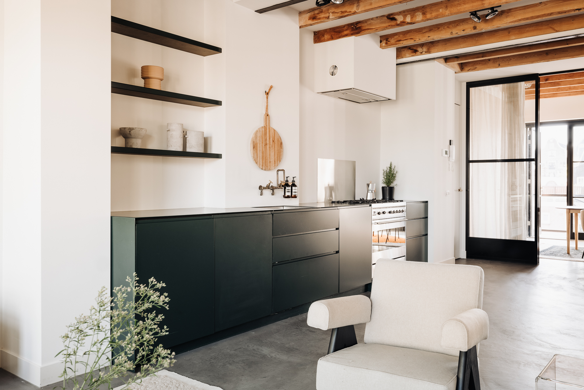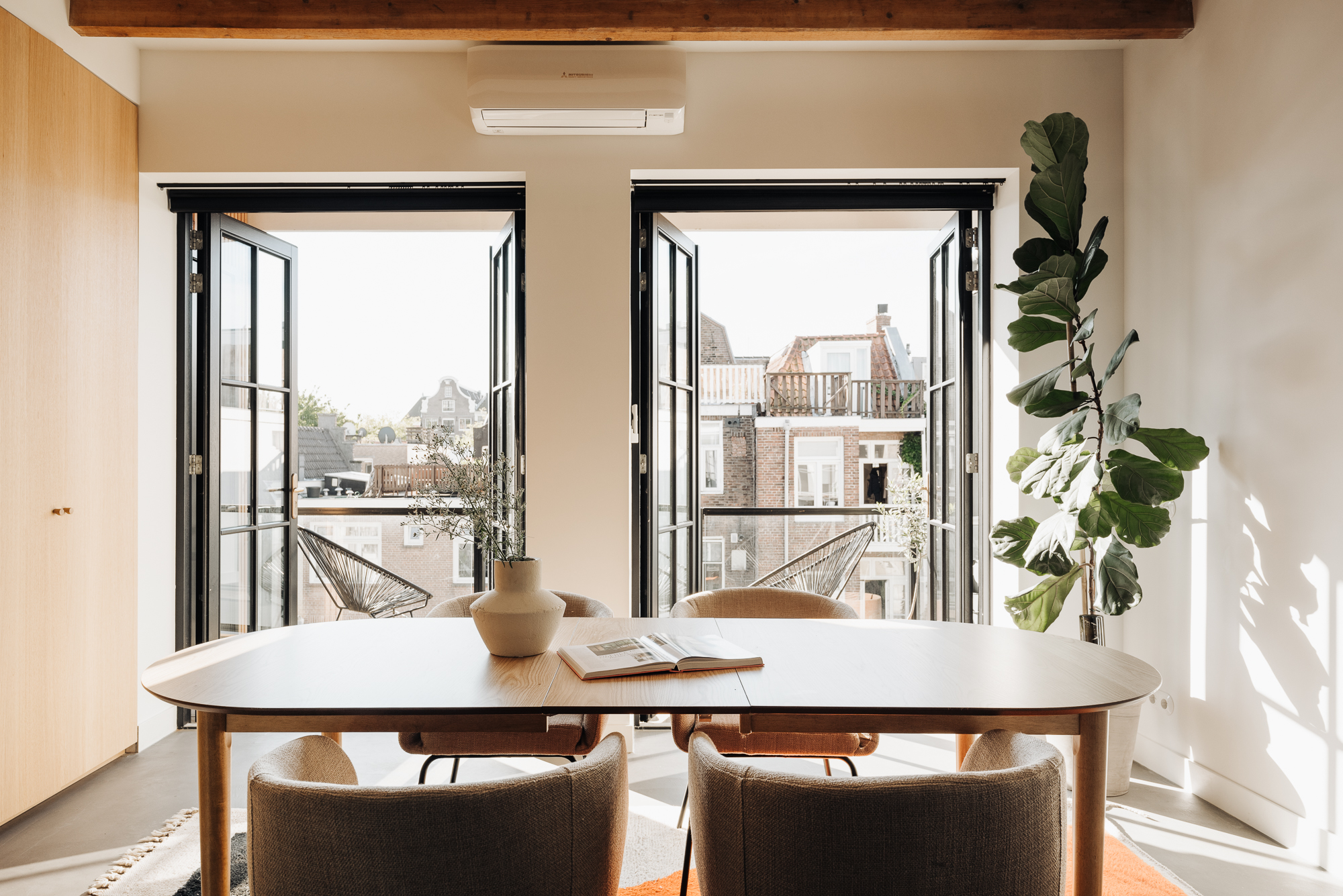 The dark forest green open kitchen is equipped with various built-in appliances, including a SMEG gas stove with oven, dishwasher, and a special copper faucet with vintage look. The dining area is reached through a steel sliding door that is largely made of glass, making both rooms flow seamlessly into each other. Furthermore, at the rear there is ample natural light as well, because of two French doors that give access to the house-wide balcony of 8 m2. Also, the dining room boasts a large, bespoke built-in closet and air conditioning.