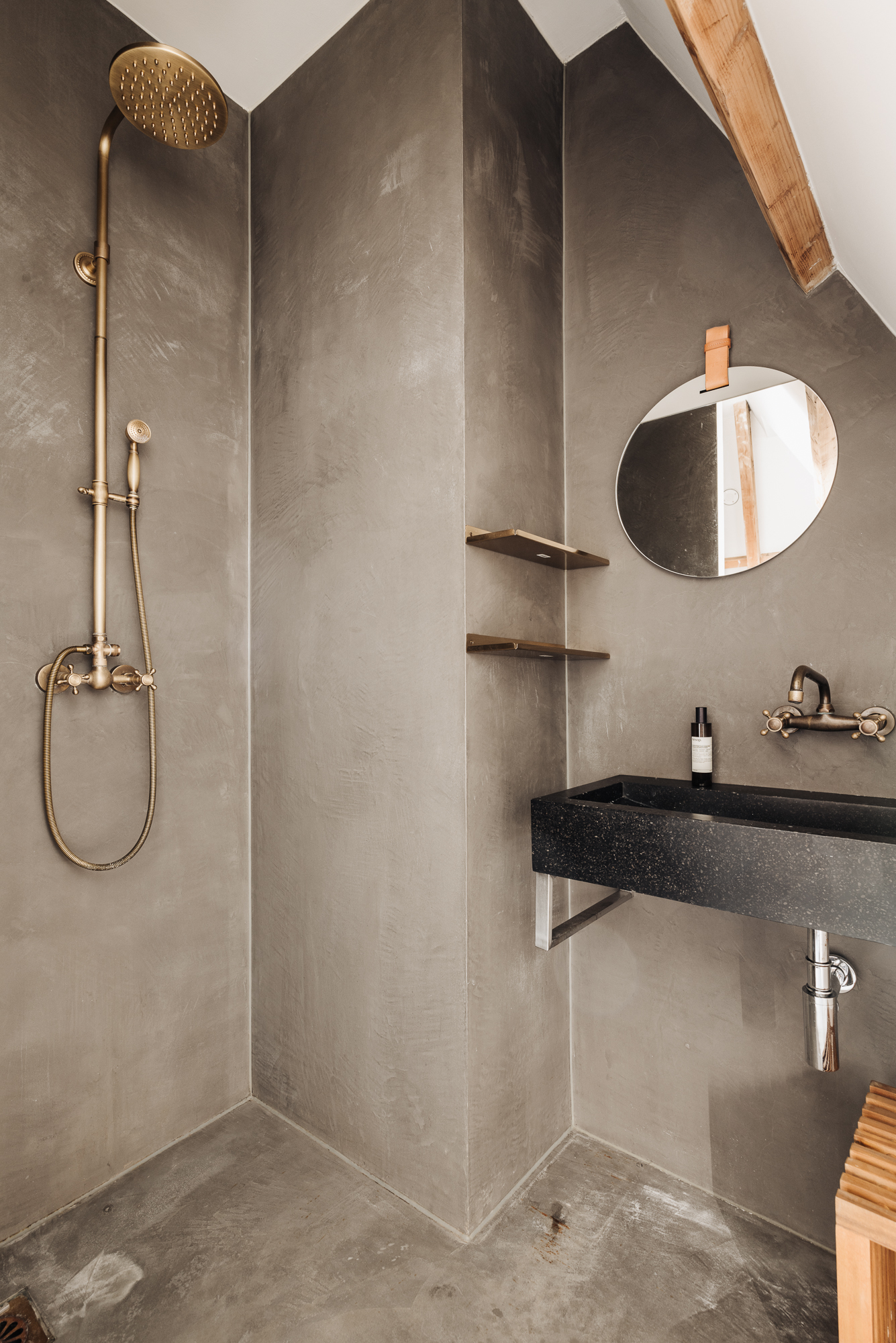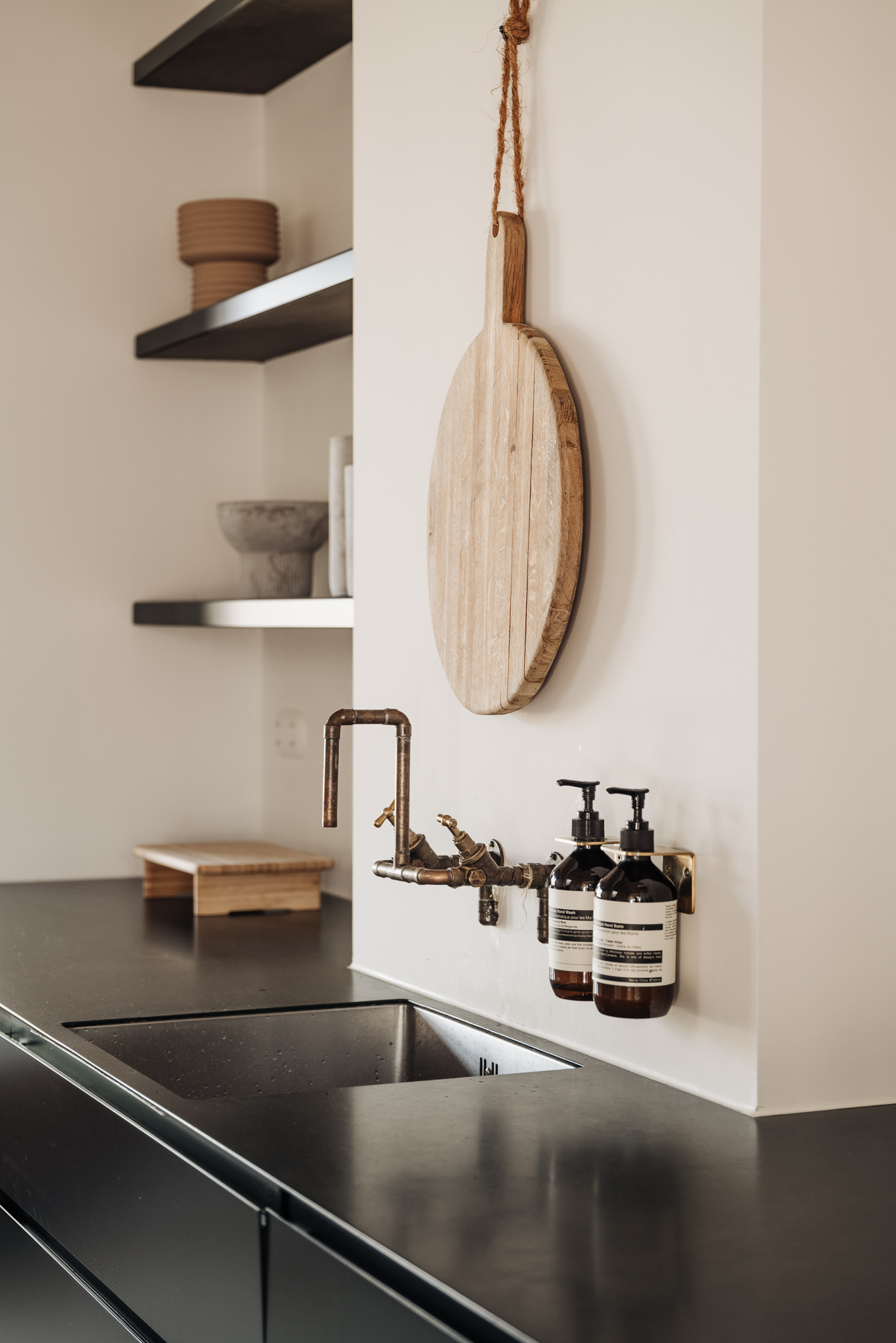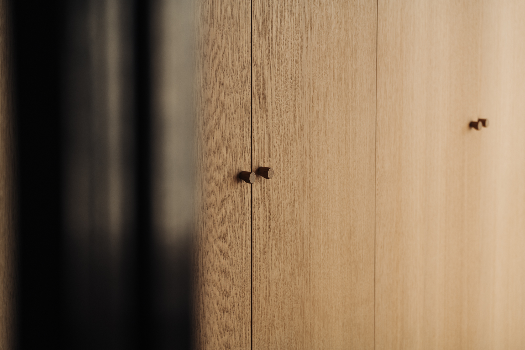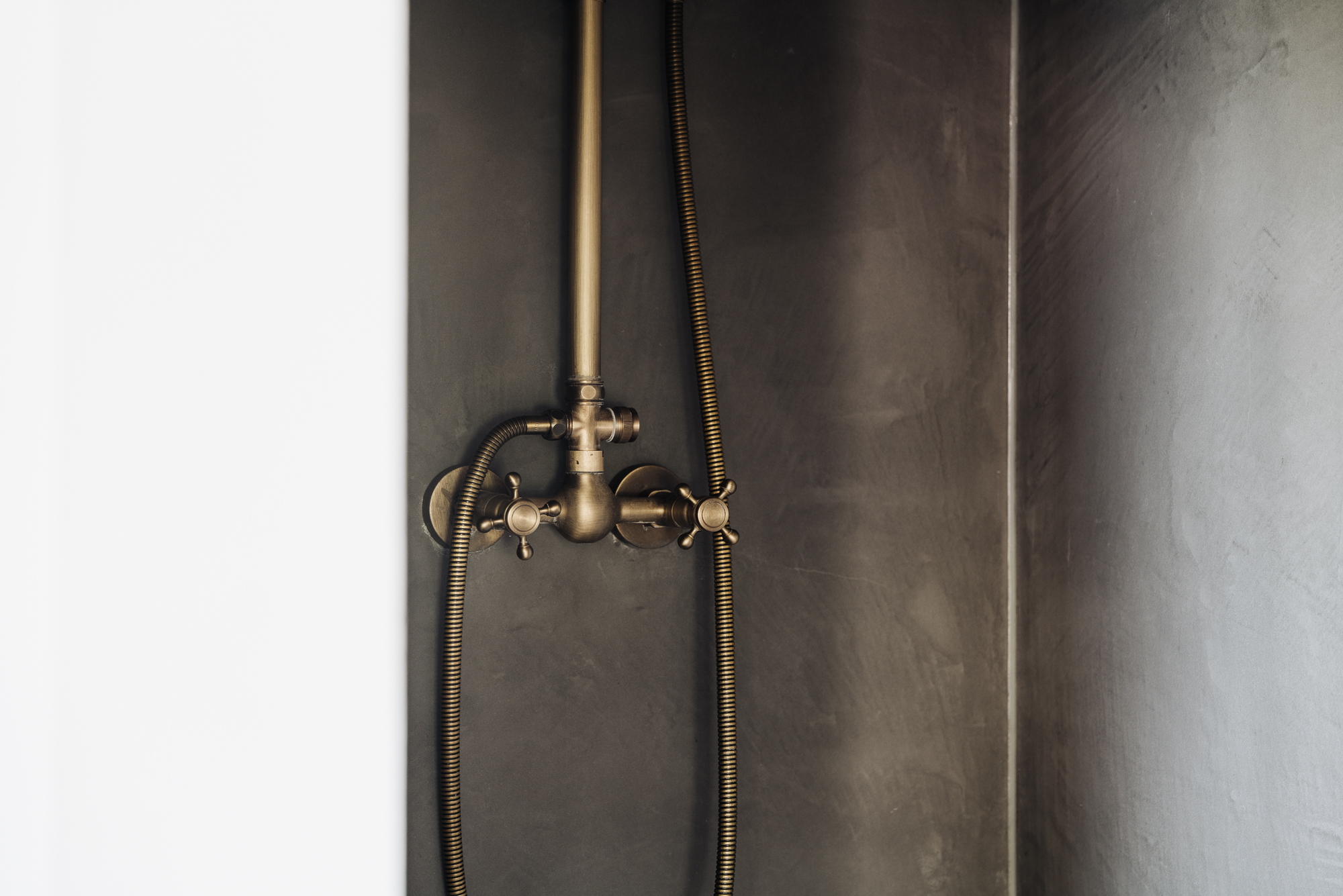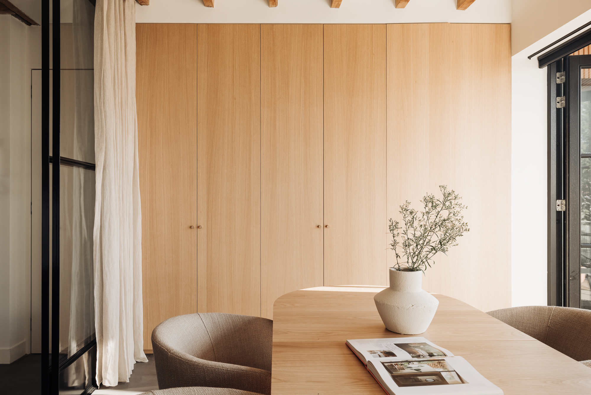 The dark forest green open kitchen is equipped with various built-in appliances, including a SMEG gas stove with oven, dishwasher, and a special copper faucet with vintage look. The dining area is reached through a steel sliding door that is largely made of glass, making both rooms flow seamlessly into each other. Furthermore, at the rear there is ample natural light as well, because of two French doors that give access to the house-wide balcony of 8 m2. Also, the dining room boasts a large, bespoke built-in closet and air conditioning.