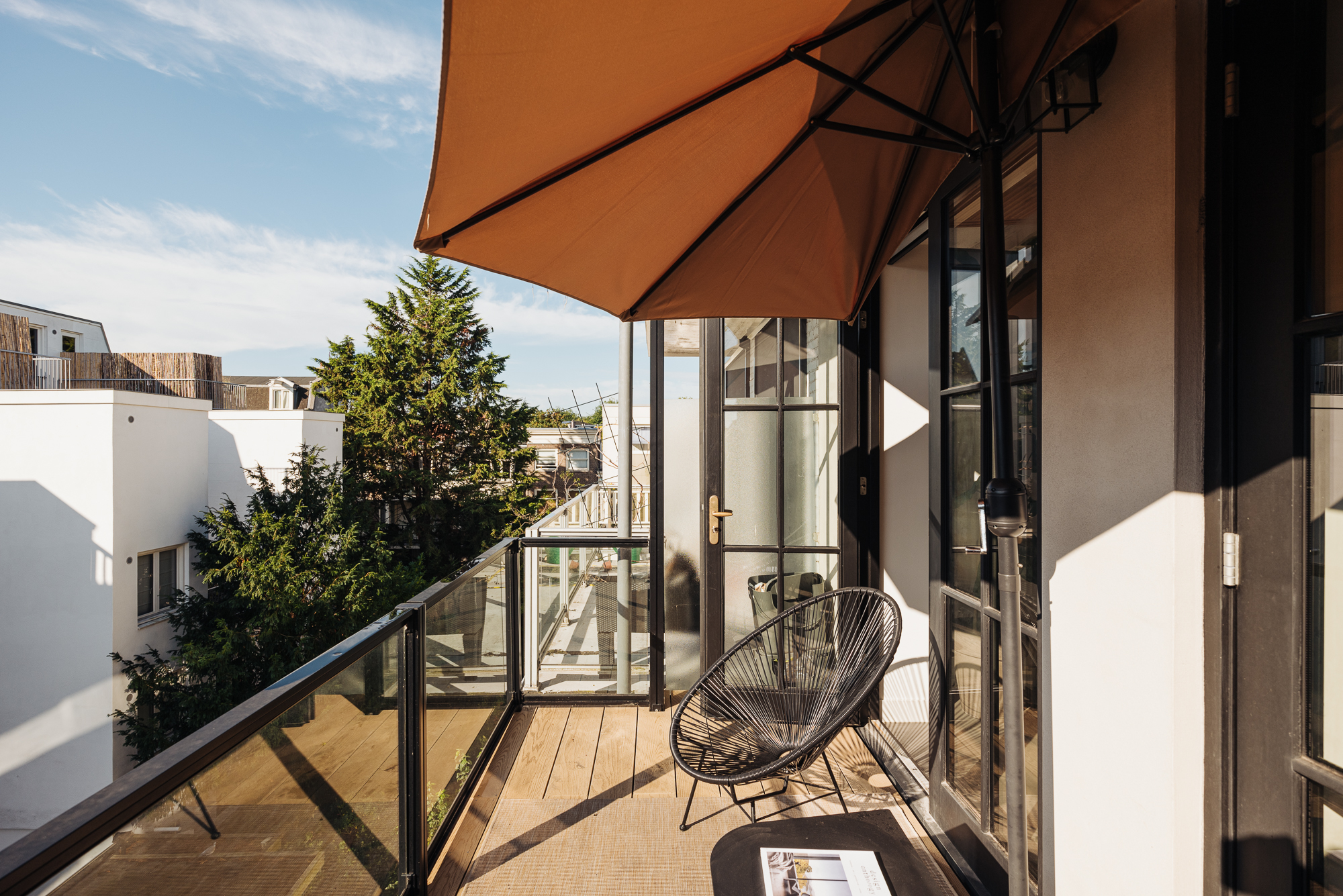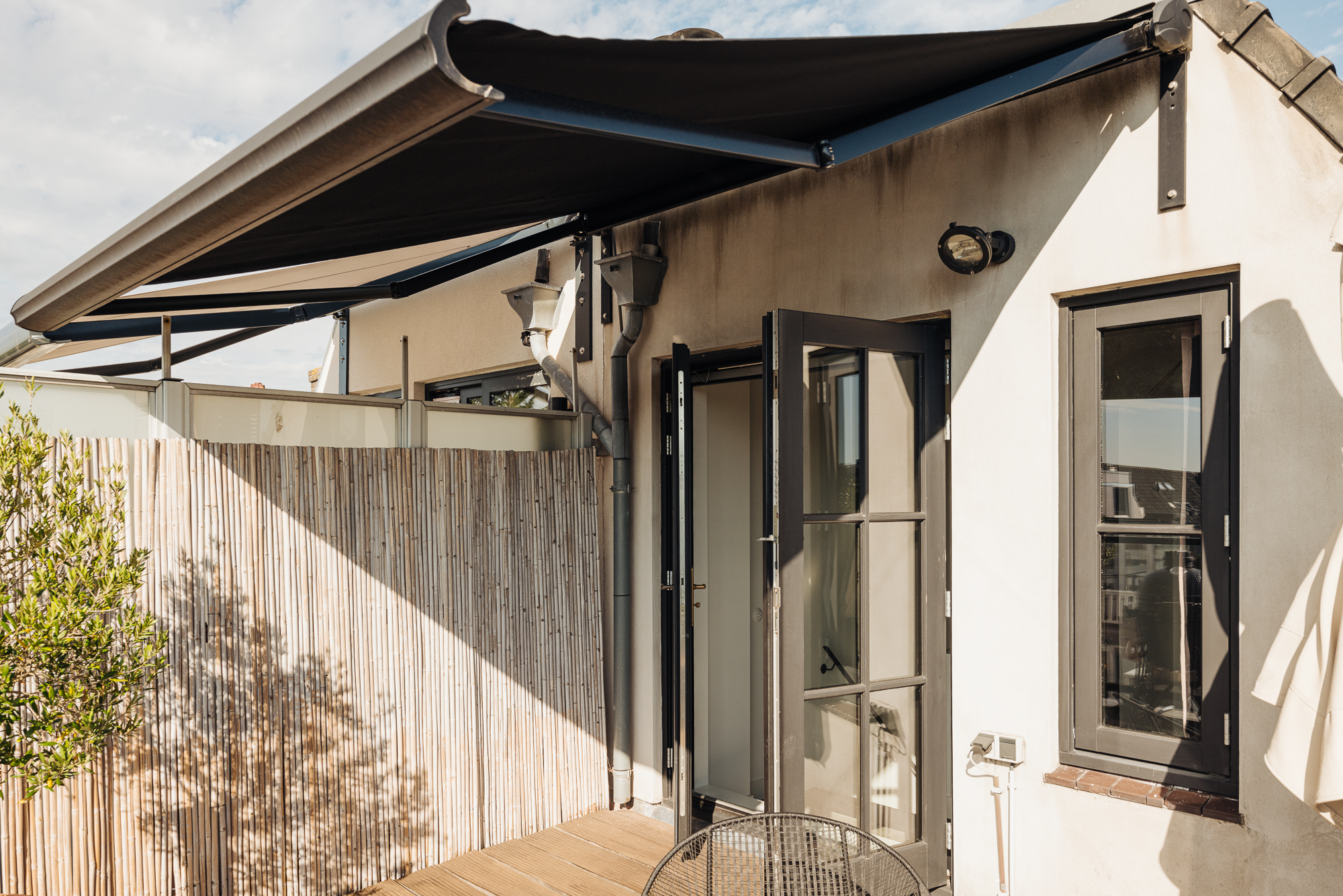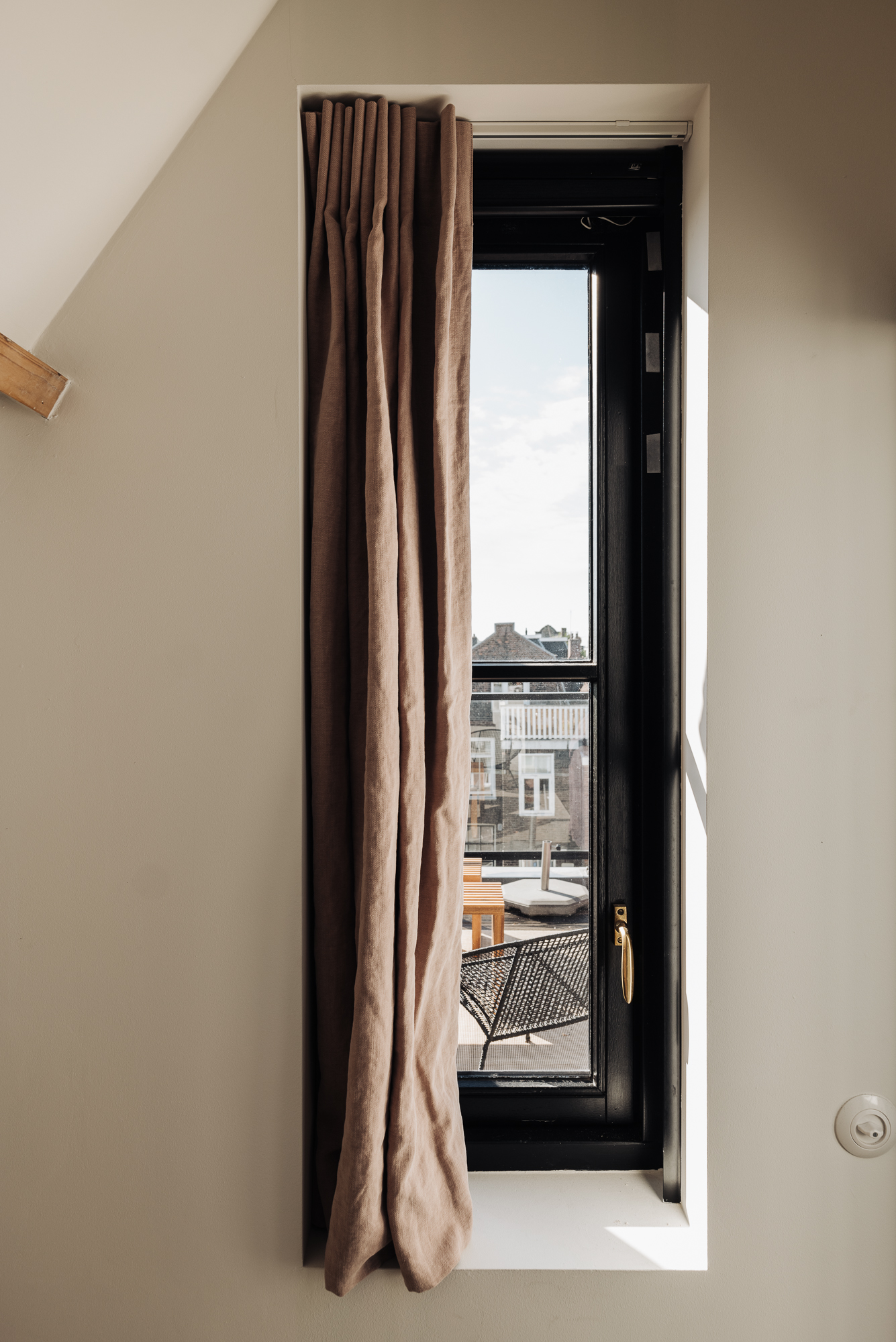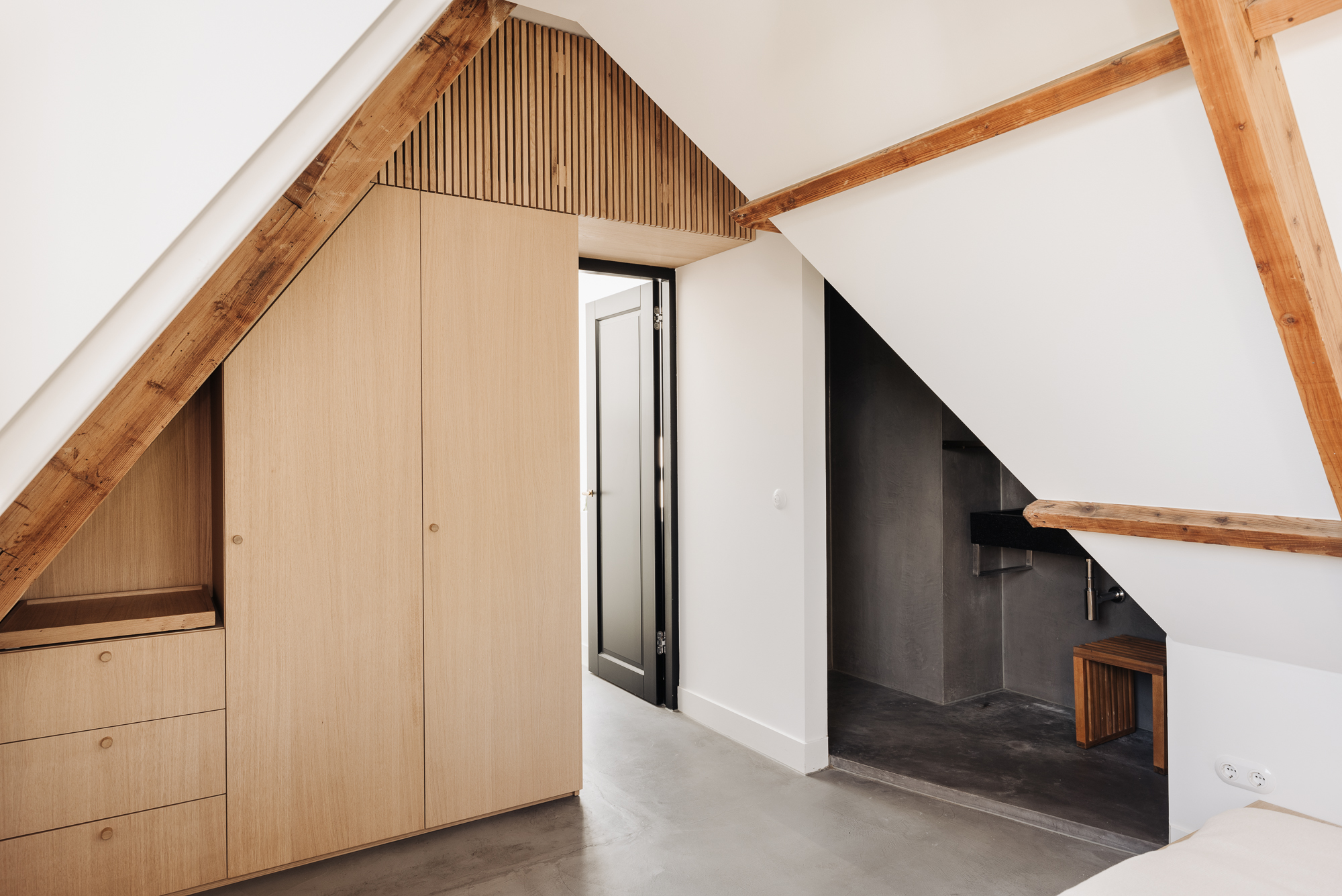 On the 4th and top floor (with air conditioning), the master bedroom with en-suite bathroom are located at the front. Here too, the necessary storage space is created by means of a custom-built closet (also under the bed). At the rear, a second (bed)room is located. The roof terrace of approximately 19 m² – facing southeast – is accessible through French doors. The roof terrace offers an amazing view over the city.