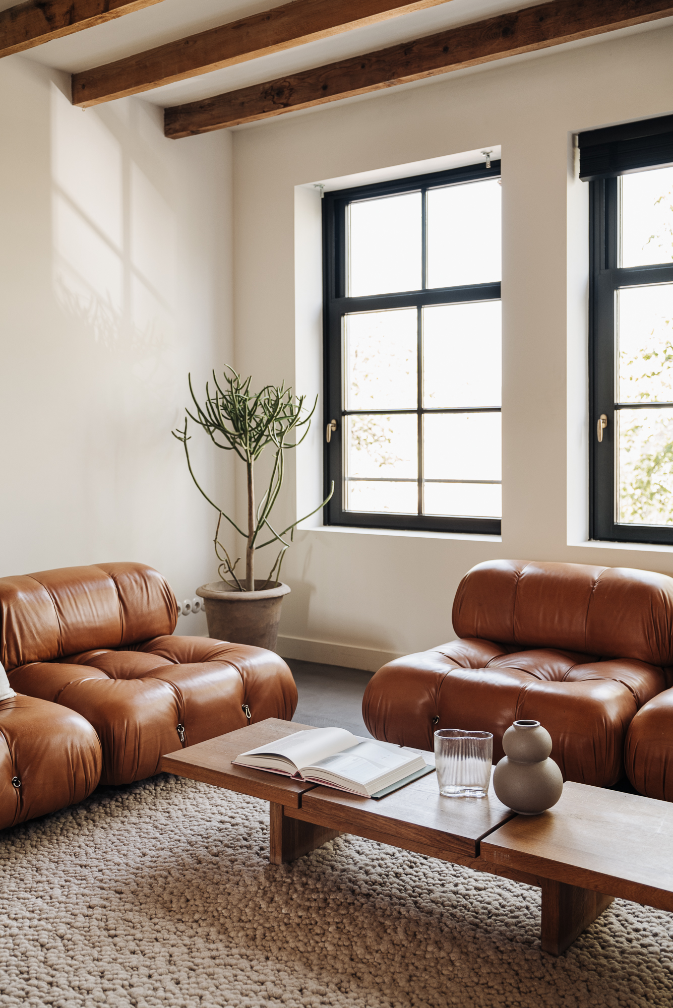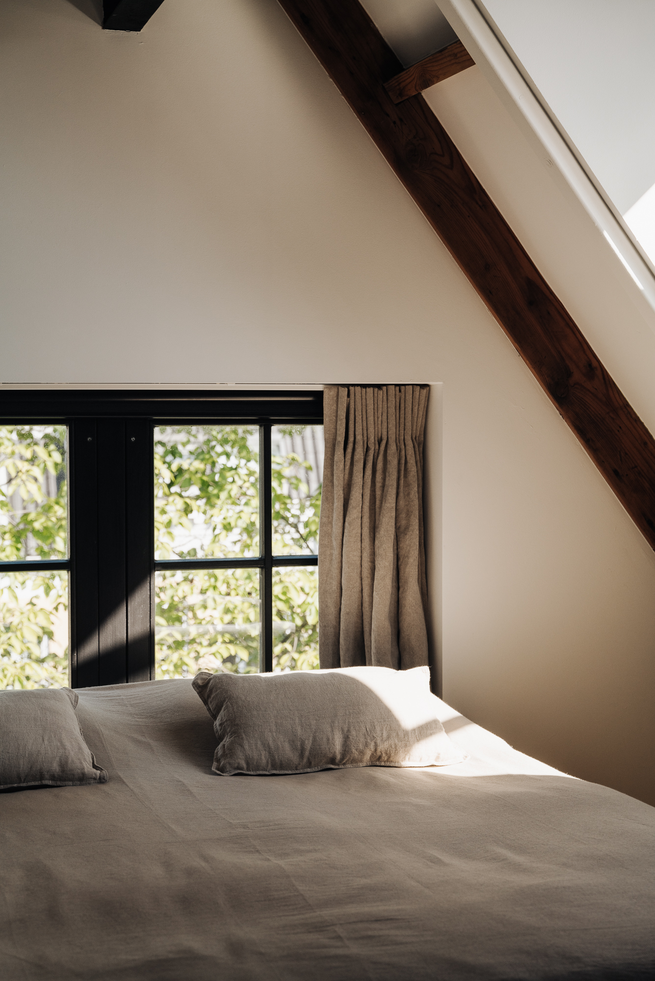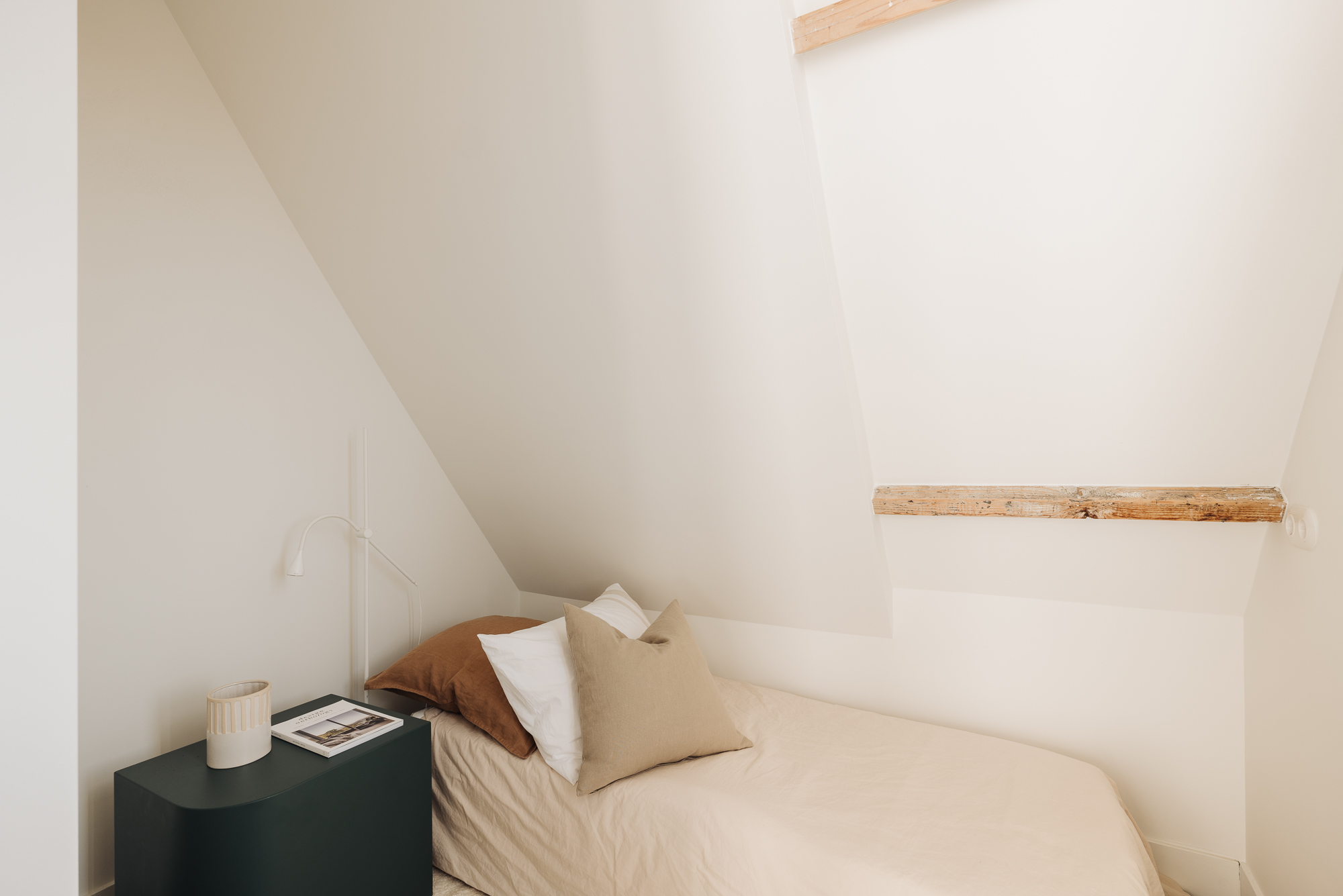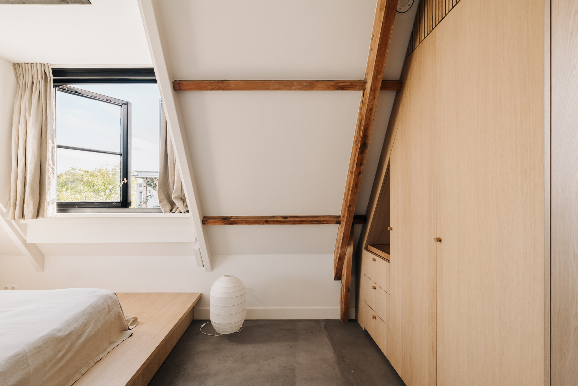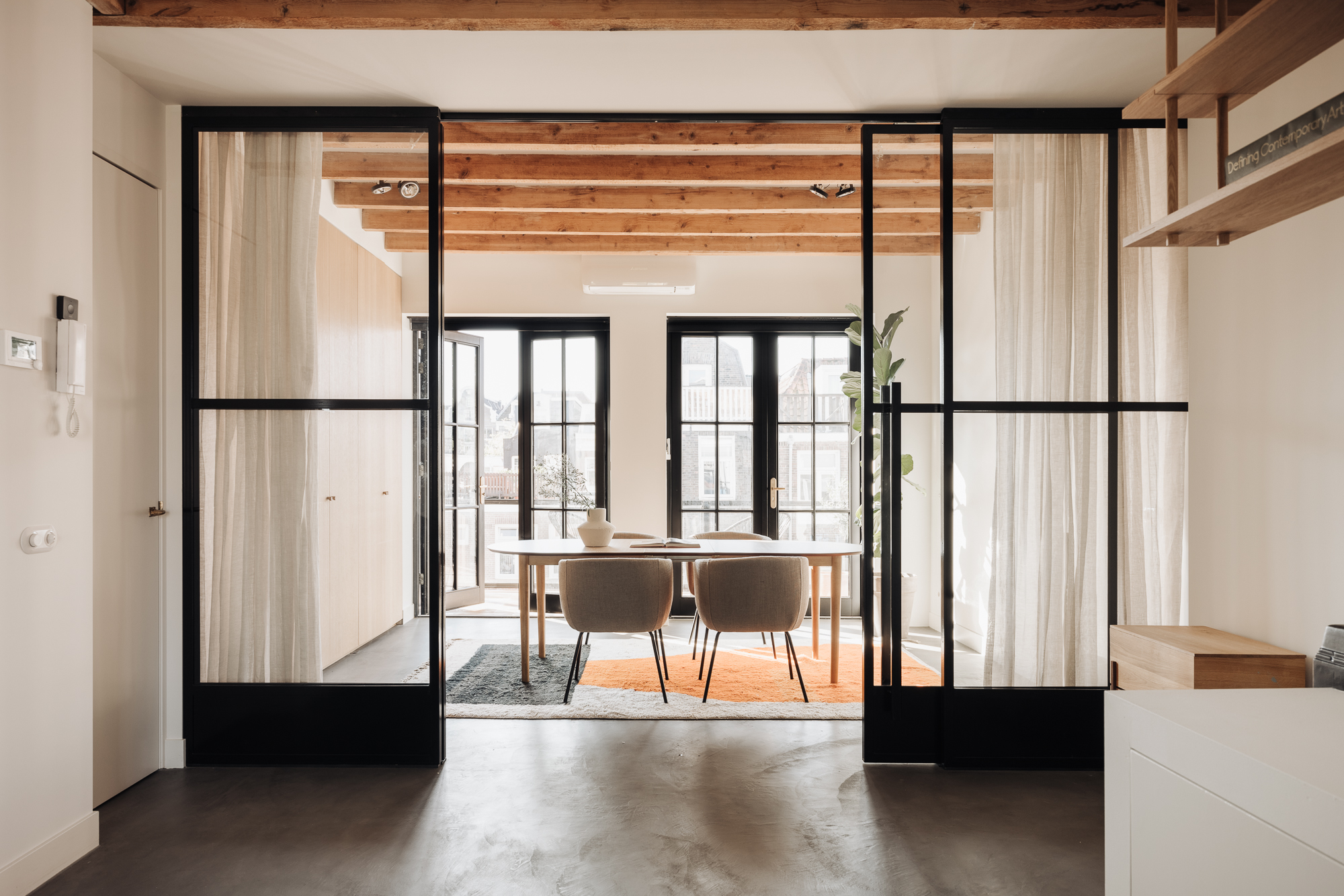 Upon entering the apartment on the 3rd floor, the peaceful atmosphere of the house is immediately noticeable. The beautiful cast floor, combined with high ceilings (2.70 meters) where the authentic wooden beams have been preserved, create a serene vibe. The three large windows at the front (living room with open-plan kitchen) provide plenty of natural light and at the same time offer a fantastic view over the canal.