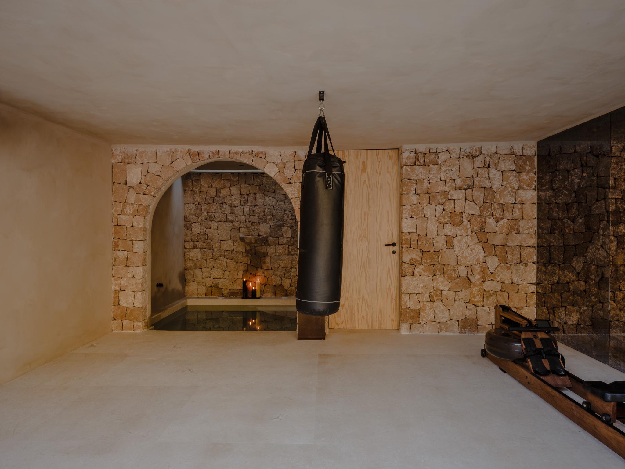 The sleeping quarters have all been styled with artisanal furnishings and rustic tones. The principal bedroom is a masterpiece in marble; its greyscale hue runs effortlessly from between the sleeping area to the dressing space and ensuite bathroom, where it wraps around an indulgent bathtub. A private terrace awaits outside, ideal for peaceful morning coffees. Four further bedrooms are soothing spots with sleek ensuite. Outside, the garden house is set for honeymooners or guests wanting more privacy. Gaze out to the sunny grounds through its floor-to-ceiling windows.