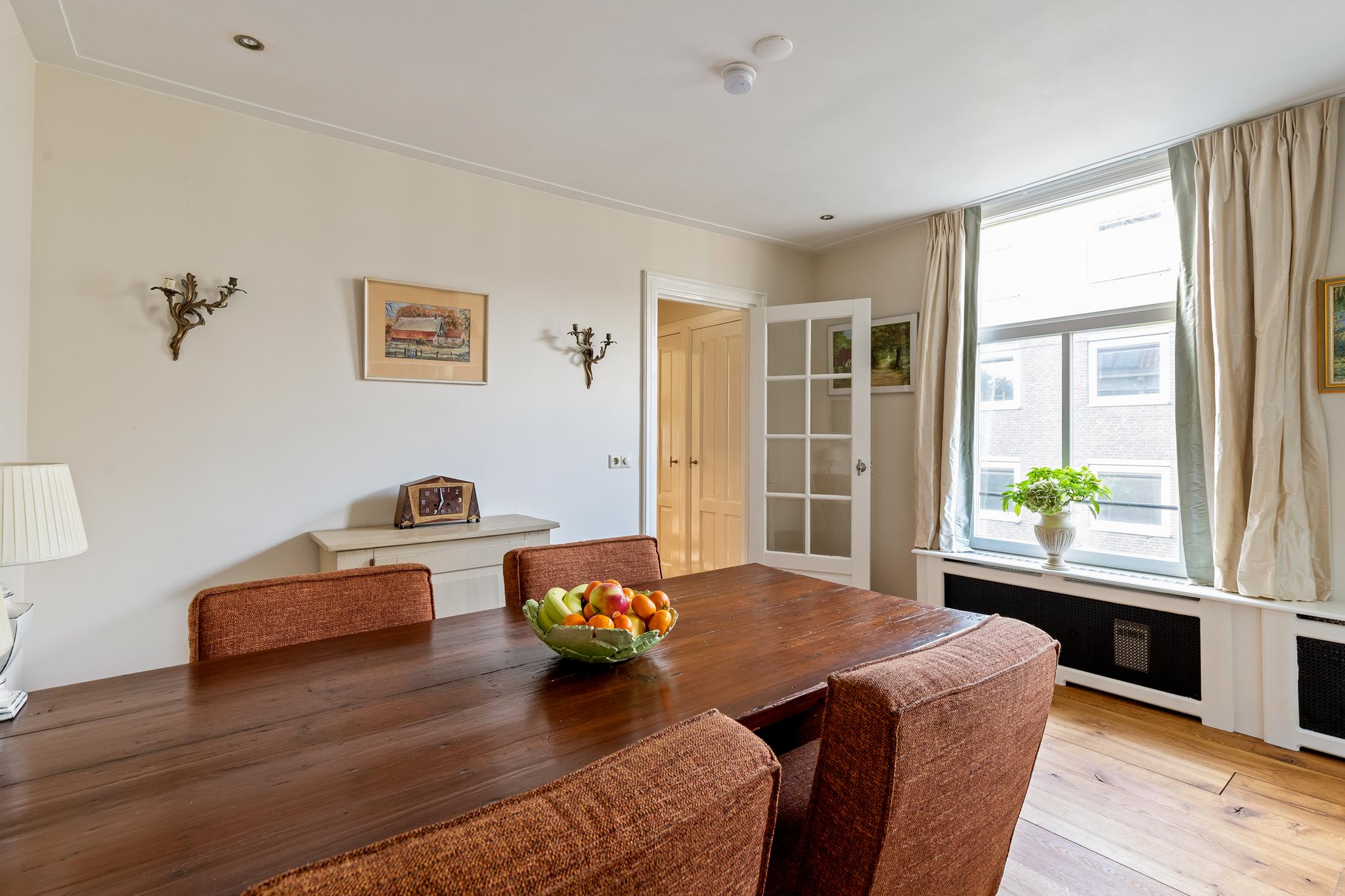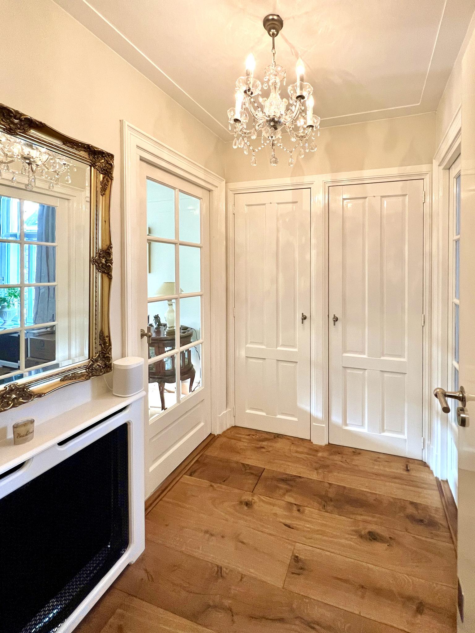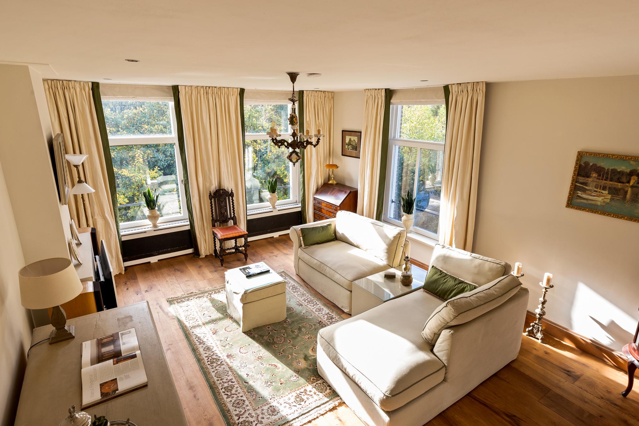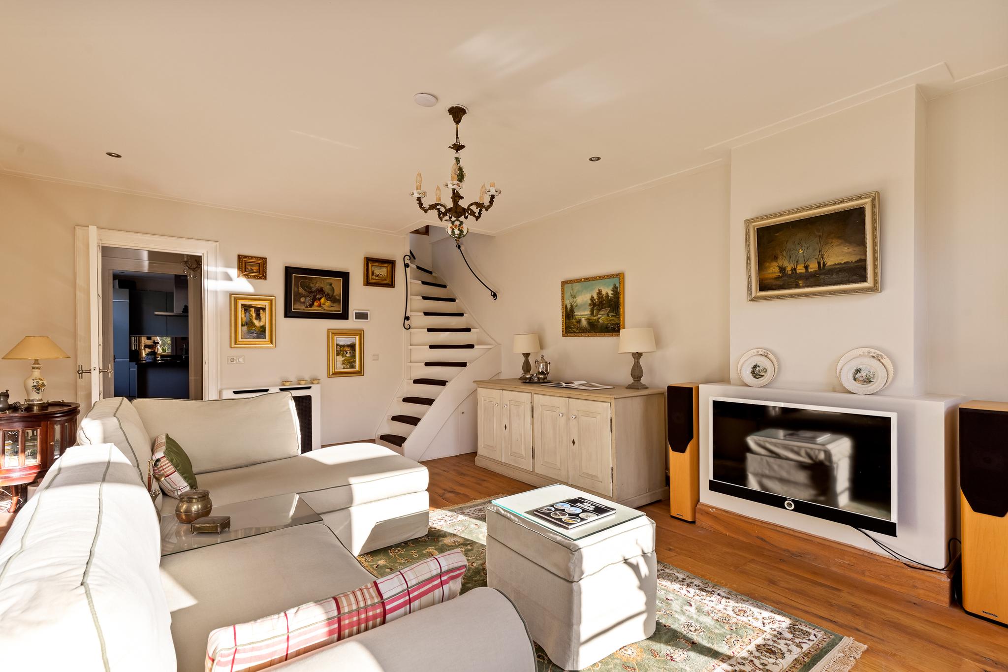 On the left side of the hall the bright living room is visible right away. Because of its corner location, the house has an unique amount of windows with a phenomenal view of the Vondelpark. Due to the large and low casement windows the outdoor experience is very good and also offers a lot of privacy, no view from the park, you can only be seen by the storks living high in the park.