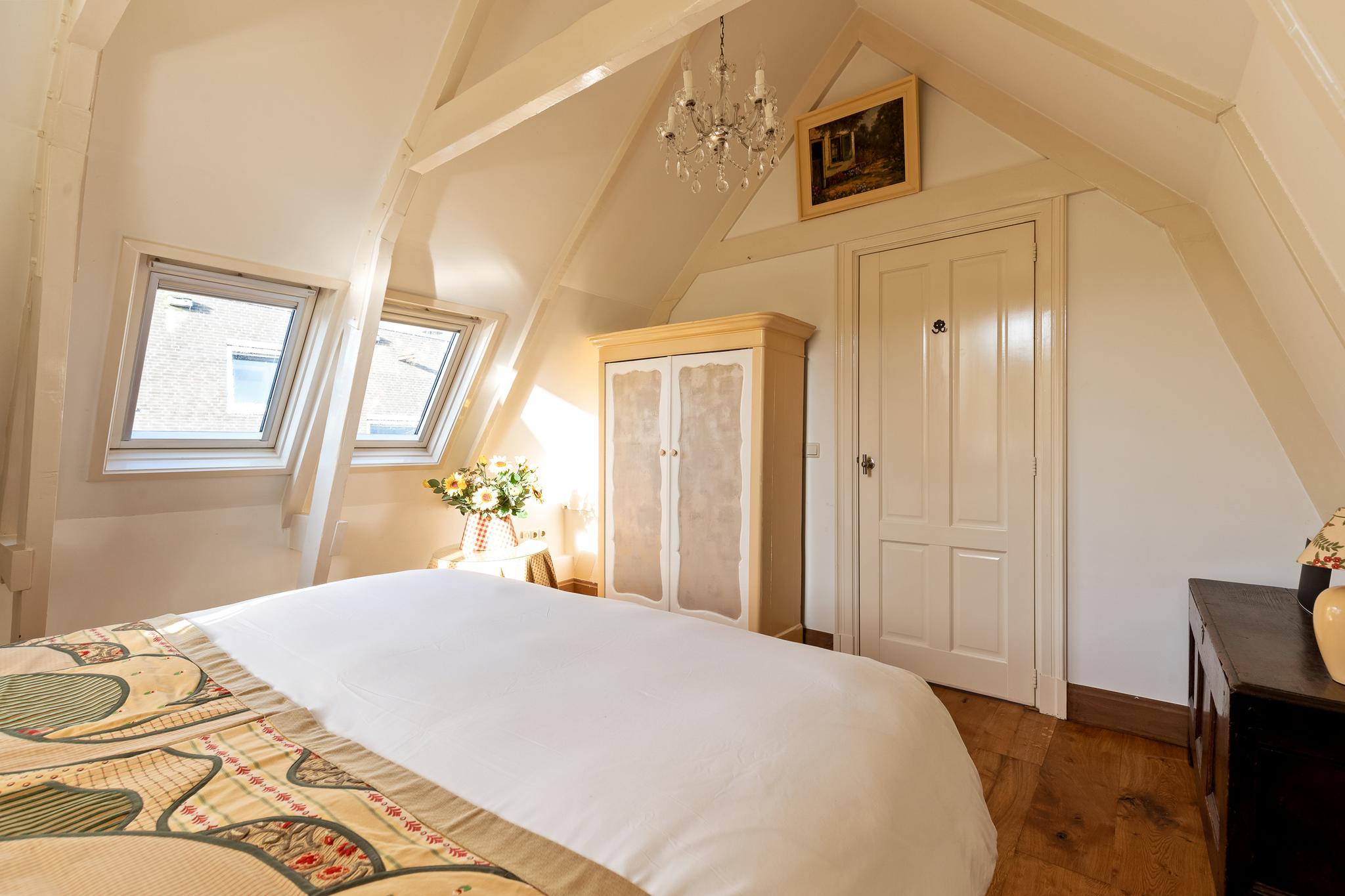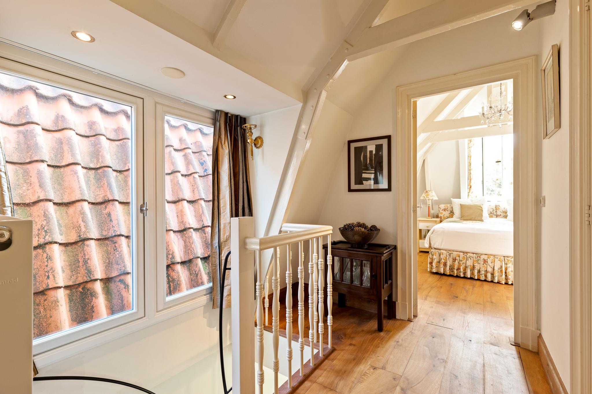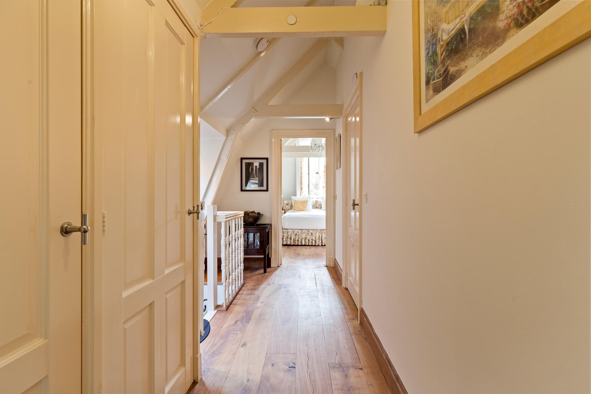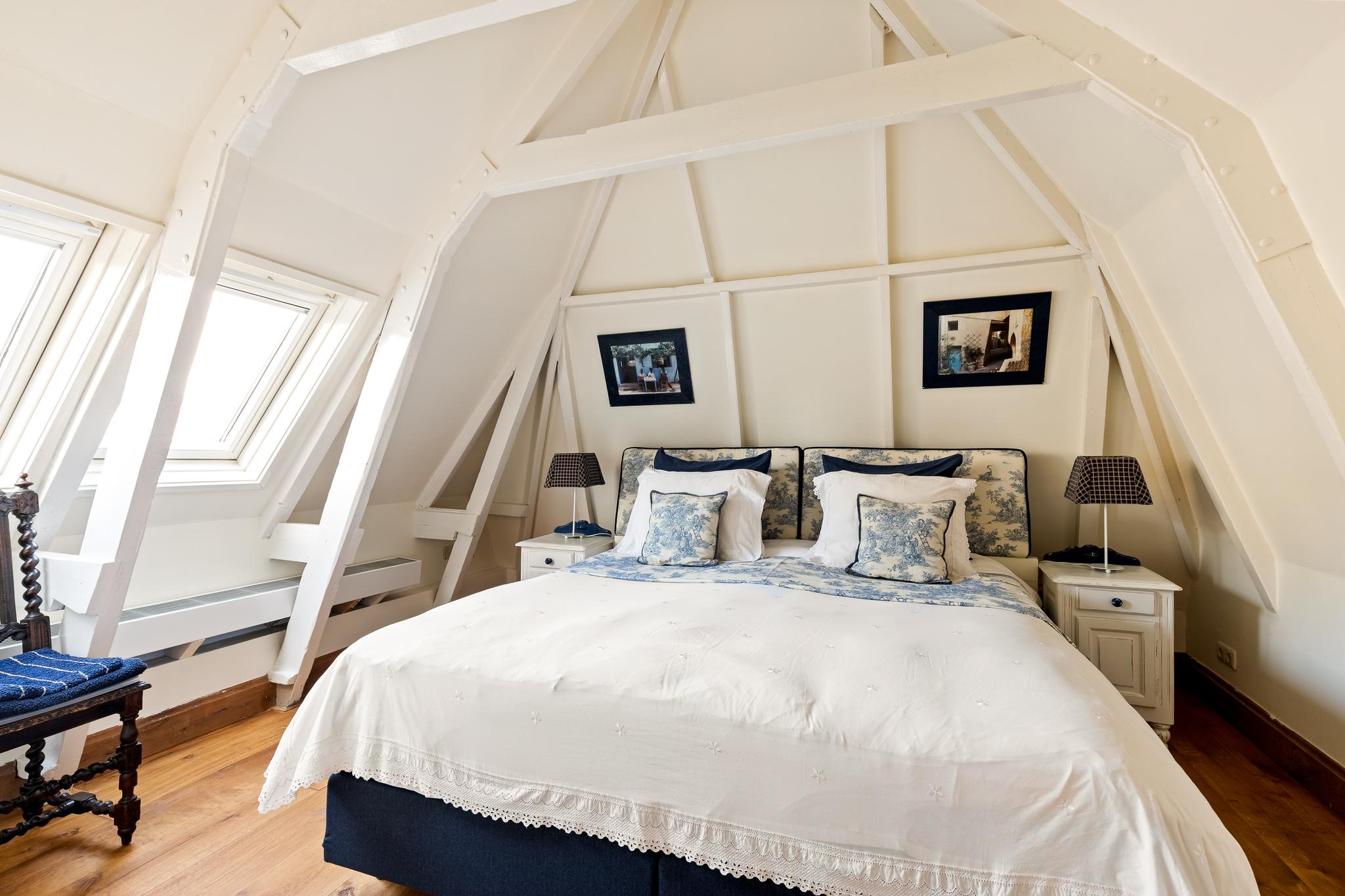 Via the internal staircase in the living room you can reach the top floor. The spacious hallway features a dormer window and provides access on either side to the two well-sized bedrooms. Both bedrooms have authentic beams and ridge heights up to 3.3 meters. One of the bedrooms has a custom made built-in closet.