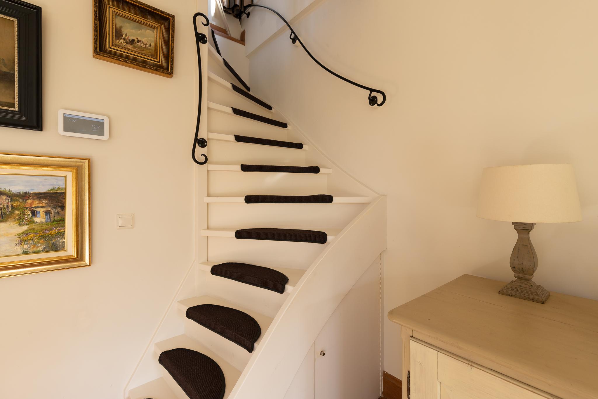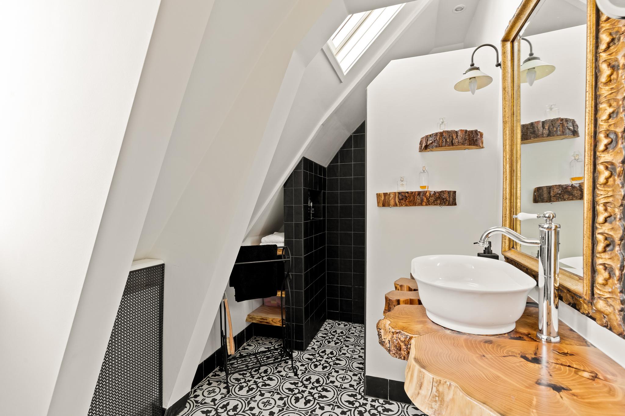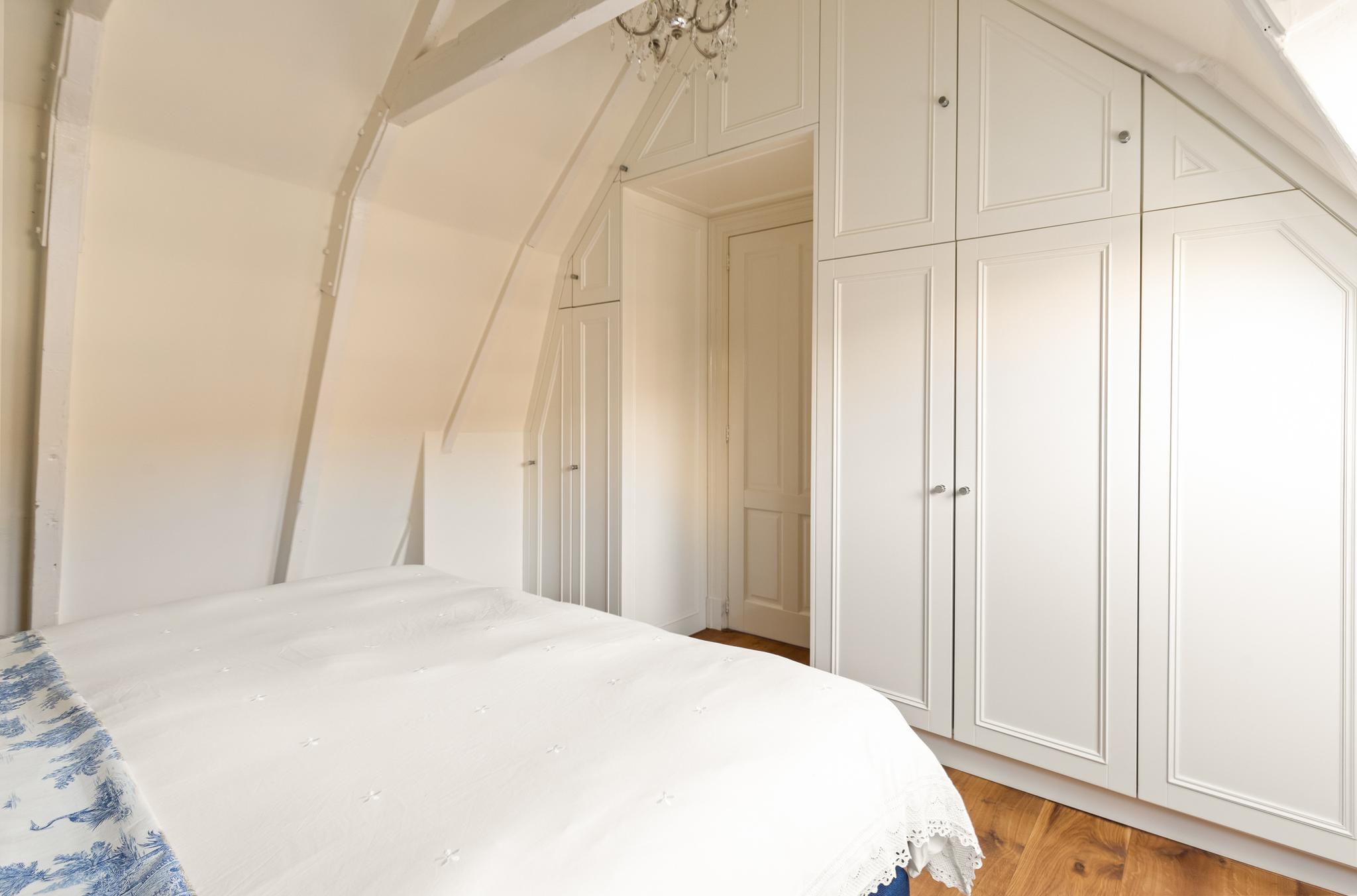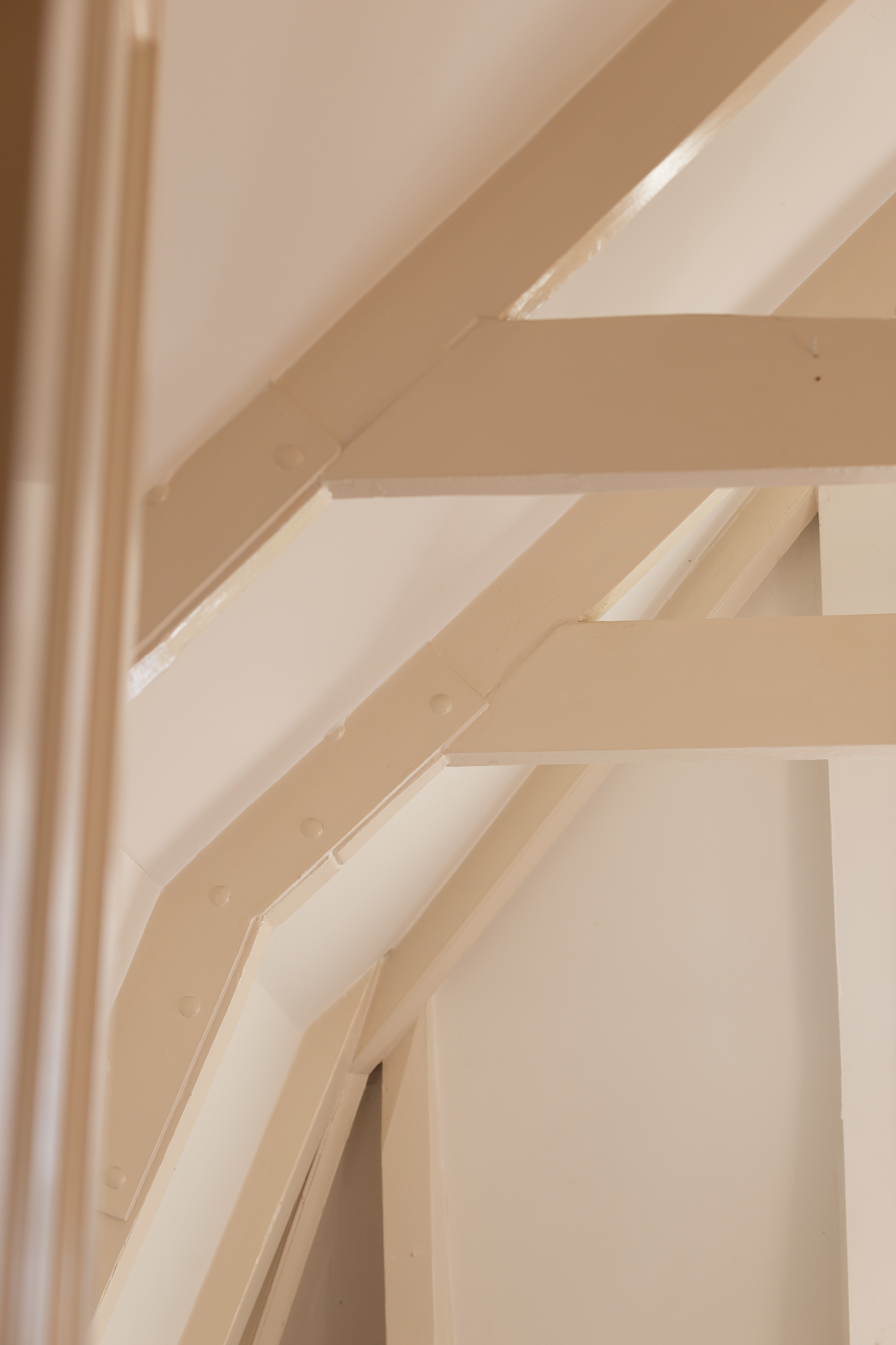 Via the internal staircase in the living room you can reach the top floor. The spacious hallway features a dormer window and provides access on either side to the two well-sized bedrooms. Both bedrooms have authentic beams and ridge heights up to 3.3 meters. One of the bedrooms has a custom made built-in closet.