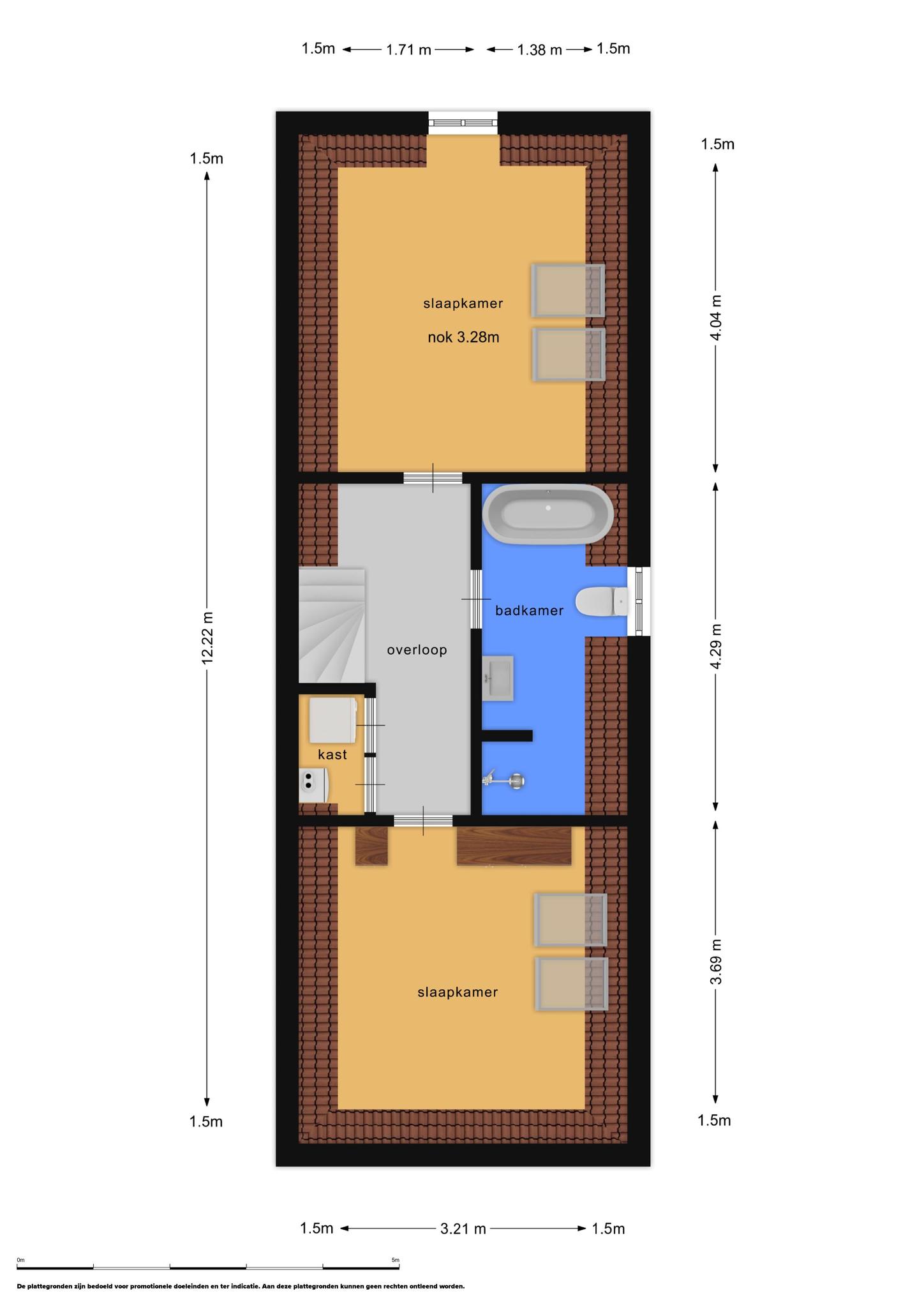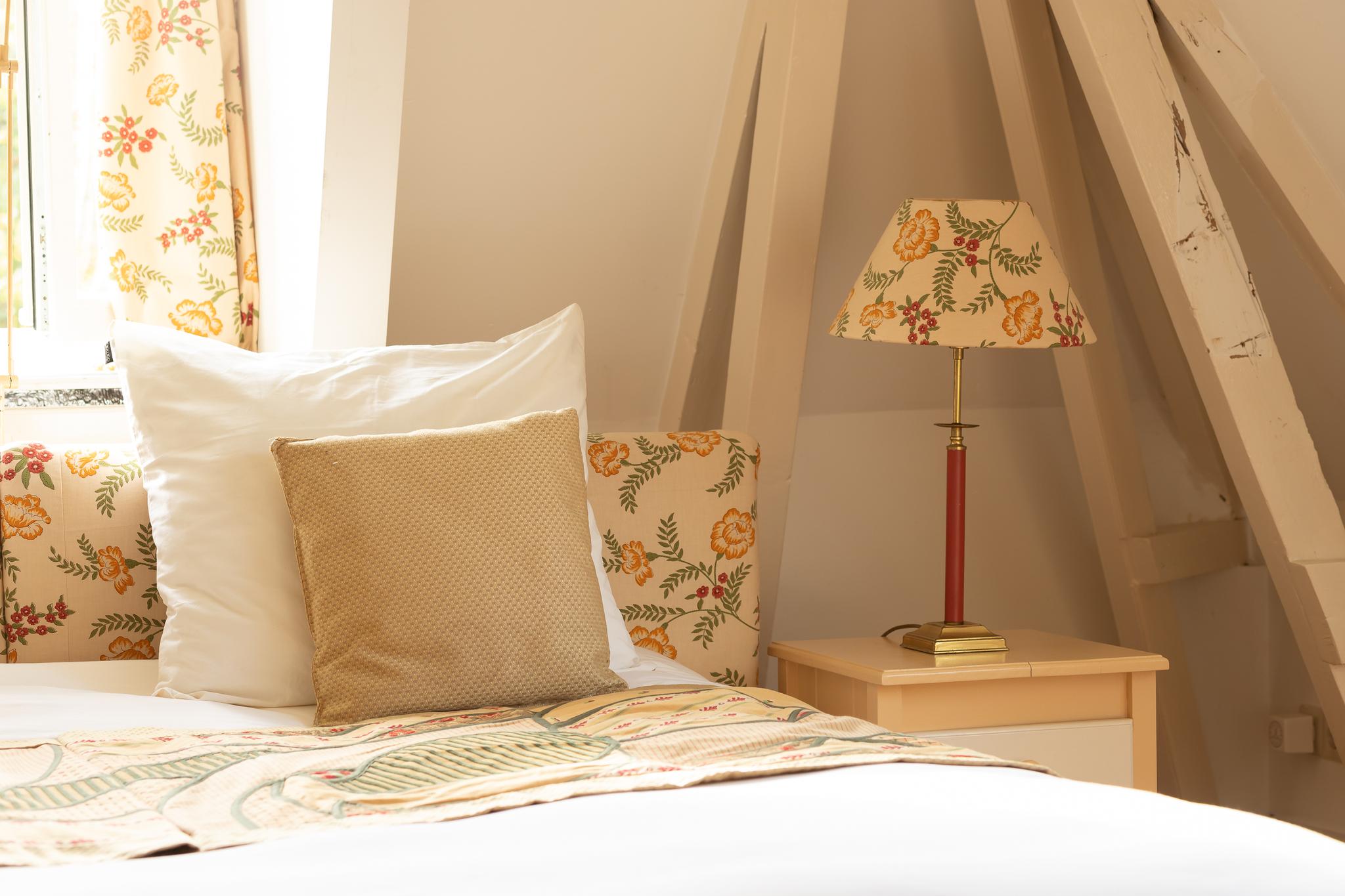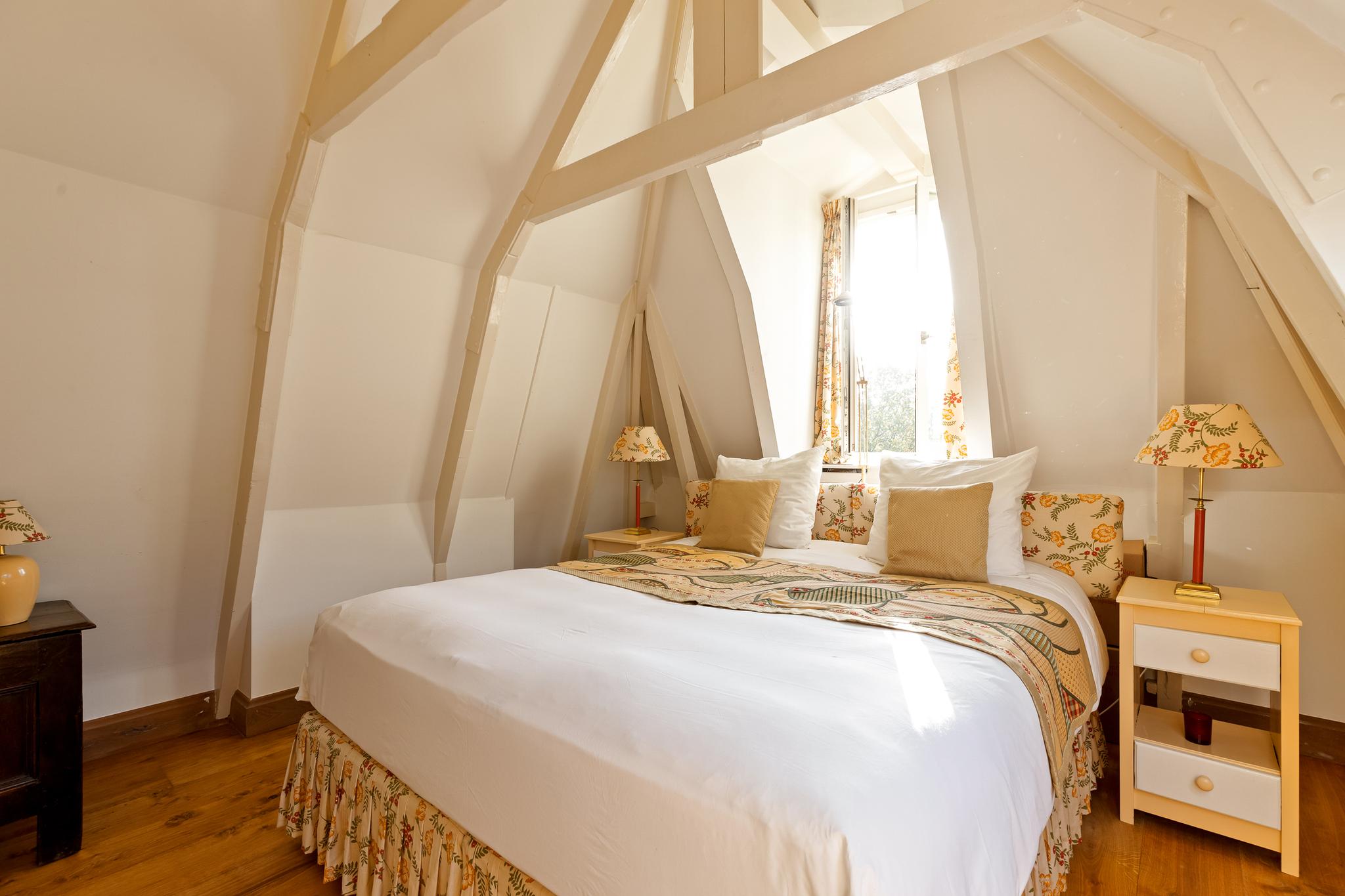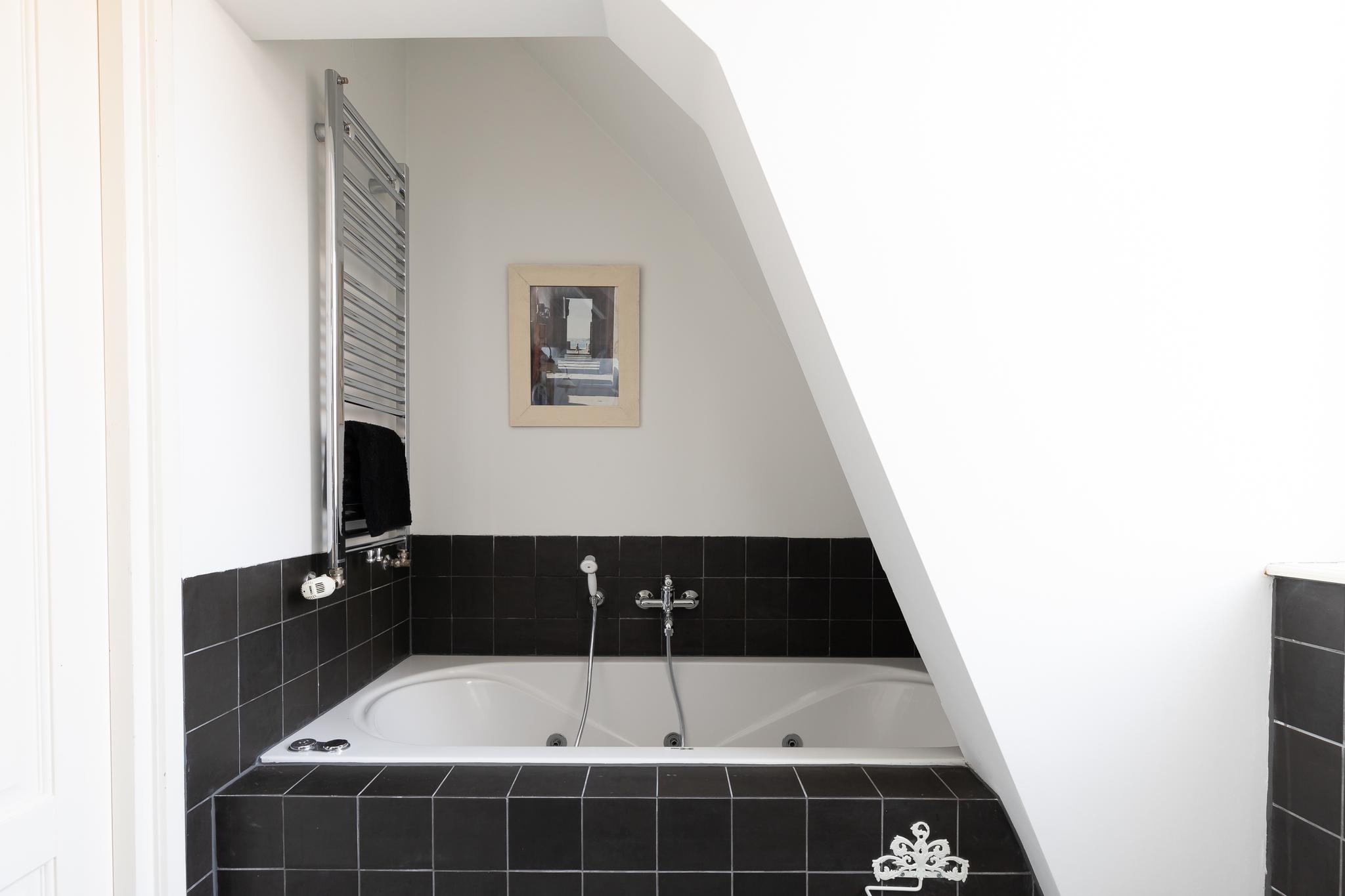 Via the internal staircase in the living room you can reach the top floor. The spacious hallway features a dormer window and provides access on either side to the two well-sized bedrooms. Both bedrooms have authentic beams and ridge heights up to 3.3 meters. One of the bedrooms has a custom made built-in closet.