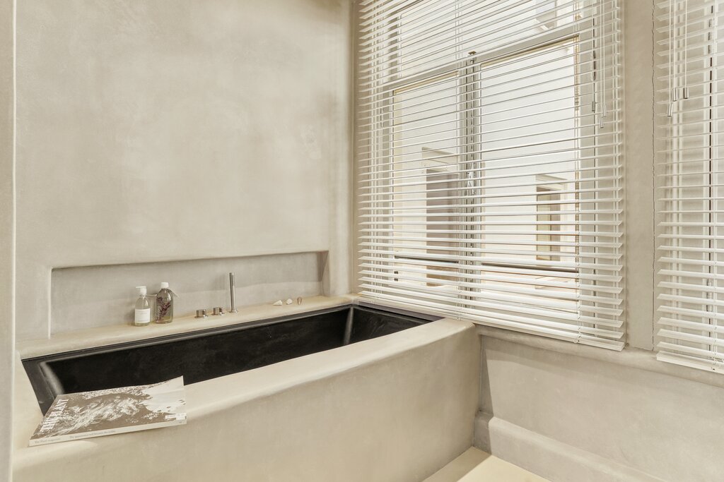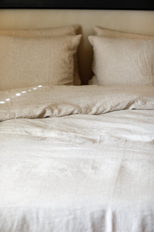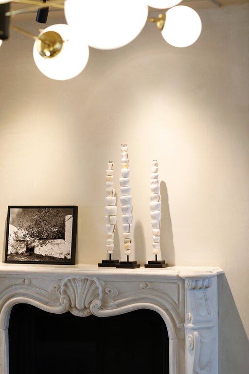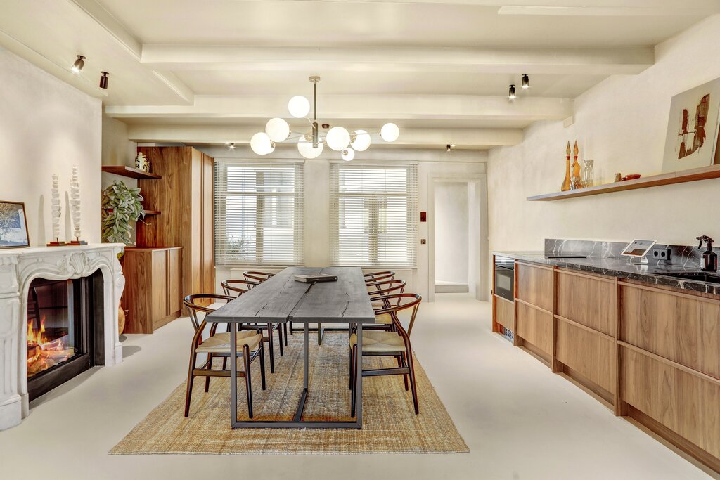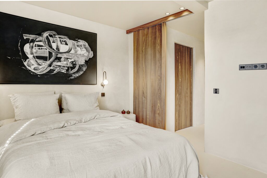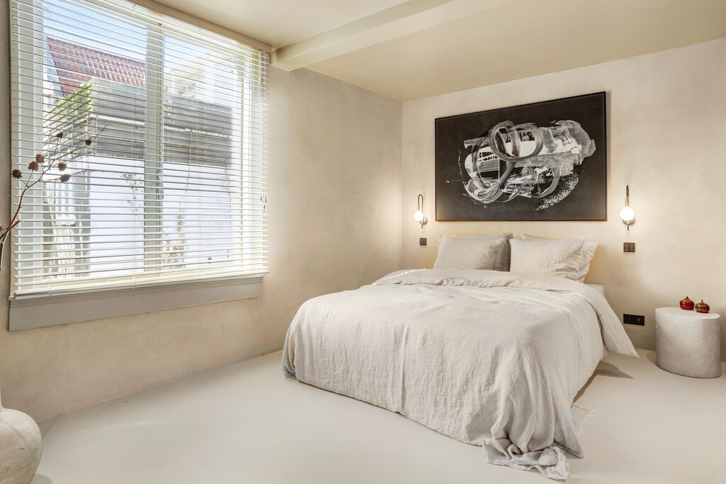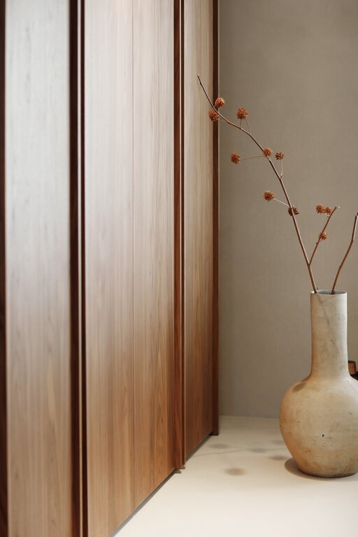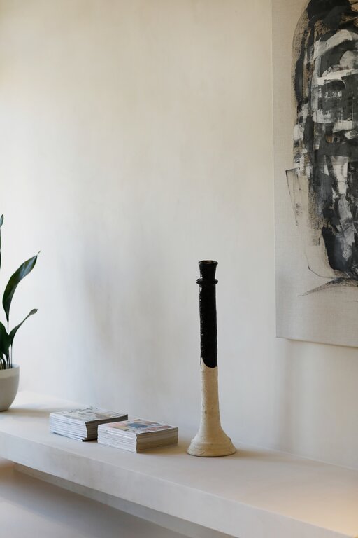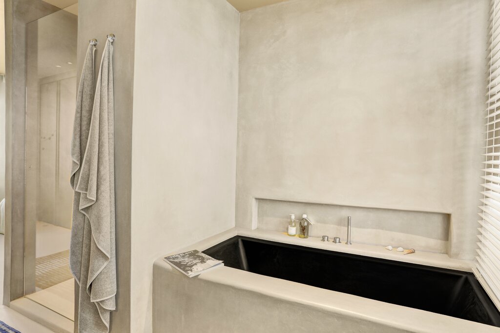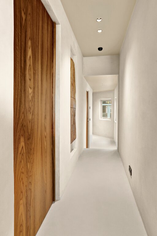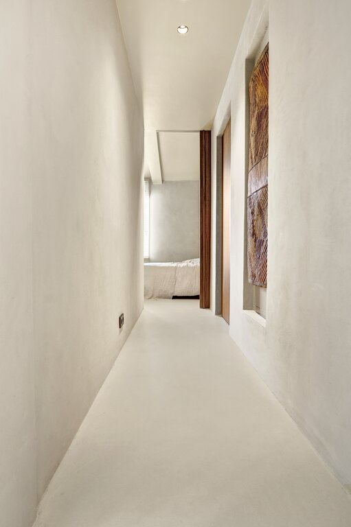 Natural lime, an ancient raw material, is used on the floors, walls and ceilings to create a warm canvas throughout the entire apartment.