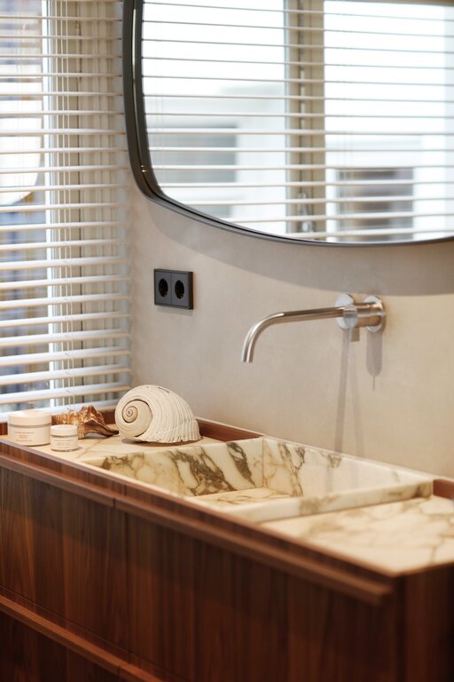 -Tailor made interior (walnut kitchen with Noir Saint Laurent marble, walnut bathroom cabinets with Calacatta Oro marble sinks).