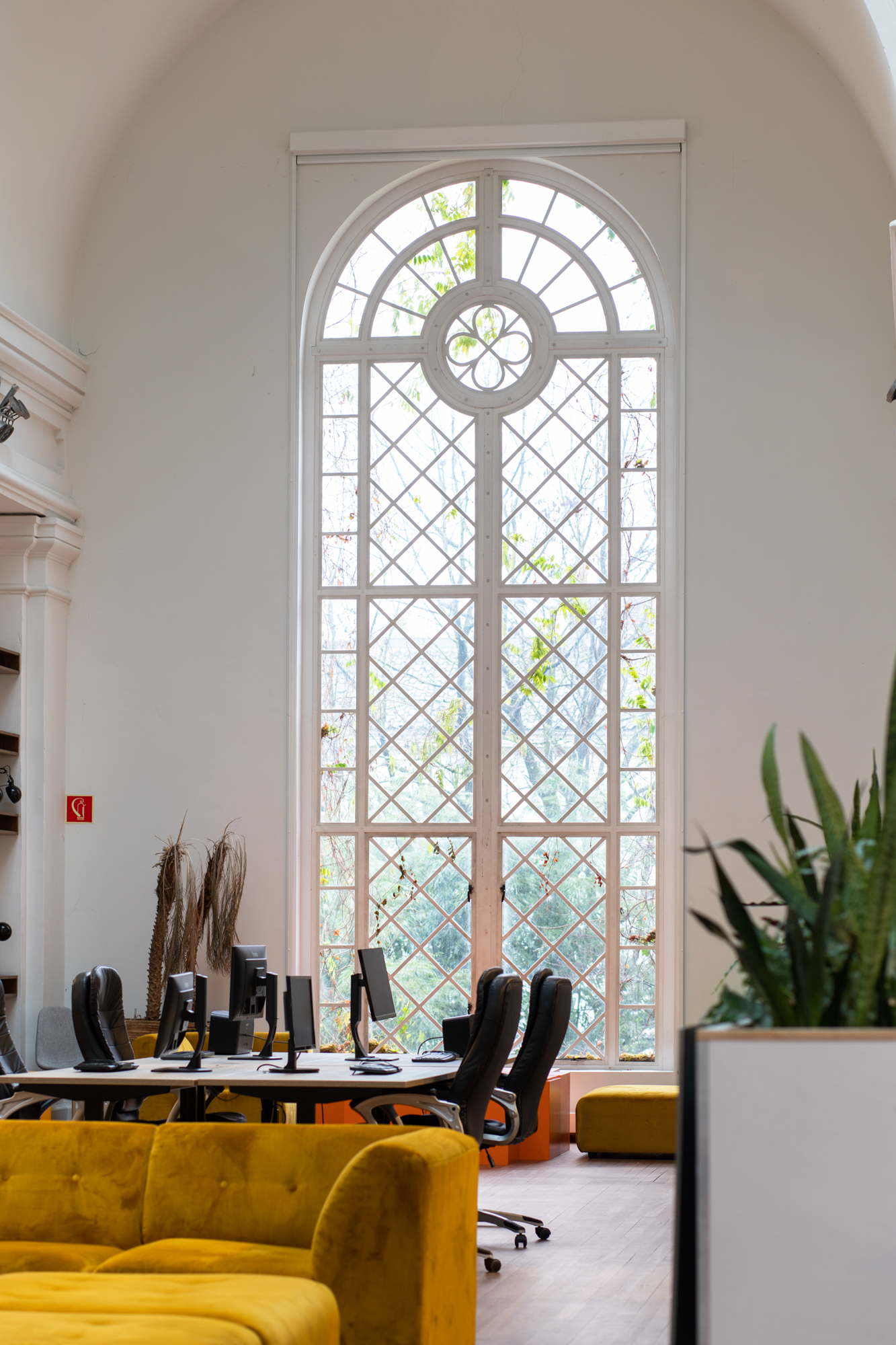 On the second and very impressive floor with an ecclesiastical ceiling height, the large authentic windows on both the front and the rear are immediately visible. These in combination with the ornaments clearly show the architectural style and old character of the church.