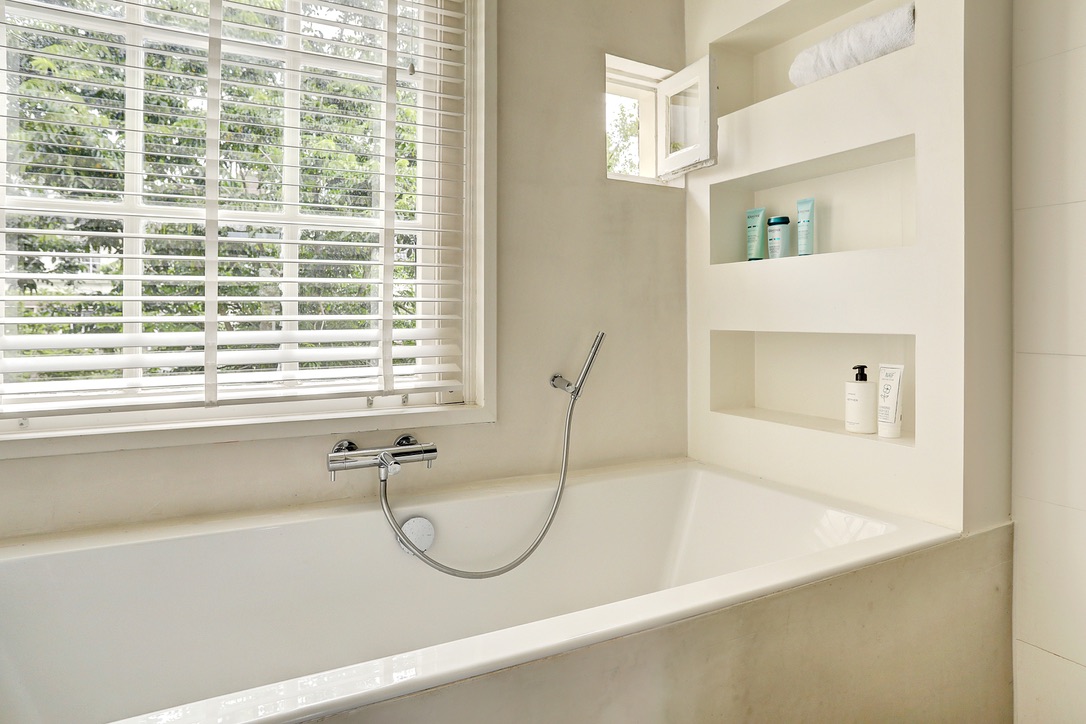 Master bedroom with double glazing and luxury en-suite bathroom, which is equipped with a double sink with cabinet, bathtub, walk-in shower and a toilet.