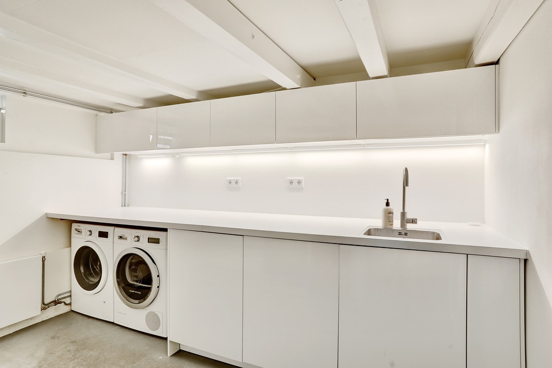 The stately entrance with double entrance door gives access to the dining room with modern open kitchen. The kitchen with island is equipped with all necessary built-in appliances by the brands Liebherr and Bosch. At the rear there is direct access to a lovely backyard of approximately 36 m2. This floor also has a separate toilet.
