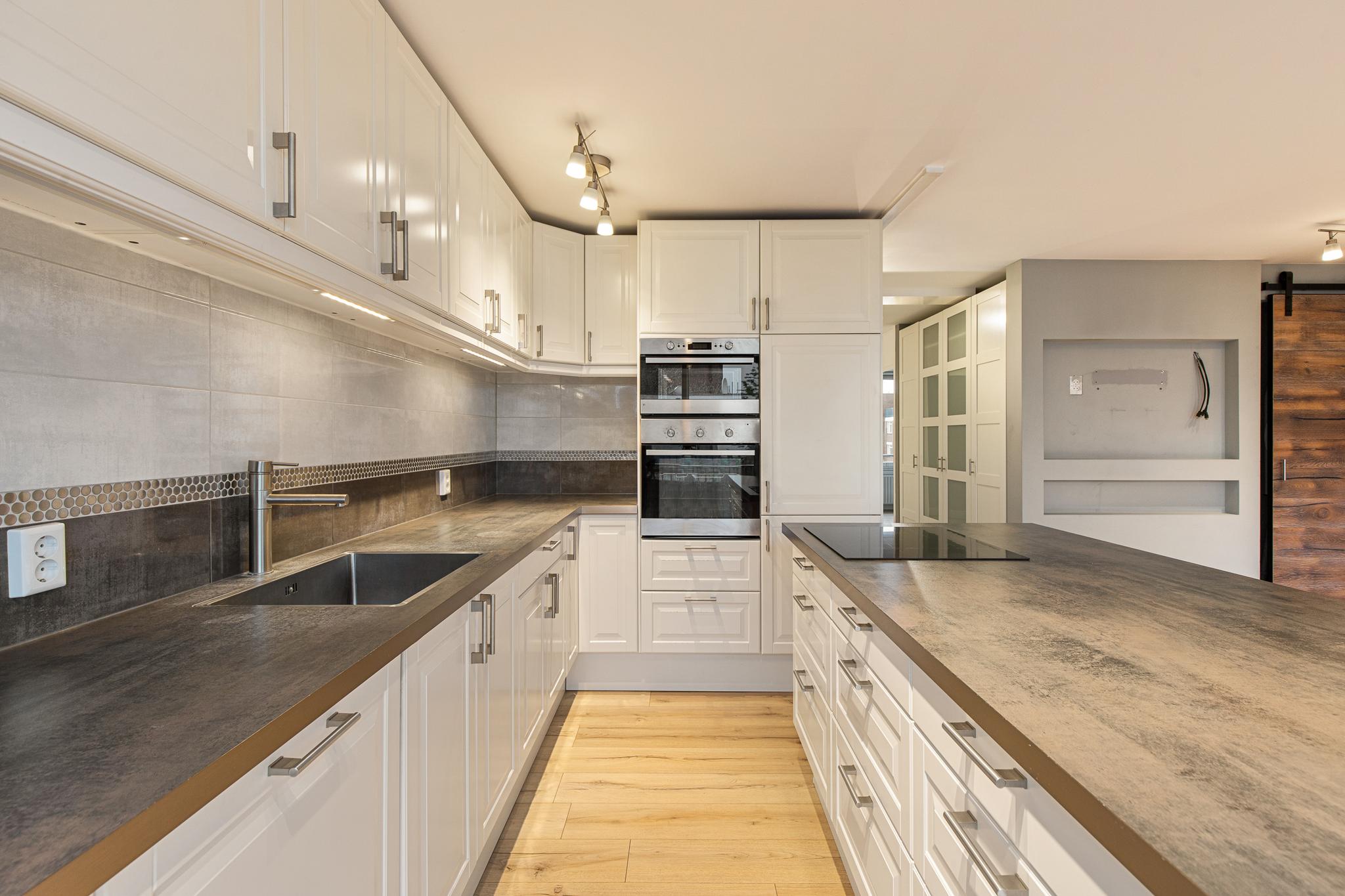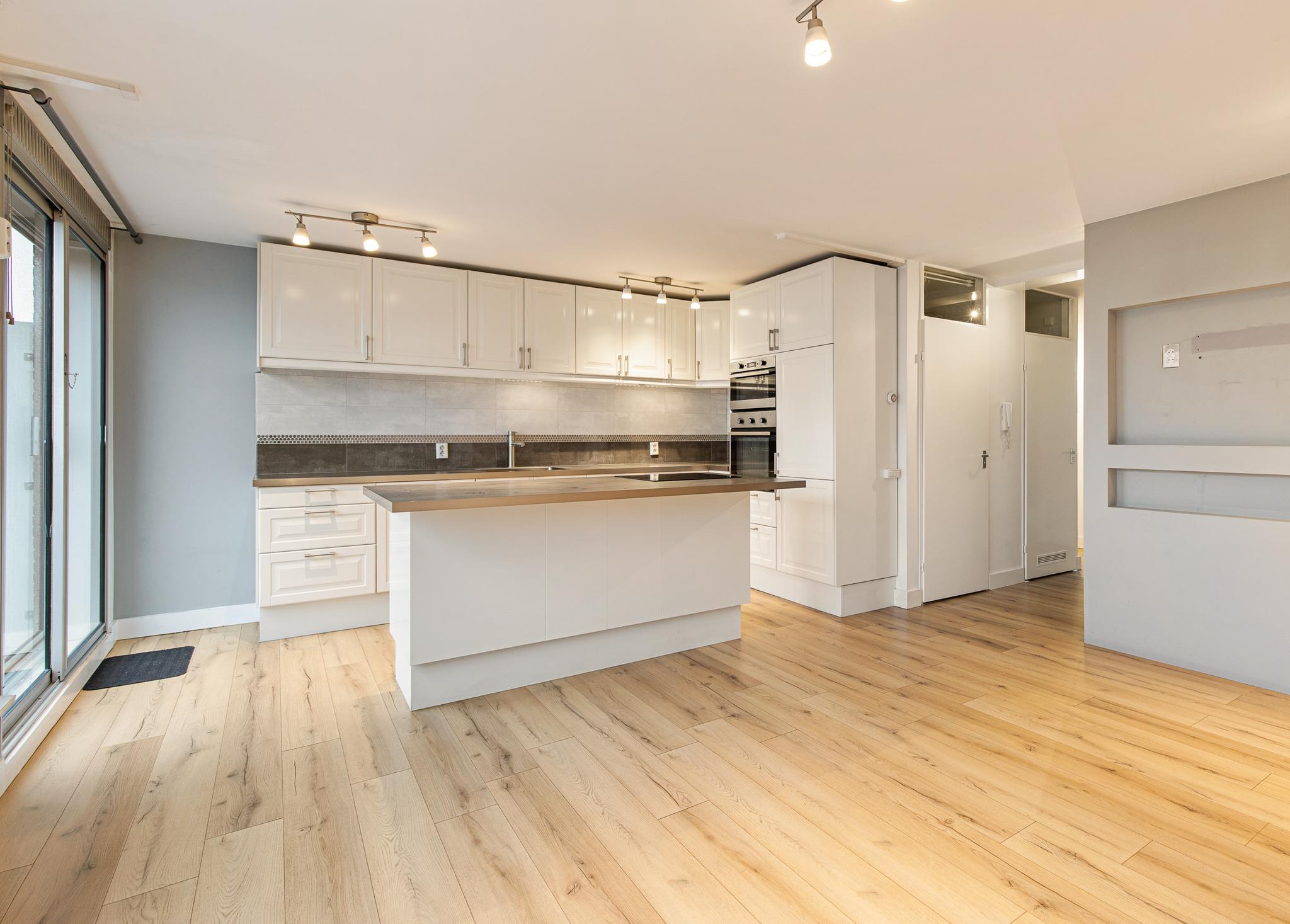 Upon entering the apartment, the bright living room with open kitchen is immediately visible on the right. The kitchen is equipped with luxury appliances and features a cooking island with bar. The sunny balcony is adjacent to the kitchen and due to the low buildings around the house, there is plenty of sunshine throughout the day.