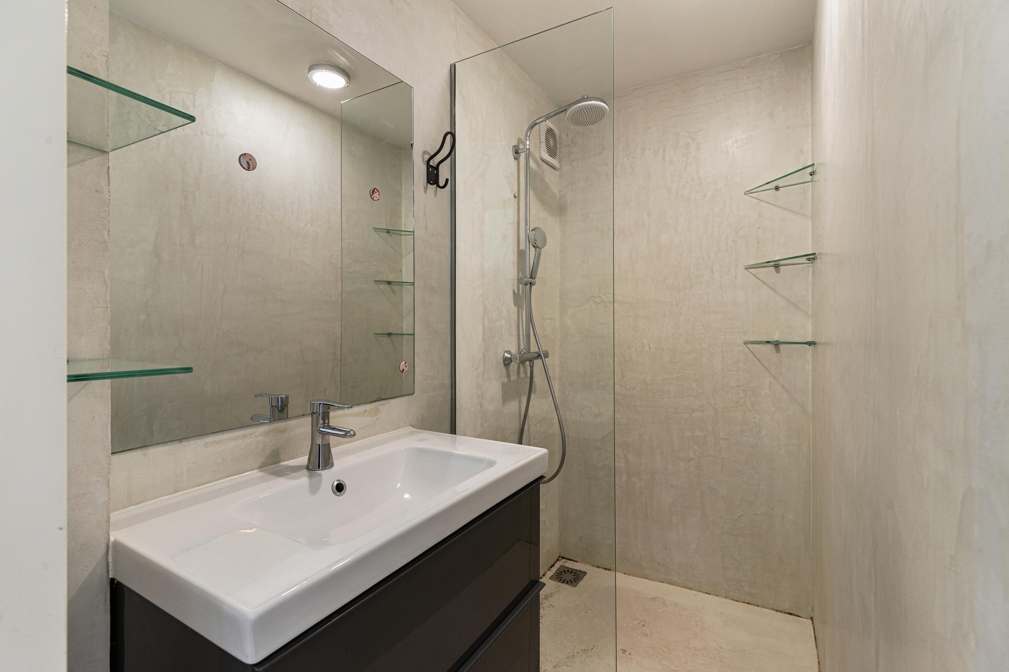 The recently renovated bathroom (2016) with walk-in shower and washbasin with cabinet is finished with stucco walls and provide a Mediterranean look.