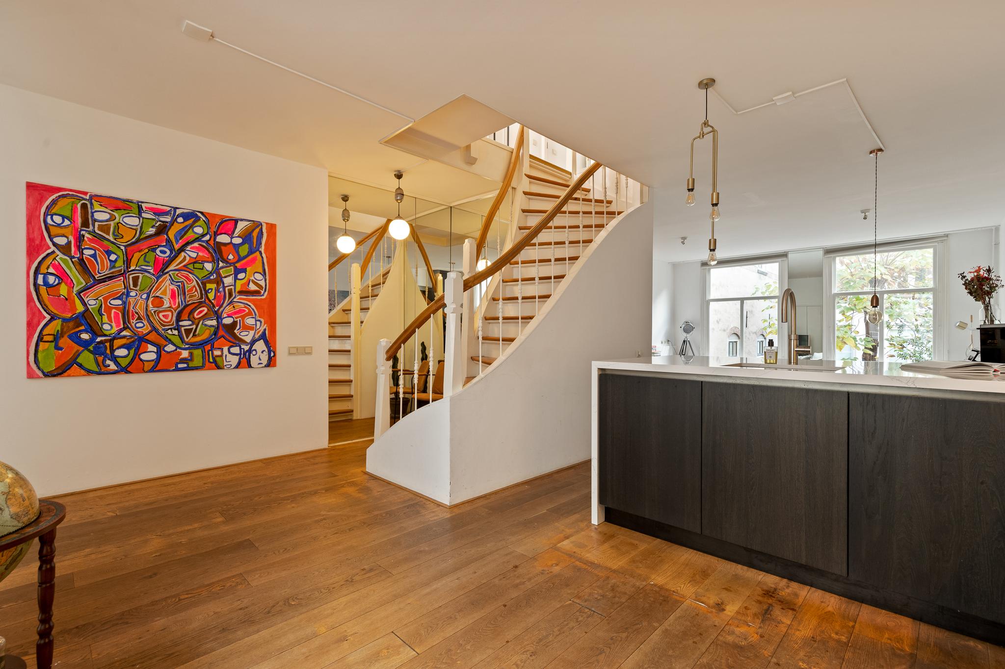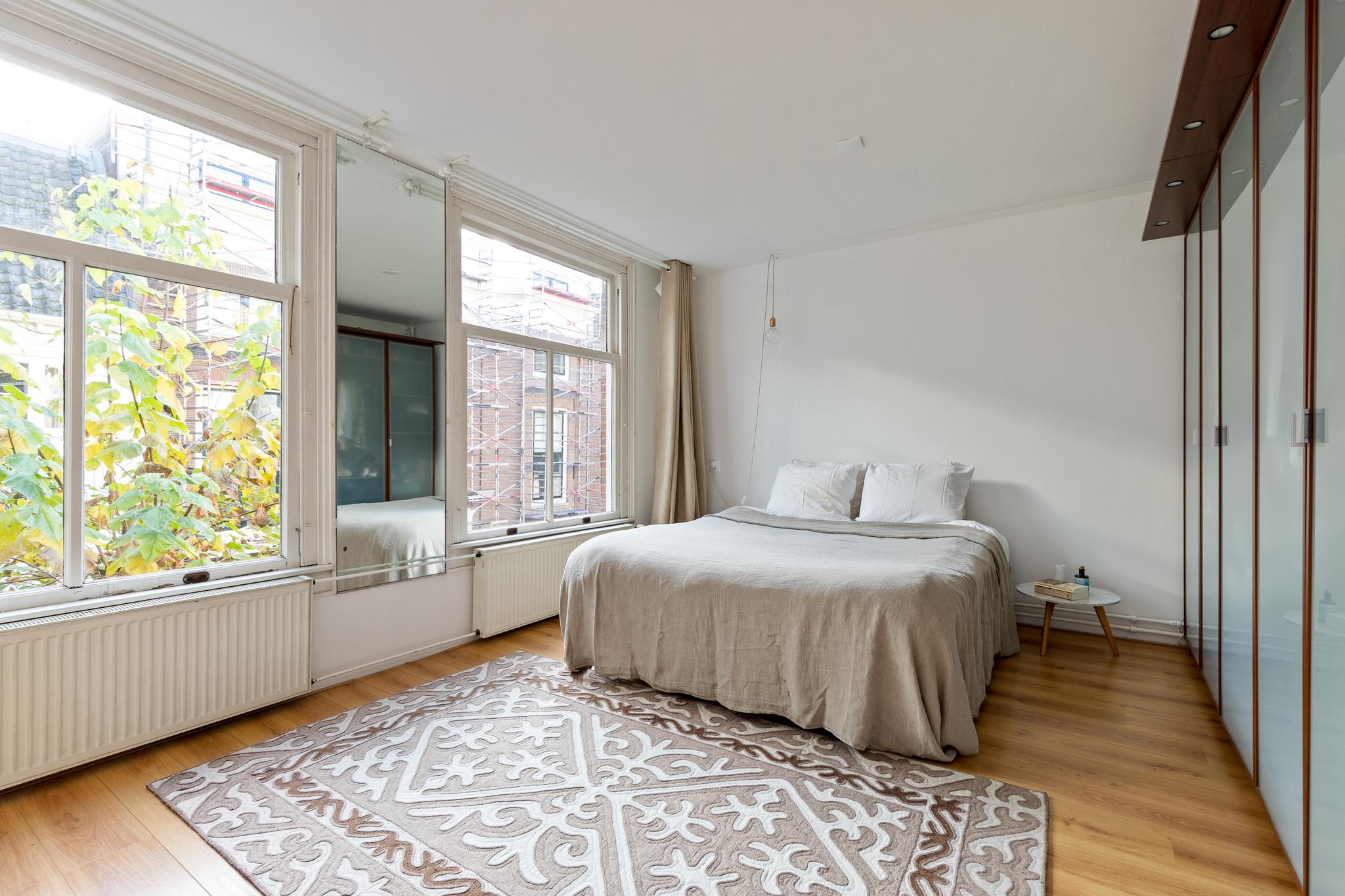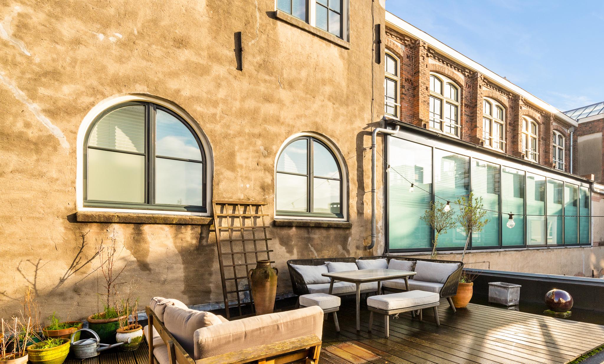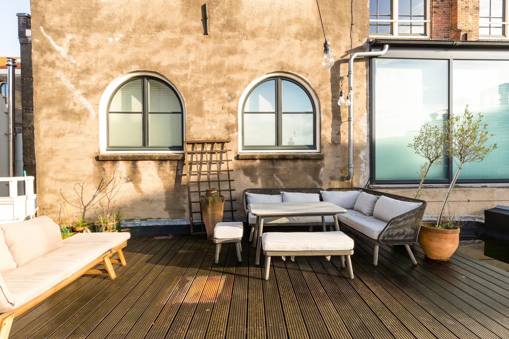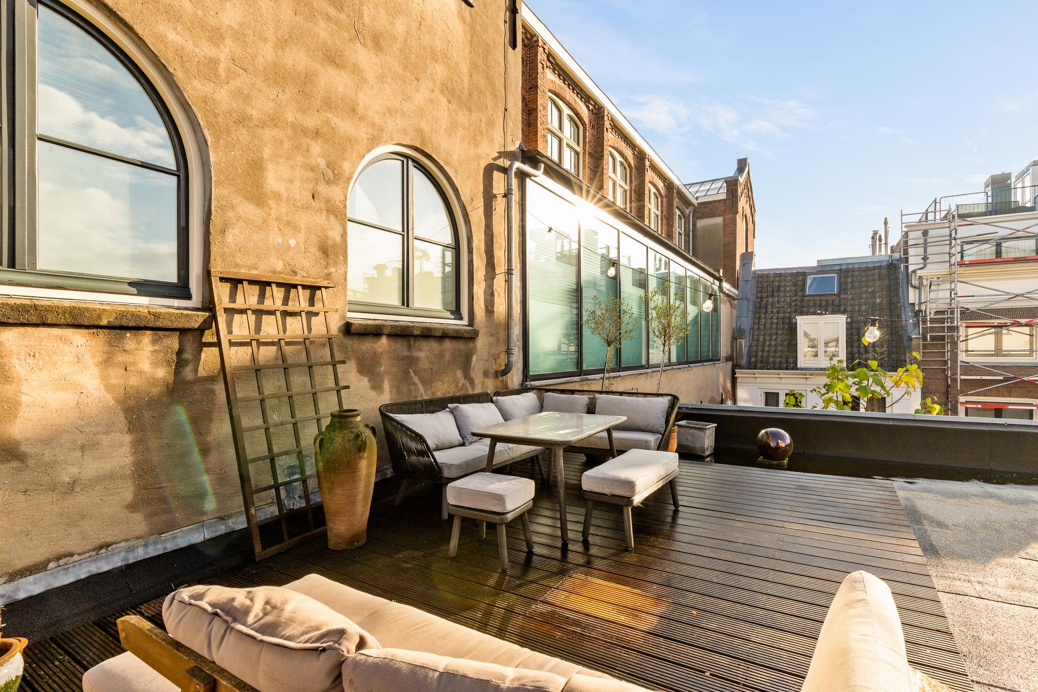 In the historic center of Amsterdam, this very bright apartment of 112 m2 is located in the back house of a monumental building from 1800. The apartment has two bedrooms and two roof terraces.