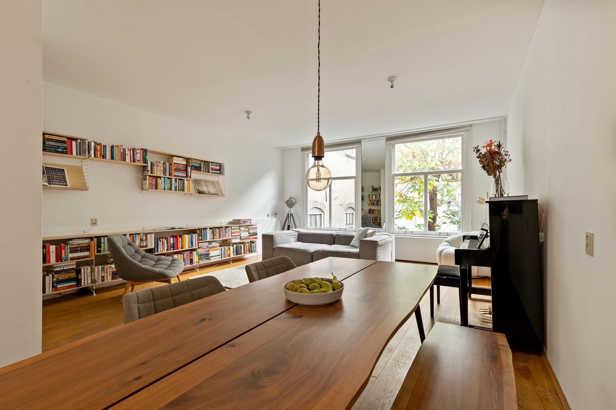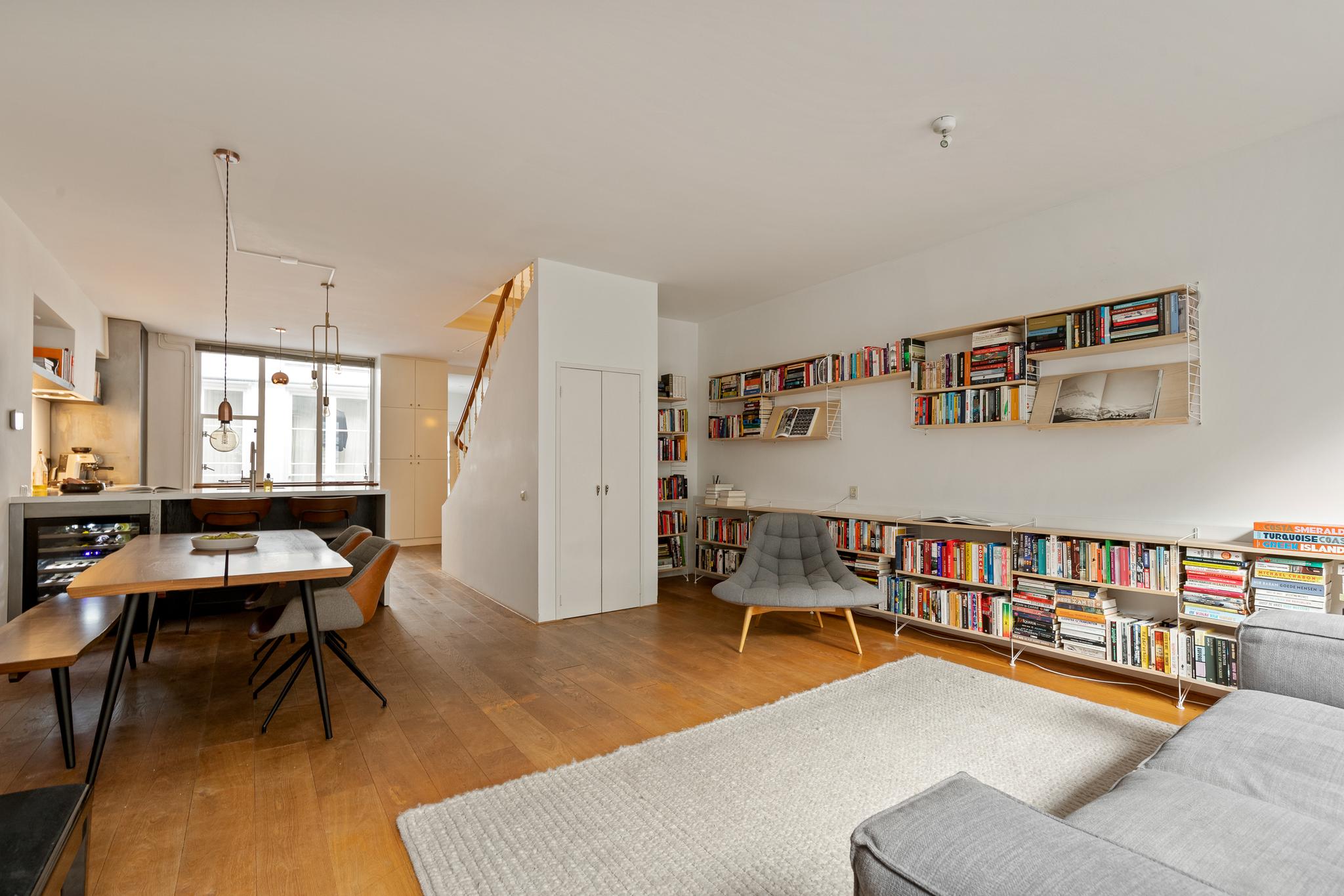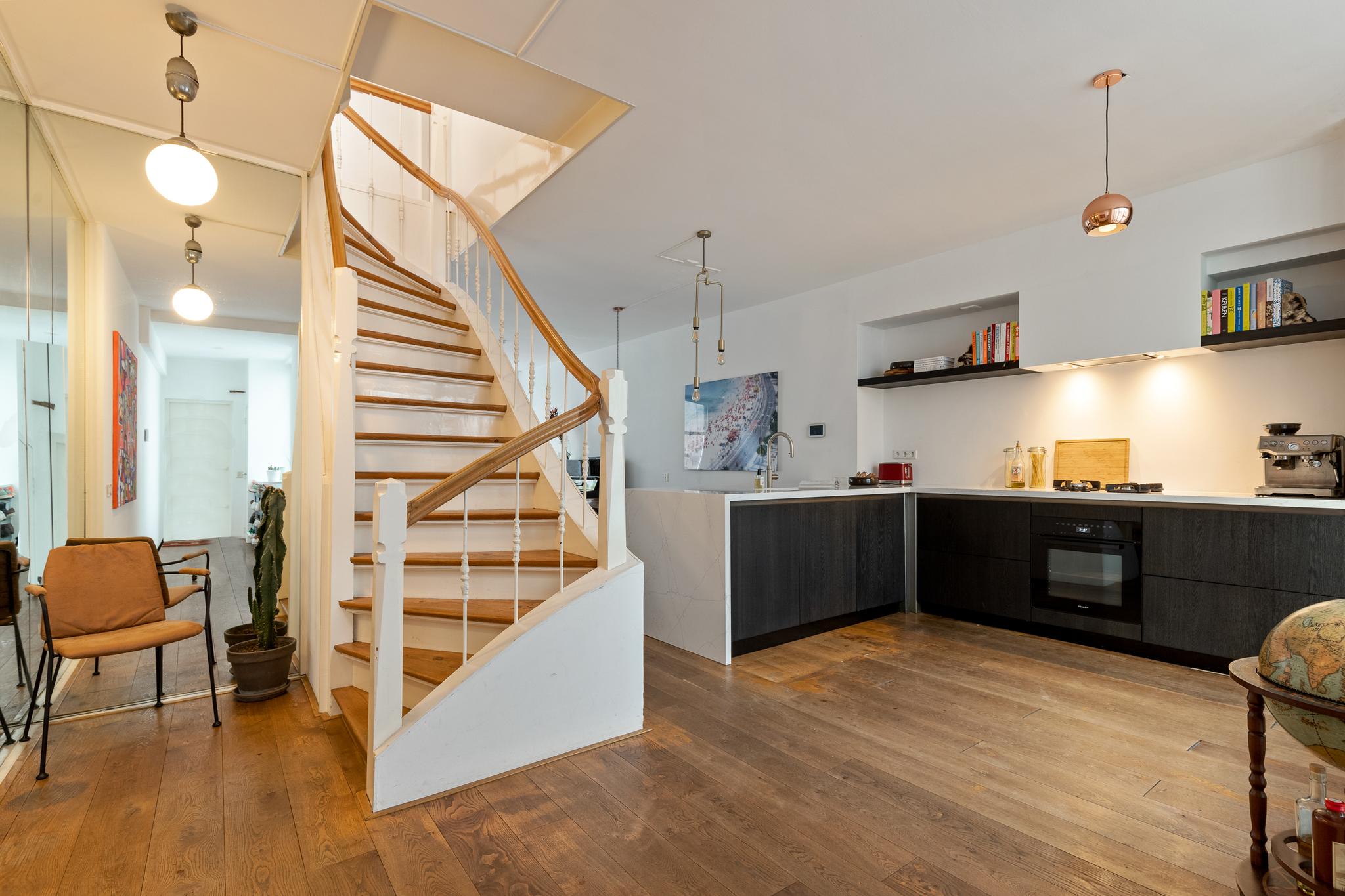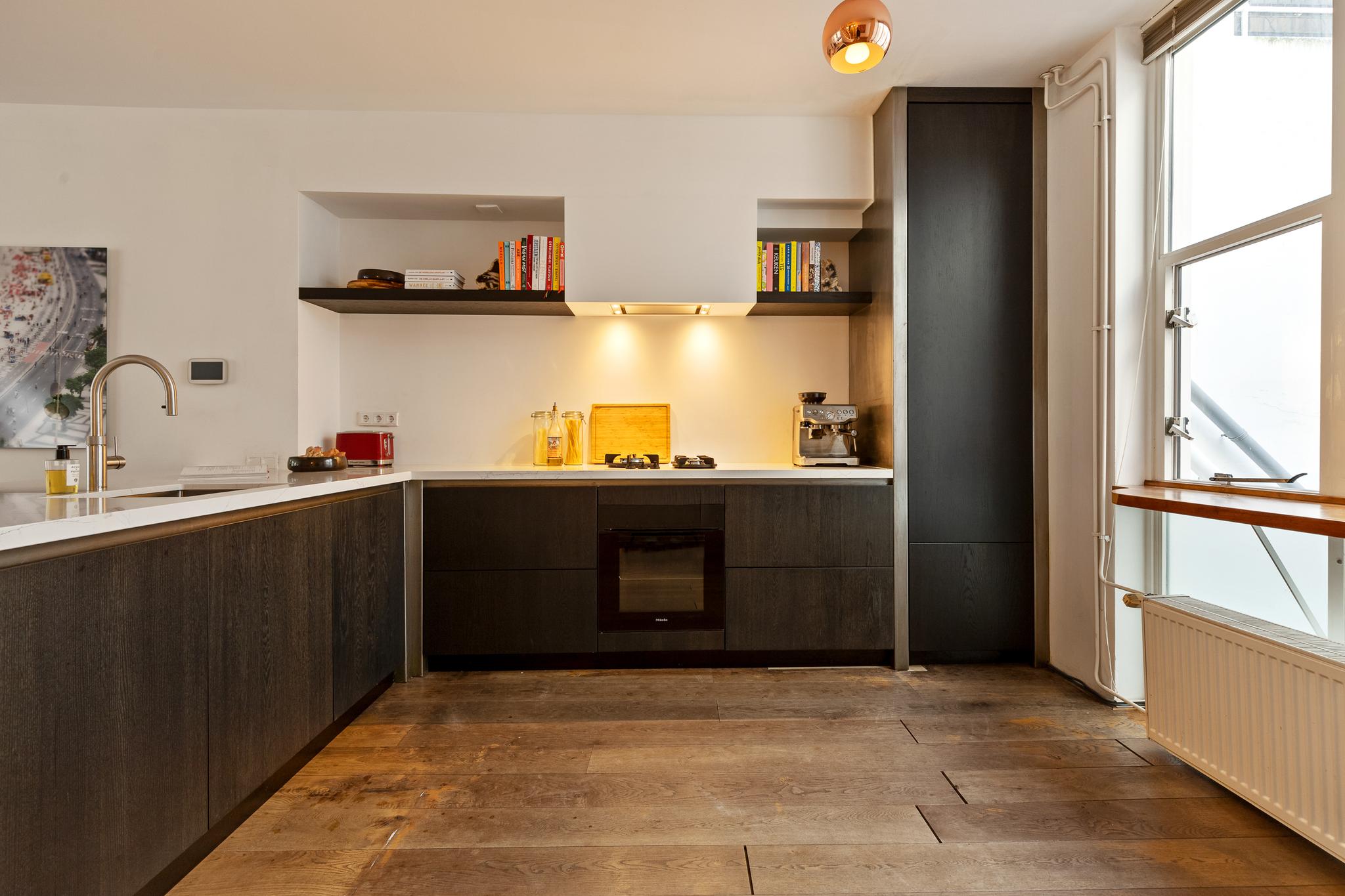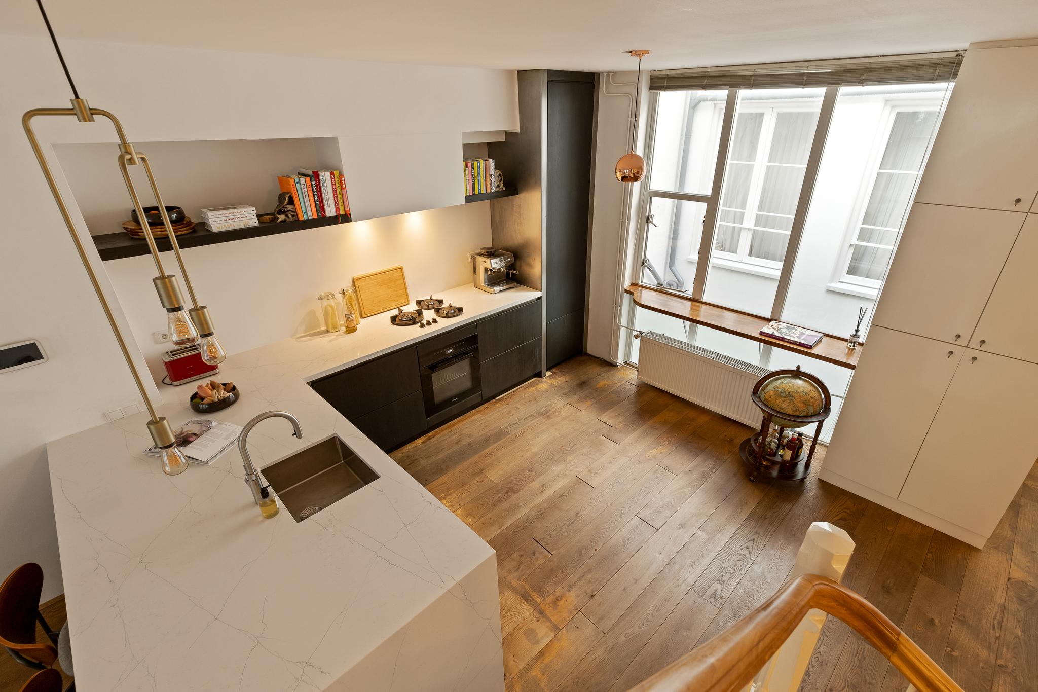 In the historic center of Amsterdam, this very bright apartment of 112 m2 is located in the back house of a monumental building from 1800. The apartment has two bedrooms and two roof terraces.