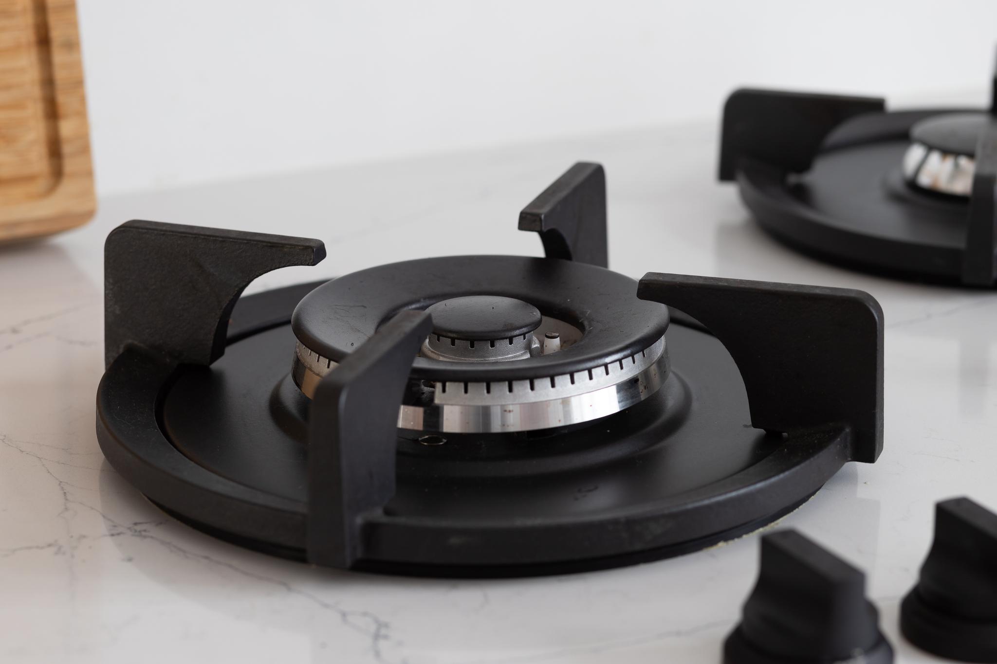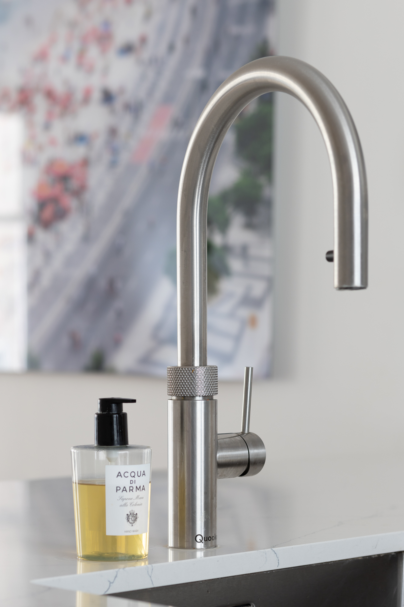The modern open kitchen has luxury appliances from Miele, a faucet from Quooker, a wine refrigerator and three integrated gas burners in the countertop. This gives the kitchen in combination with the composite top a very luxurious look.