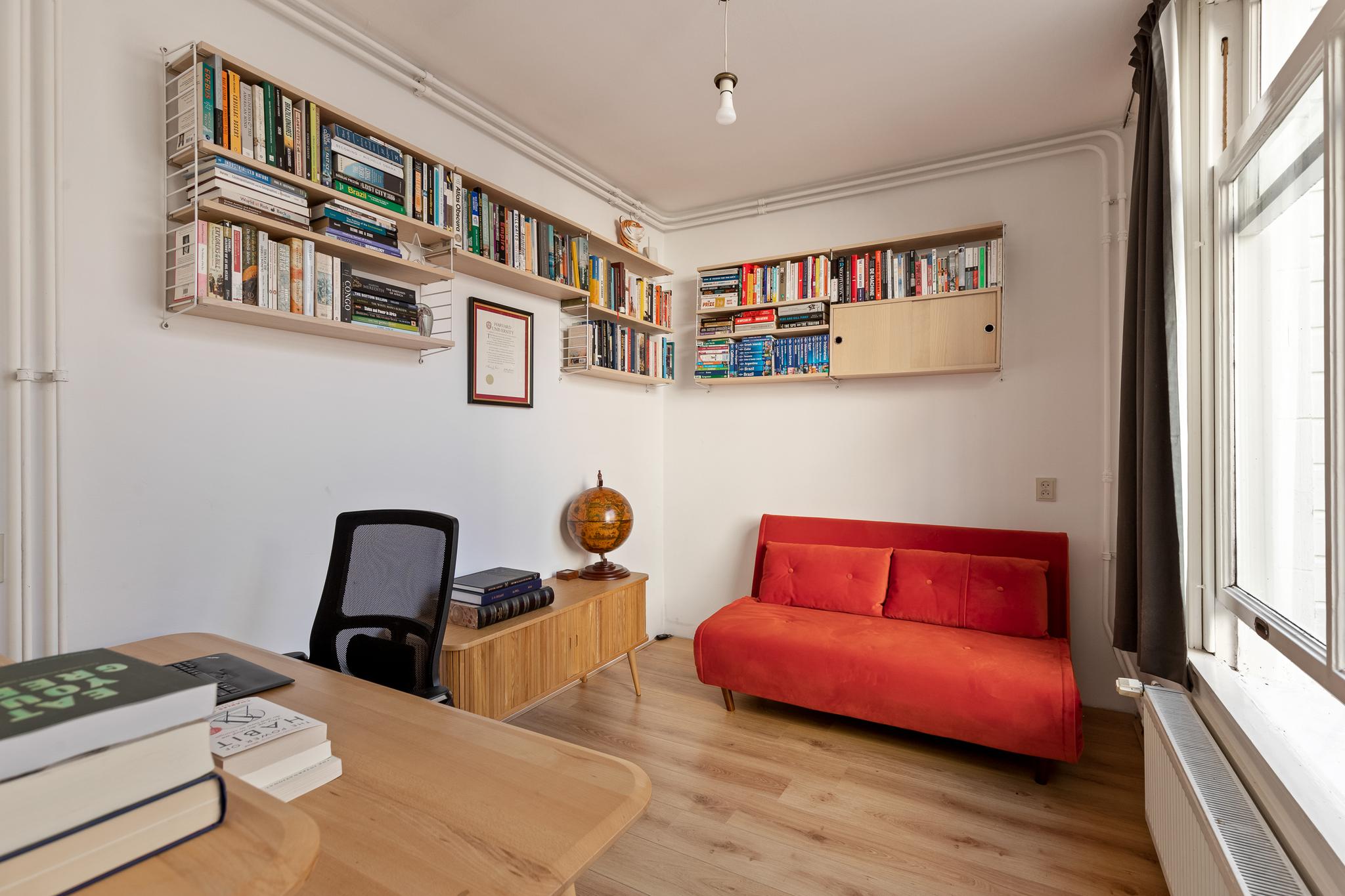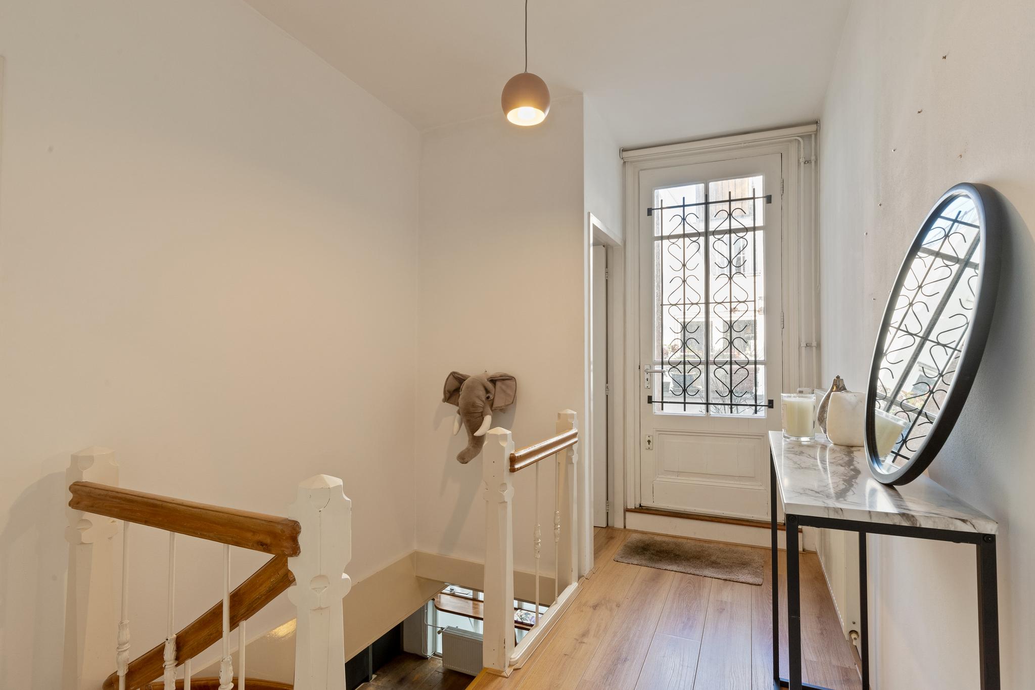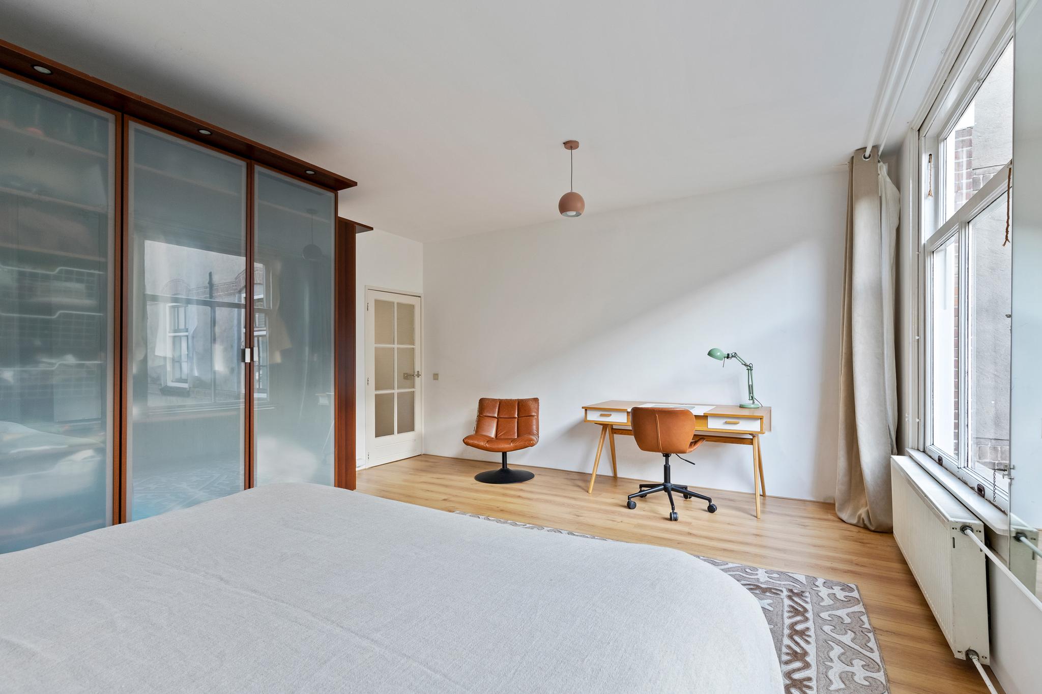 Via the authentic internal staircase with storage space, the second floor can be reached. On this floor are two bedrooms and a bathroom. The spacious master bedroom is approximately 23 m2 and has a lot of light due to the large windows. There is also a large closet wall. The bathroom has a bathtub, sink, toilet and washing machine and dryer connections.