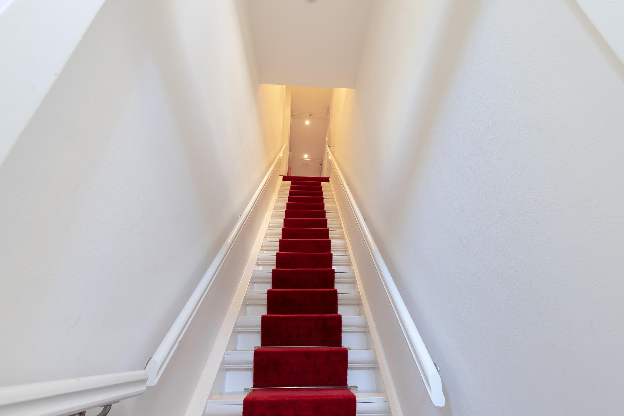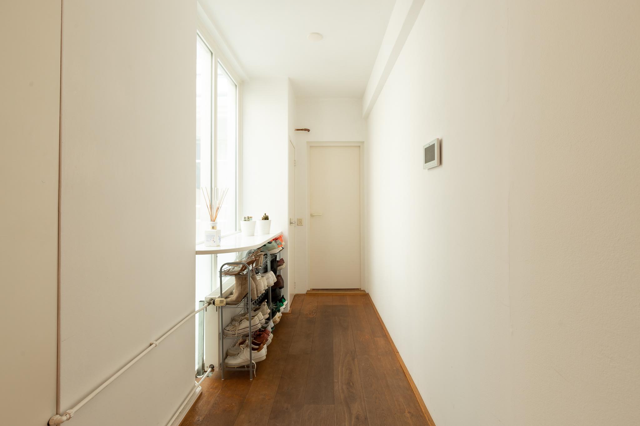 The neat staircase leads to the entrance of the house. Upon entering the long hallway, the kitchen and living room are immediately visible.
