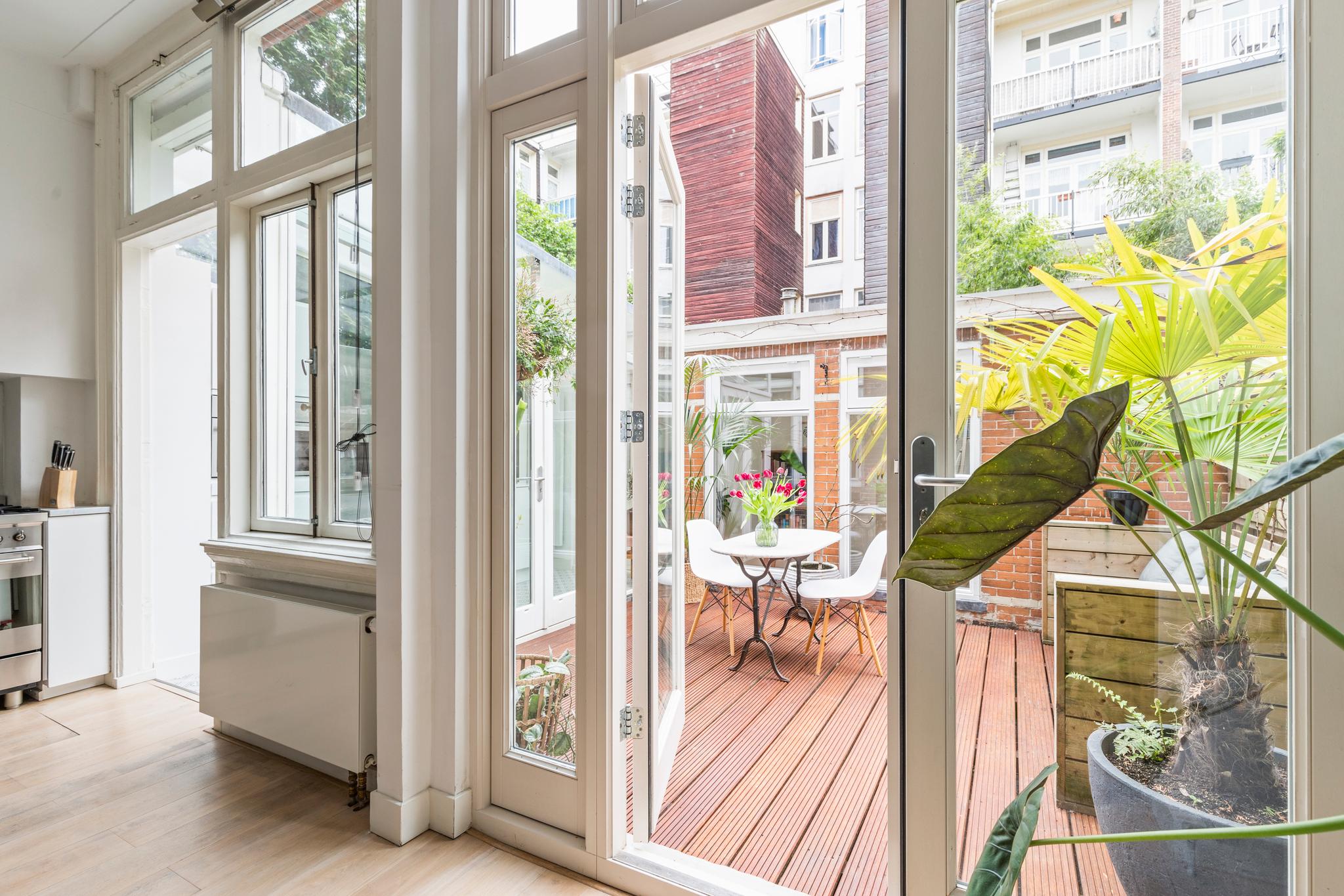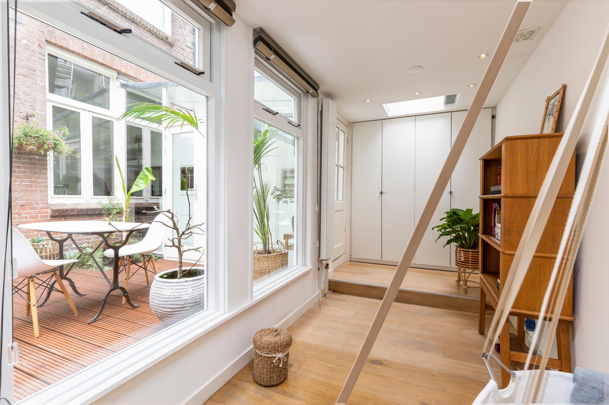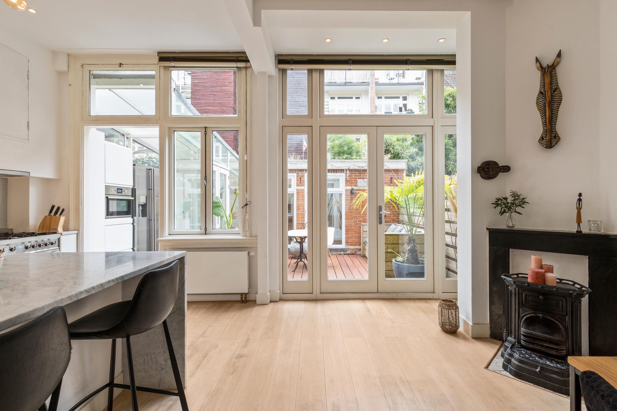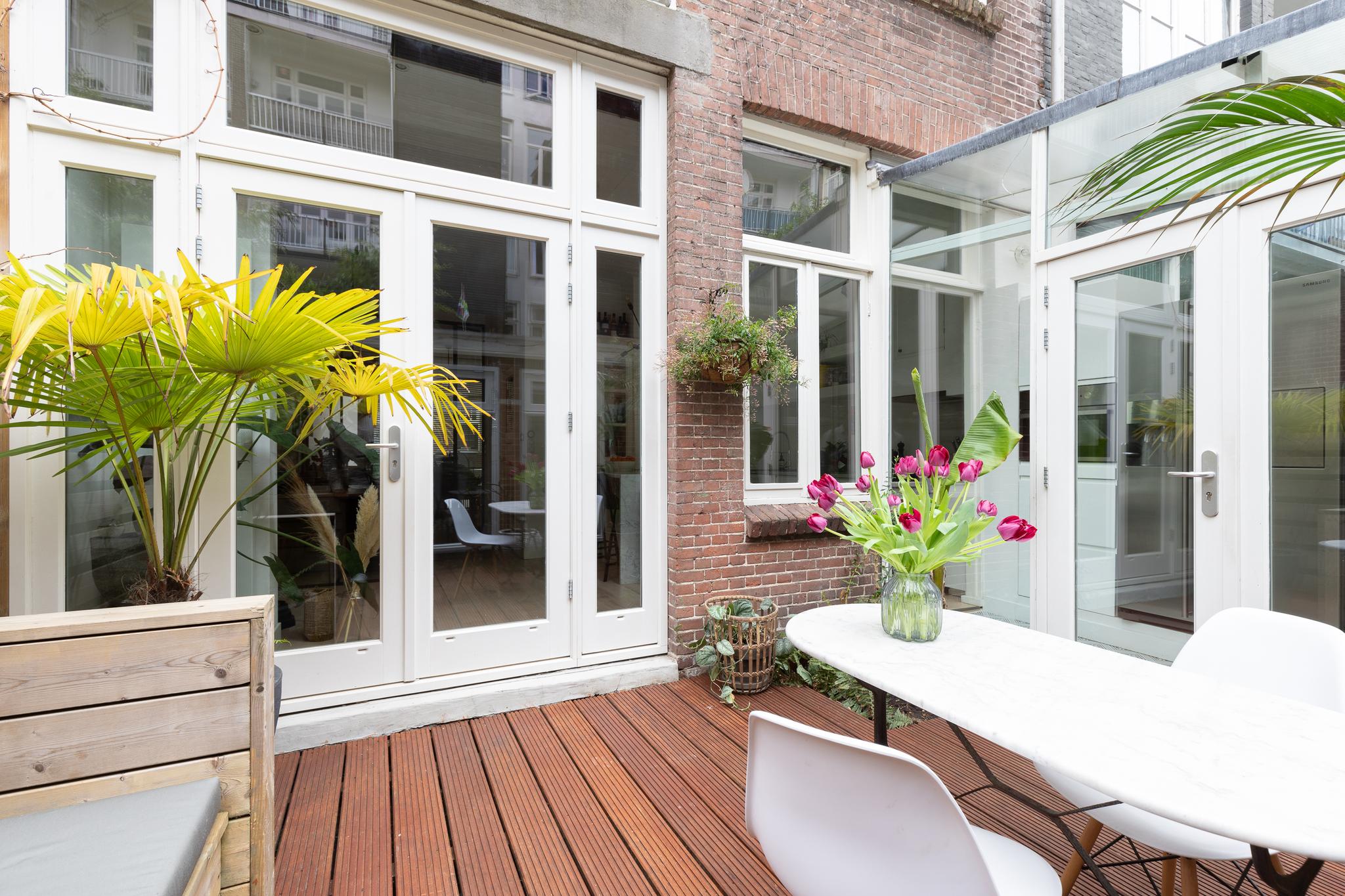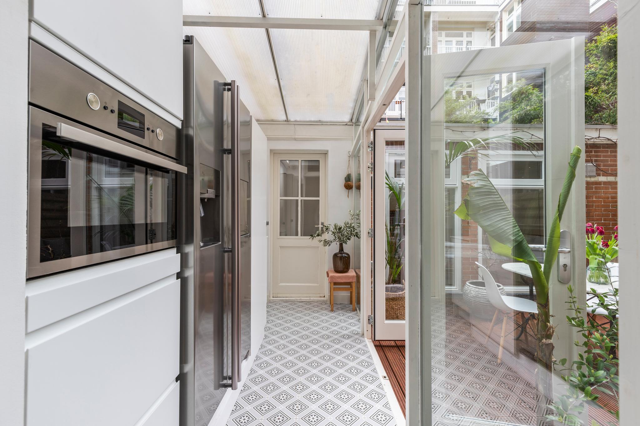 6 m2) are not included in the usable area by the ceiling height <2 m and can therefore be seen as bonus meters.Through its own front door on the first floor you reach the porch and the spacious and bright living room with a ceiling height of up to 3.13 meters consisting of a sitting and dining area with a beautiful traditional stove. The two rooms are separated by modern steel doors which form a nice contrast with the characteristic details such as the stained-glass windows.The fully equipped open kitchen includes a 5-burner stove and oven (Smeg), a dishwasher (Bosch), an American fridge (Samsung) and a marble worktop. Next to the kitchen is a utility room with a washer / dryer (Miele). Through this utility room is the (bed) room with closet at the rear to reach. The cozy patio of approximately 14 m2 is located on the northwest and is accessible through double doors from the living room and utility room.The luxurious bathroom has a large shower, underfloor heating, mirror heating and a double sink with cabinet. The extra bedroom is located in the basement, has a custom-made closet with also a separate storage room and a separate toilet with washbasin.The apartment is located on a quiet street in the middle of the vibrant De Pijp district, around the corner from the Sarphatipark, the cozy Gerard Douplein and Van der Helstplein with plenty of good restaurants and cafes. The Albert Cuyp market is just steps away. The property is easily accessible by public transport, Amsterdam Amstel is at 5 minutes cycling distance and by car you will reach the A2 and A-10 ring road in no time. DETAILS- Usable area living approximately 71,1 m2 plus 23,6 m2 'other indoor space' in the basement because of the height under the beams <2 meter (according to NEN2580);- Tastefully renovated in 2017 with retention of characteristic details;- Patio / garden of 14 m2 with evening sun;- Ceiling height of > 3 meters;