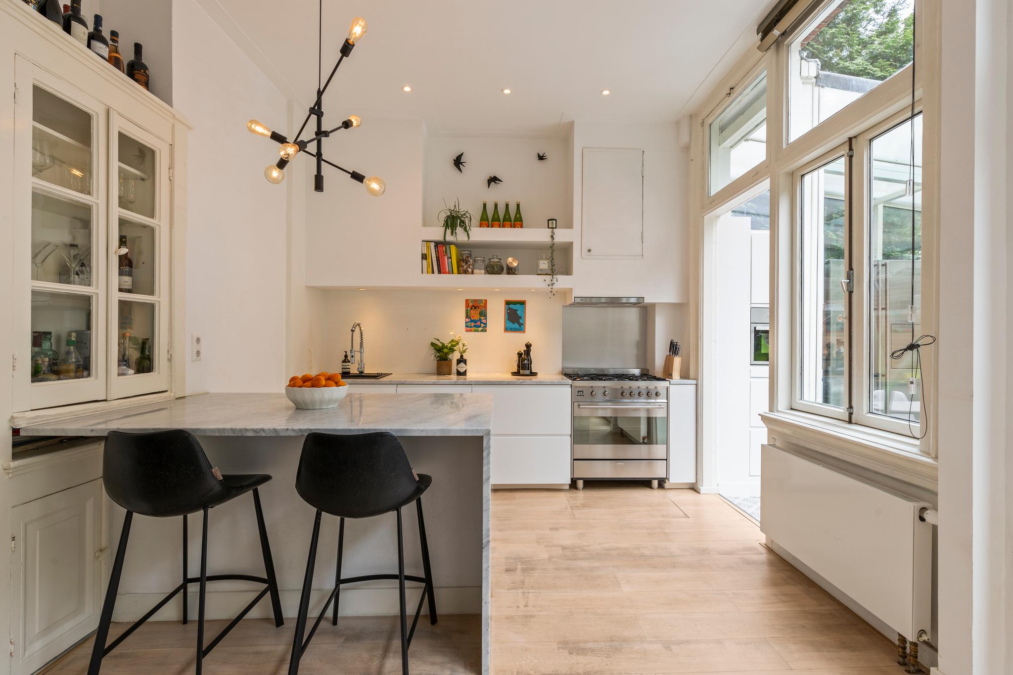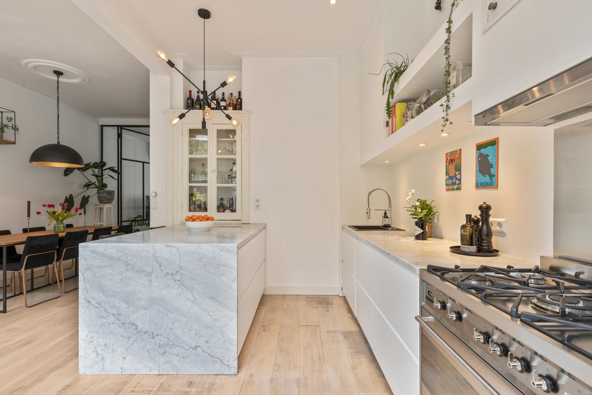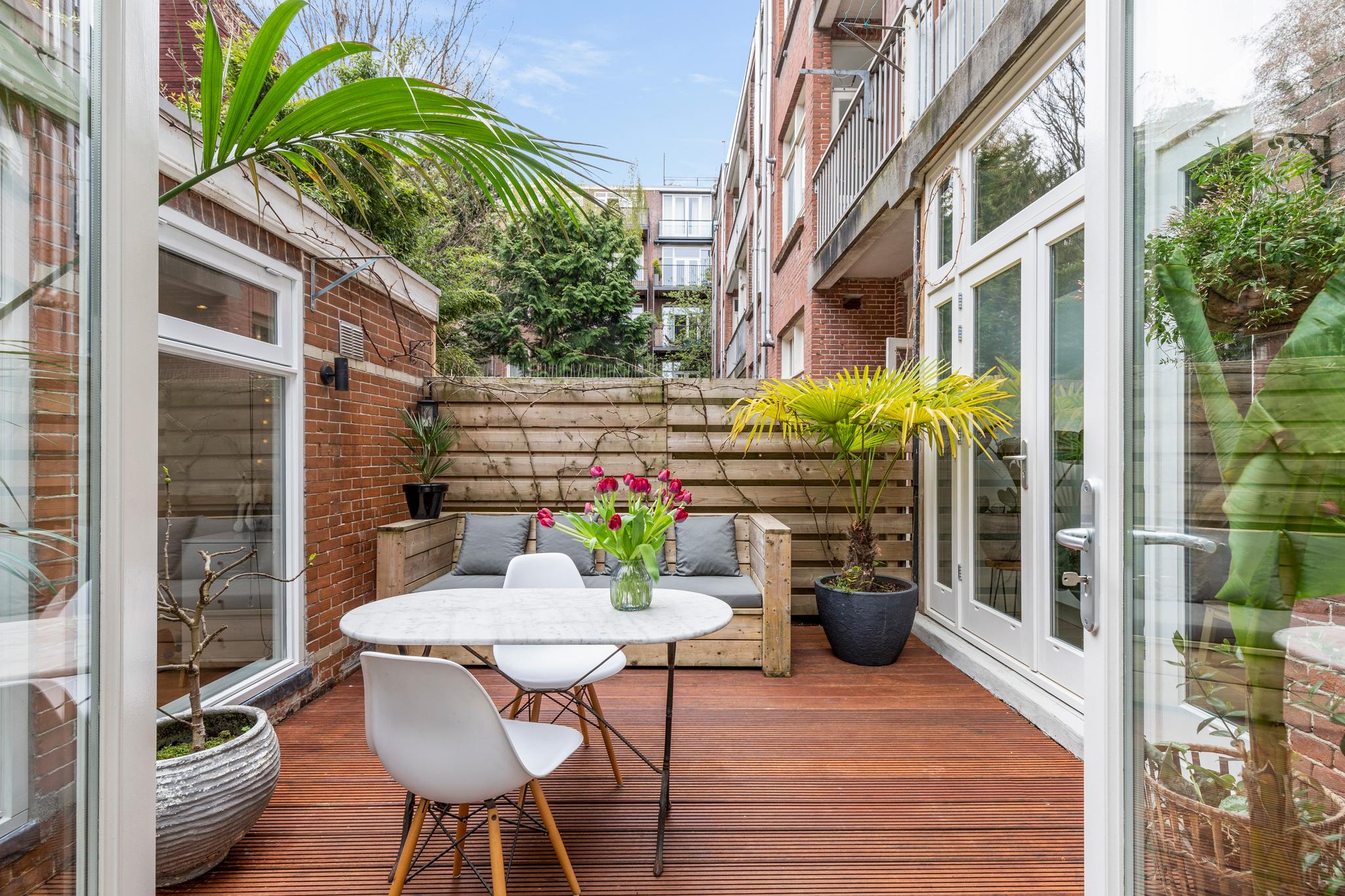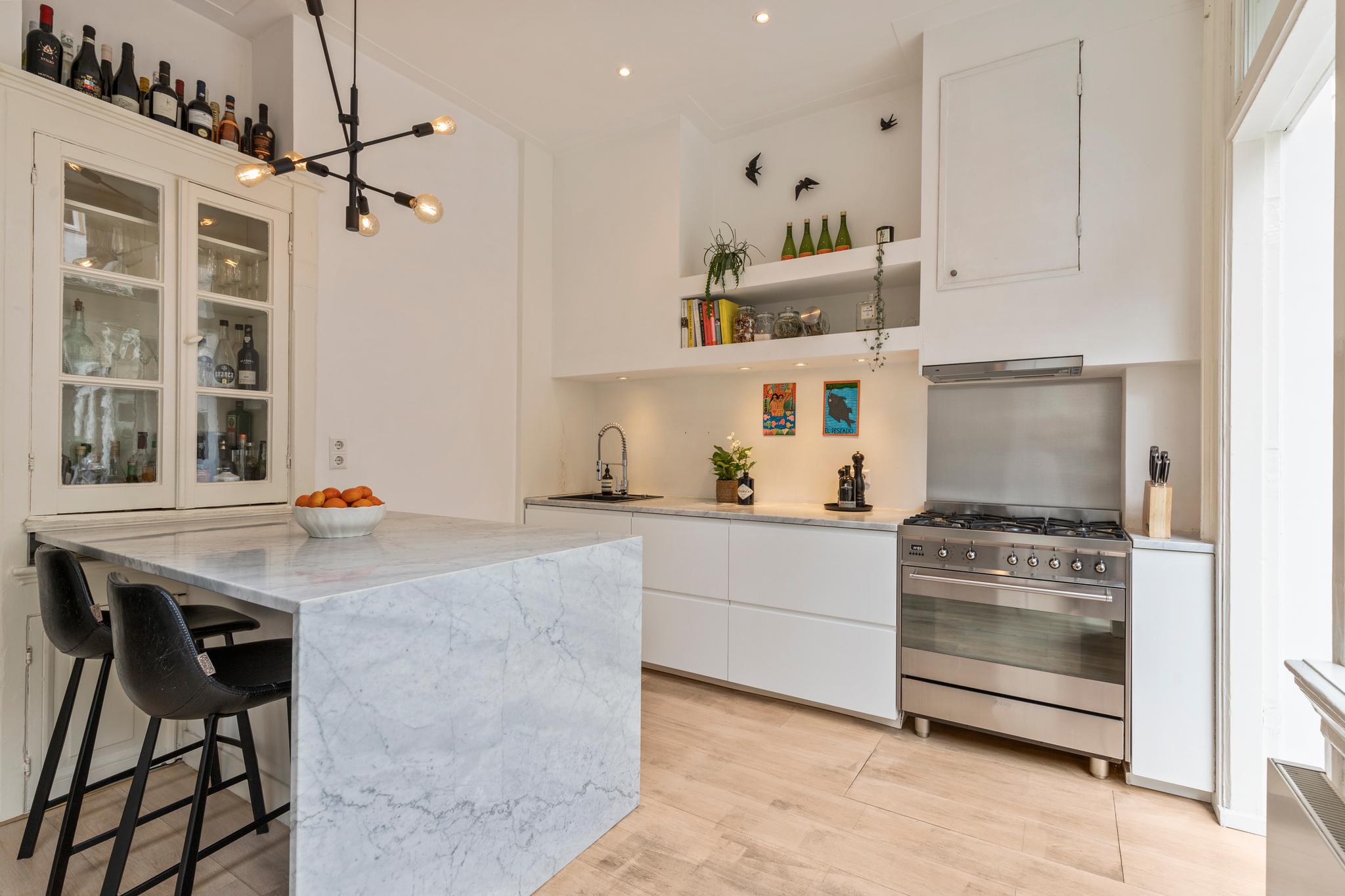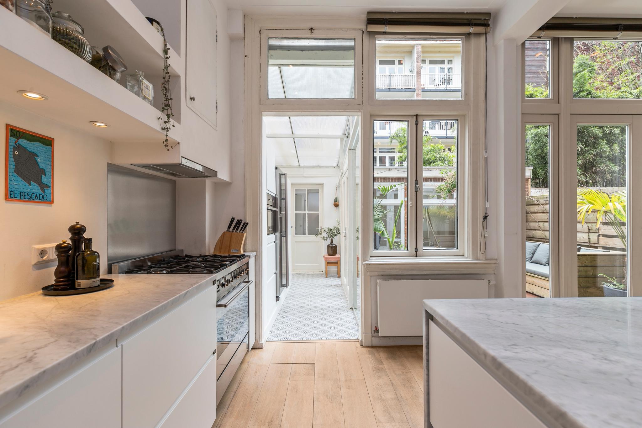 6 m2) are not included in the usable area by the ceiling height <2 m and can therefore be seen as bonus meters.Through its own front door on the first floor you reach the porch and the spacious and bright living room with a ceiling height of up to 3.13 meters consisting of a sitting and dining area with a beautiful traditional stove. The two rooms are separated by modern steel doors which form a nice contrast with the characteristic details such as the stained-glass windows.The fully equipped open kitchen includes a 5-burner stove and oven (Smeg), a dishwasher (Bosch), an American fridge (Samsung) and a marble worktop. Next to the kitchen is a utility room with a washer / dryer (Miele). Through this utility room is the (bed) room with closet at the rear to reach. The cozy patio of approximately 14 m2 is located on the northwest and is accessible through double doors from the living room and utility room.The luxurious bathroom has a large shower, underfloor heating, mirror heating and a double sink with cabinet. The extra bedroom is located in the basement, has a custom-made closet with also a separate storage room and a separate toilet with washbasin.The apartment is located on a quiet street in the middle of the vibrant De Pijp district, around the corner from the Sarphatipark, the cozy Gerard Douplein and Van der Helstplein with plenty of good restaurants and cafes. The Albert Cuyp market is just steps away. The property is easily accessible by public transport, Amsterdam Amstel is at 5 minutes cycling distance and by car you will reach the A2 and A-10 ring road in no time. DETAILS- Usable area living approximately 71,1 m2 plus 23,6 m2 'other indoor space' in the basement because of the height under the beams <2 meter (according to NEN2580);- Tastefully renovated in 2017 with retention of characteristic details;- Patio / garden of 14 m2 with evening sun;- Ceiling height of > 3 meters;