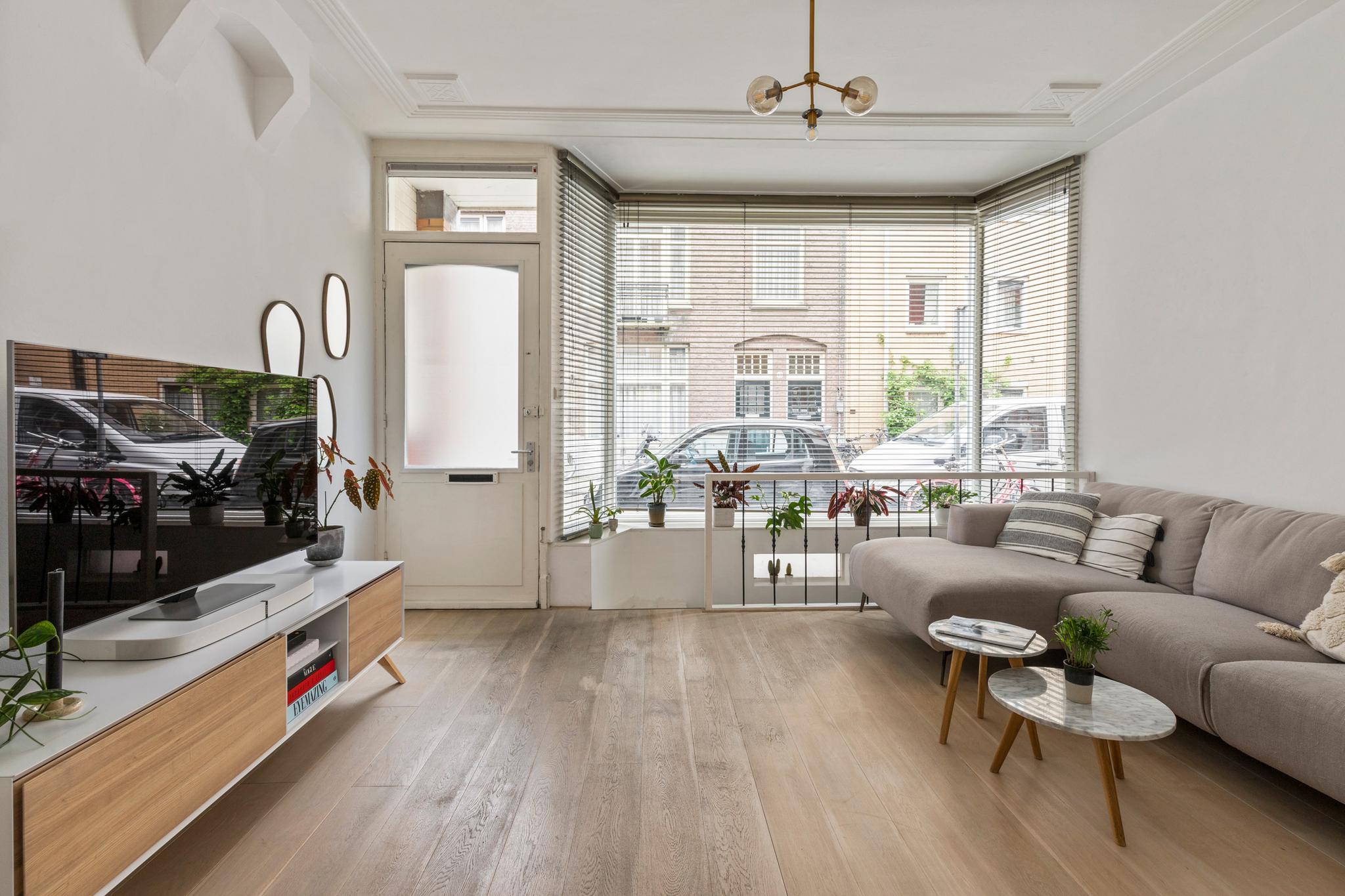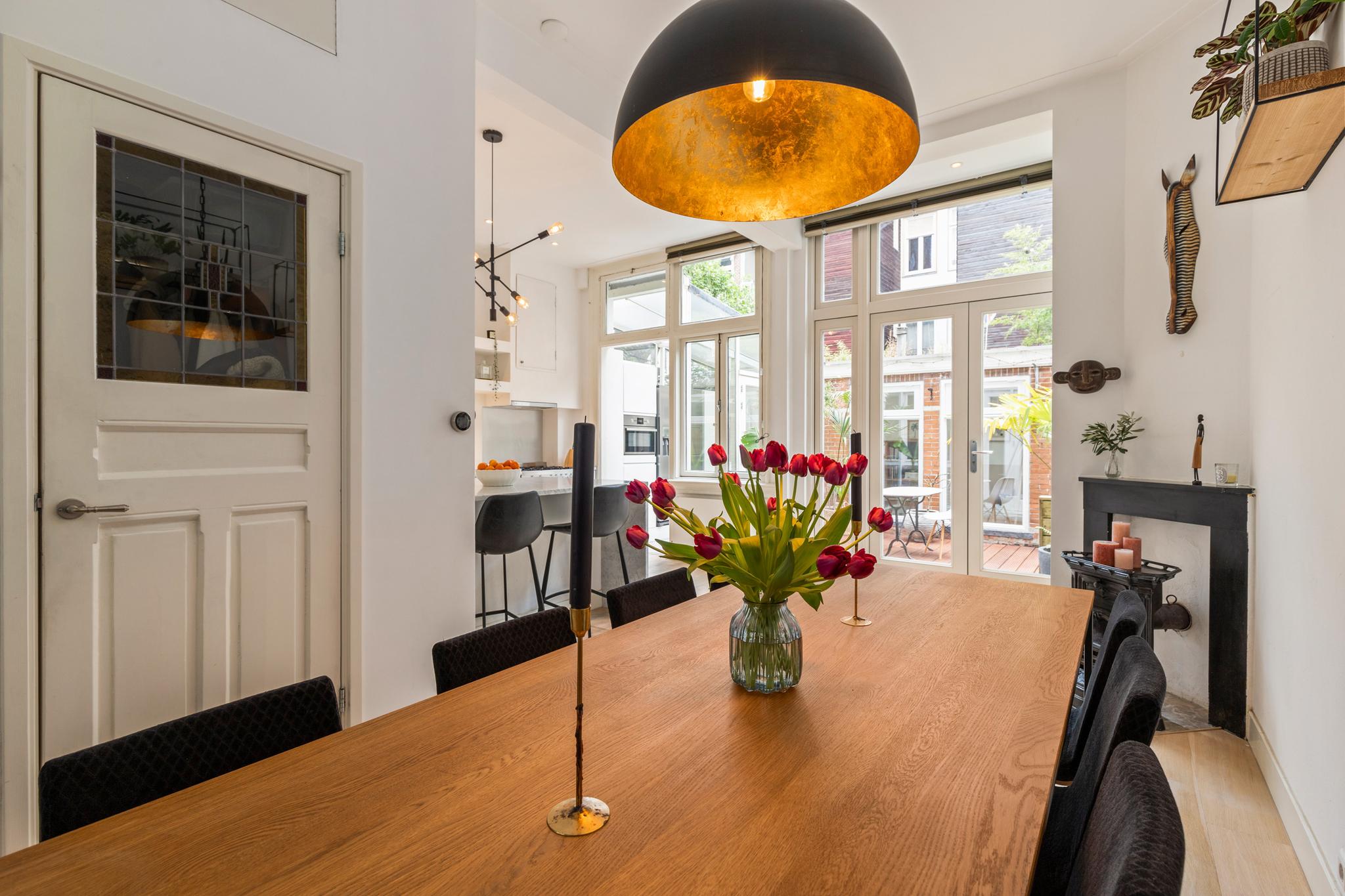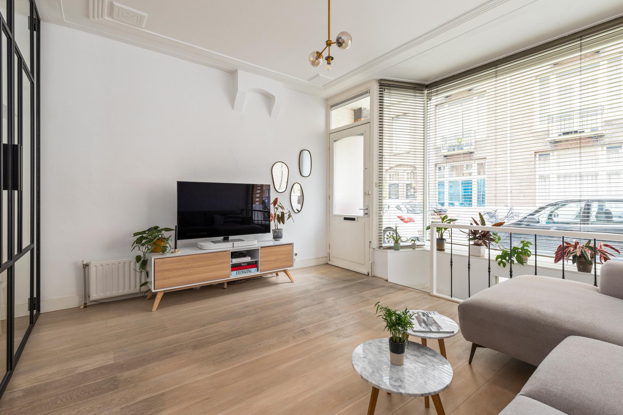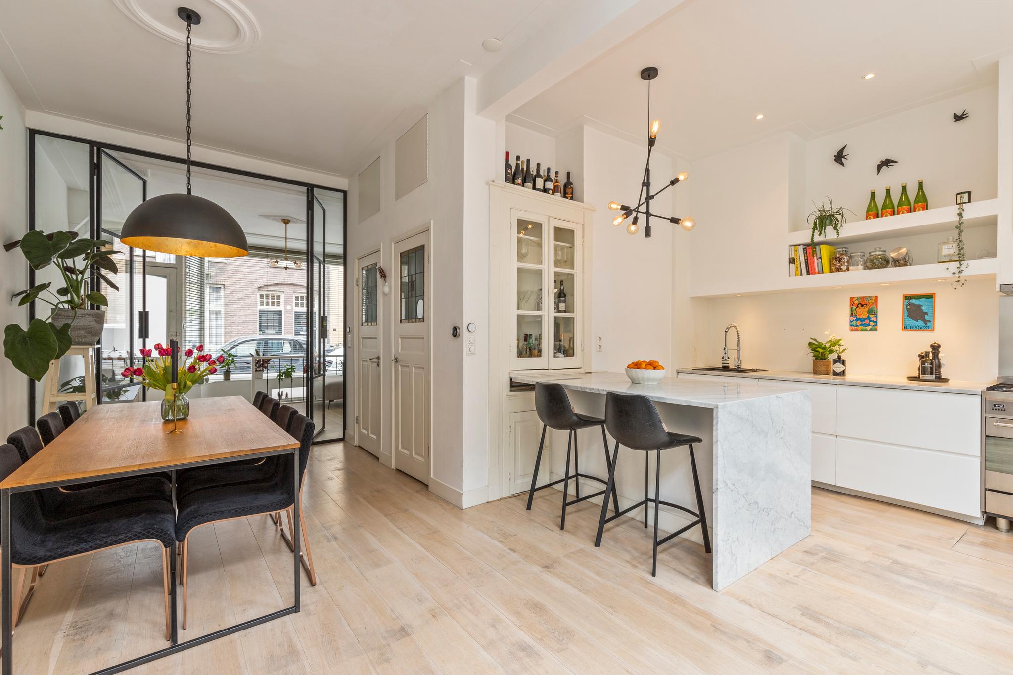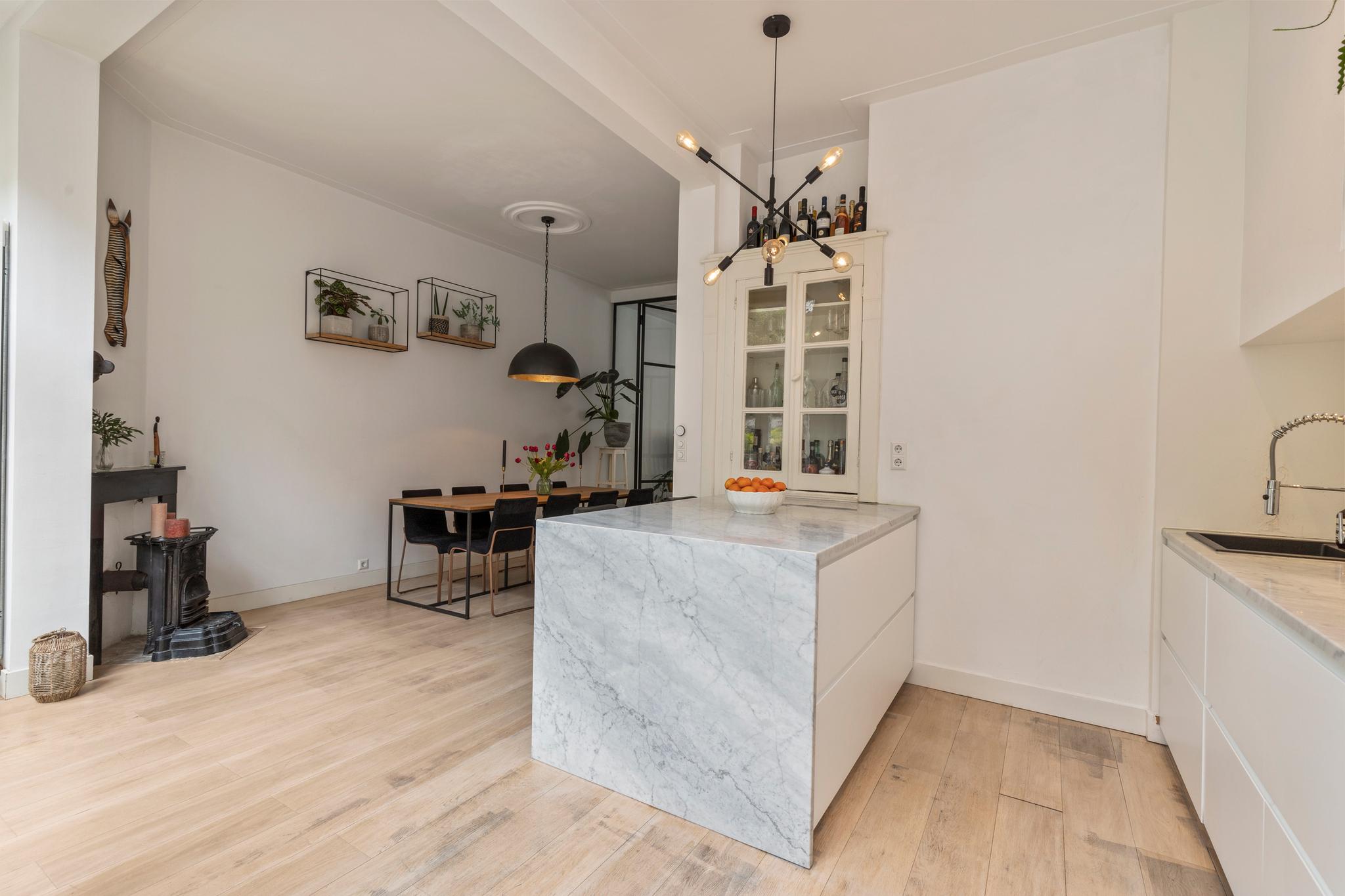 6 m2) are not included in the usable area by the ceiling height <2 m and can therefore be seen as bonus meters.Through its own front door on the first floor you reach the porch and the spacious and bright living room with a ceiling height of up to 3.13 meters consisting of a sitting and dining area with a beautiful traditional stove. The two rooms are separated by modern steel doors which form a nice contrast with the characteristic details such as the stained-glass windows.The fully equipped open kitchen includes a 5-burner stove and oven (Smeg), a dishwasher (Bosch), an American fridge (Samsung) and a marble worktop. Next to the kitchen is a utility room with a washer / dryer (Miele). Through this utility room is the (bed) room with closet at the rear to reach. The cozy patio of approximately 14 m2 is located on the northwest and is accessible through double doors from the living room and utility room.The luxurious bathroom has a large shower, underfloor heating, mirror heating and a double sink with cabinet. The extra bedroom is located in the basement, has a custom-made closet with also a separate storage room and a separate toilet with washbasin.The apartment is located on a quiet street in the middle of the vibrant De Pijp district, around the corner from the Sarphatipark, the cozy Gerard Douplein and Van der Helstplein with plenty of good restaurants and cafes. The Albert Cuyp market is just steps away. The property is easily accessible by public transport, Amsterdam Amstel is at 5 minutes cycling distance and by car you will reach the A2 and A-10 ring road in no time. DETAILS- Usable area living approximately 71,1 m2 plus 23,6 m2 'other indoor space' in the basement because of the height under the beams <2 meter (according to NEN2580);- Tastefully renovated in 2017 with retention of characteristic details;- Patio / garden of 14 m2 with evening sun;- Ceiling height of > 3 meters;