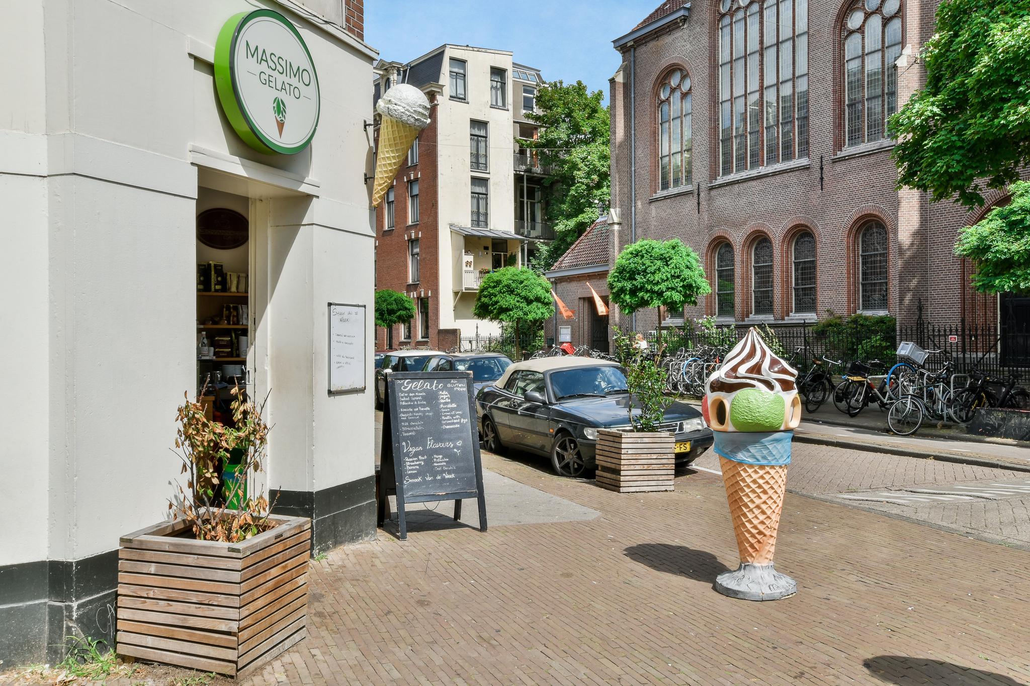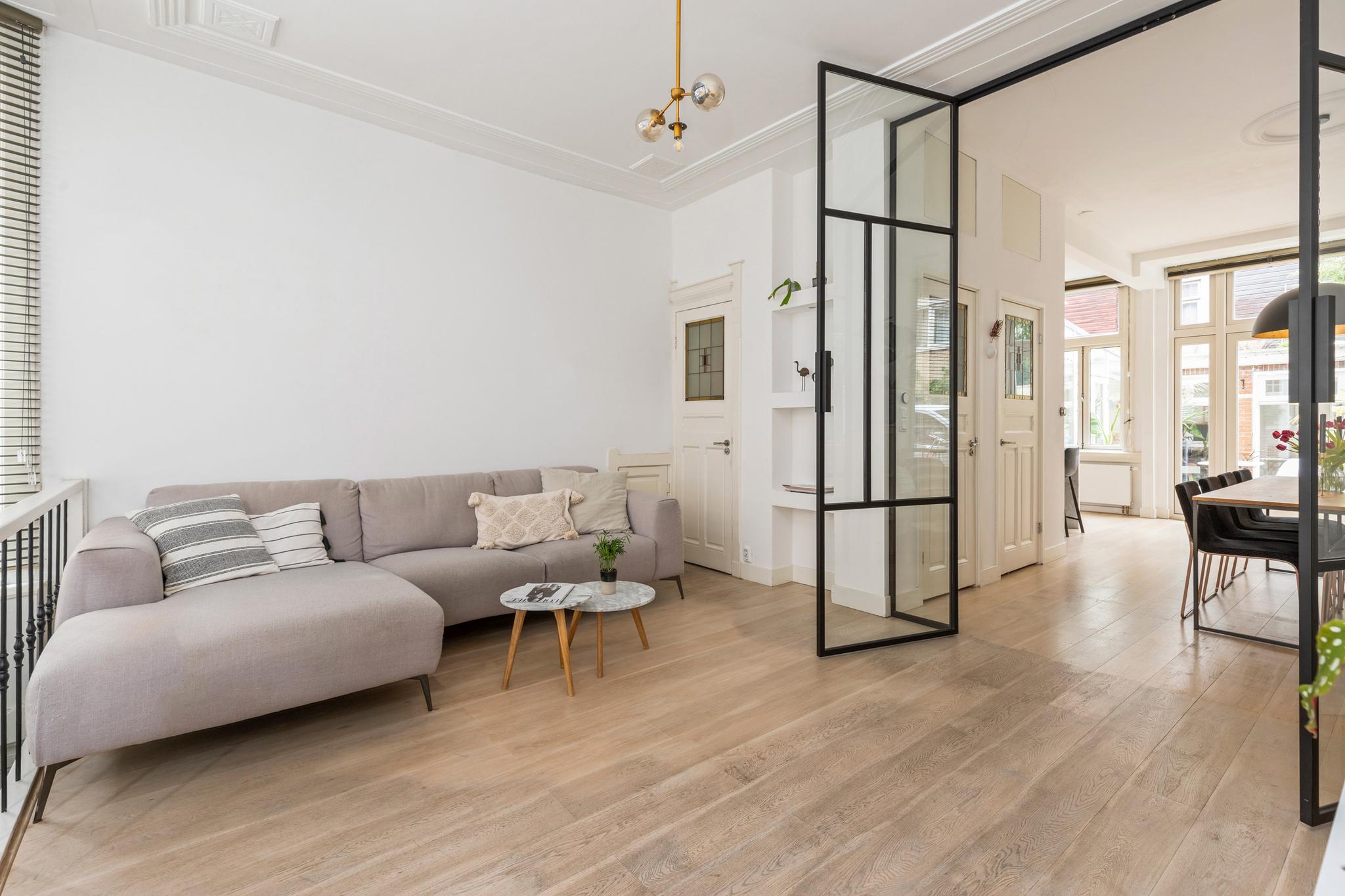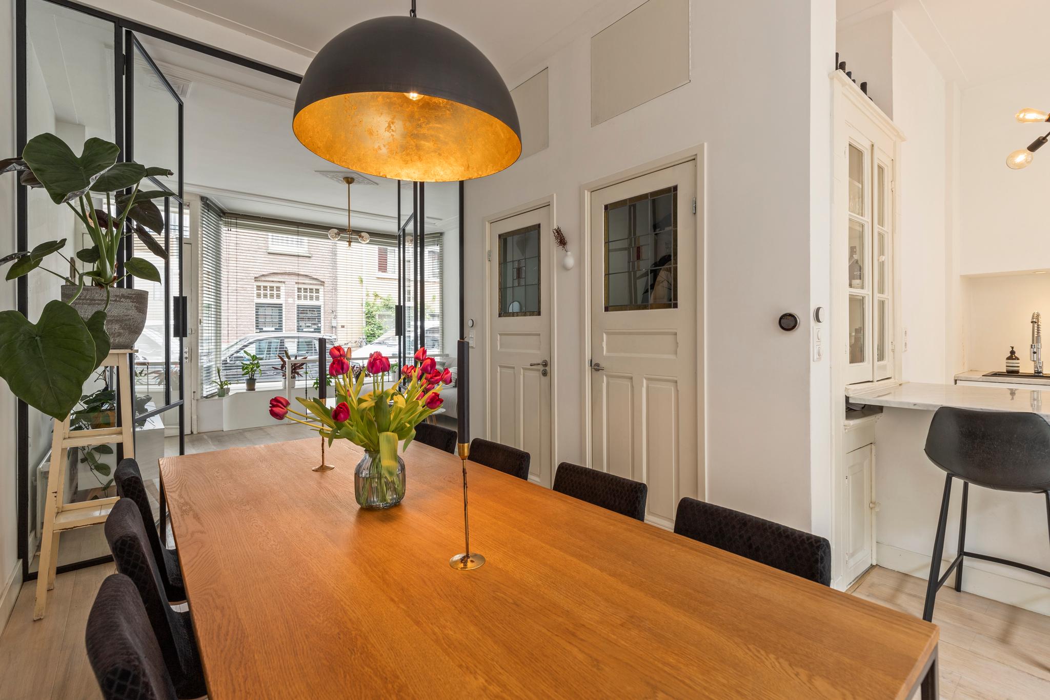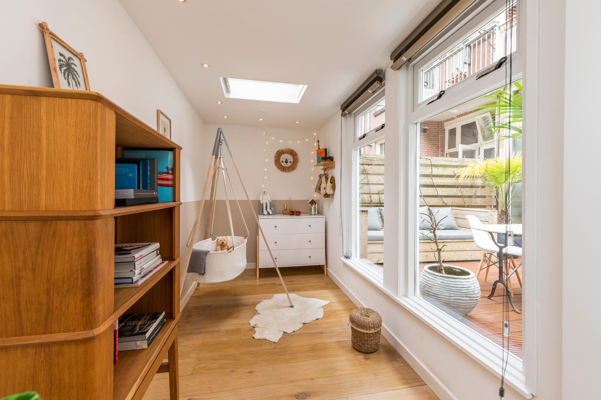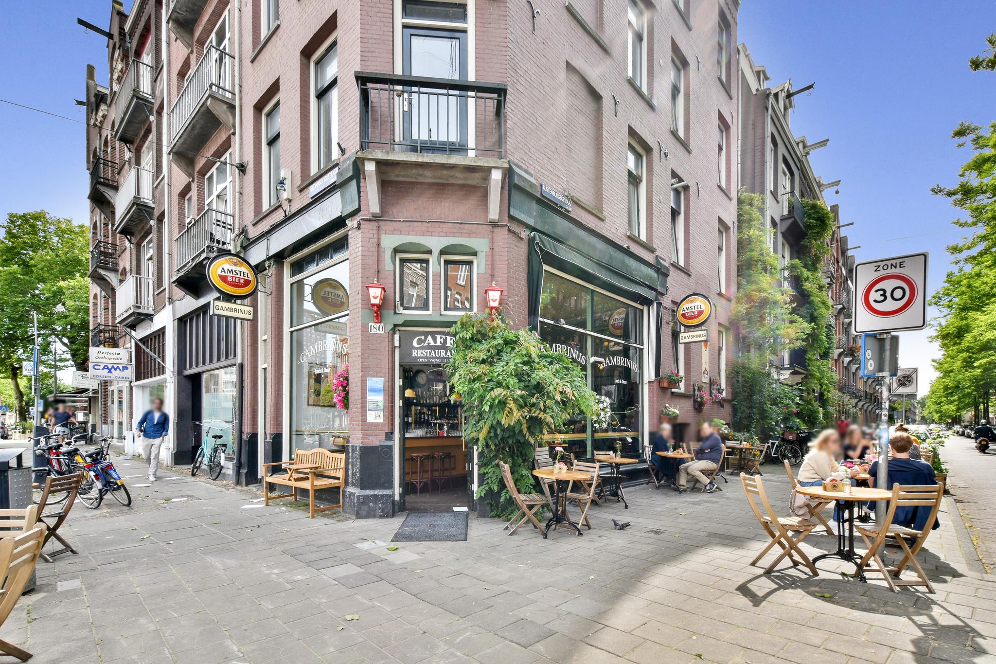 6 m2) are not included in the usable area by the ceiling height <2 m and can therefore be seen as bonus meters.Through its own front door on the first floor you reach the porch and the spacious and bright living room with a ceiling height of up to 3.13 meters consisting of a sitting and dining area with a beautiful traditional stove. The two rooms are separated by modern steel doors which form a nice contrast with the characteristic details such as the stained-glass windows.The fully equipped open kitchen includes a 5-burner stove and oven (Smeg), a dishwasher (Bosch), an American fridge (Samsung) and a marble worktop. Next to the kitchen is a utility room with a washer / dryer (Miele). Through this utility room is the (bed) room with closet at the rear to reach. The cozy patio of approximately 14 m2 is located on the northwest and is accessible through double doors from the living room and utility room.The luxurious bathroom has a large shower, underfloor heating, mirror heating and a double sink with cabinet. The extra bedroom is located in the basement, has a custom-made closet with also a separate storage room and a separate toilet with washbasin.The apartment is located on a quiet street in the middle of the vibrant De Pijp district, around the corner from the Sarphatipark, the cozy Gerard Douplein and Van der Helstplein with plenty of good restaurants and cafes. The Albert Cuyp market is just steps away. The property is easily accessible by public transport, Amsterdam Amstel is at 5 minutes cycling distance and by car you will reach the A2 and A-10 ring road in no time. DETAILS- Usable area living approximately 71,1 m2 plus 23,6 m2 'other indoor space' in the basement because of the height under the beams <2 meter (according to NEN2580);- Tastefully renovated in 2017 with retention of characteristic details;- Patio / garden of 14 m2 with evening sun;- Ceiling height of > 3 meters;