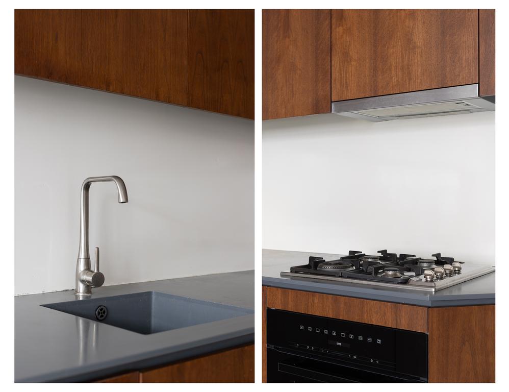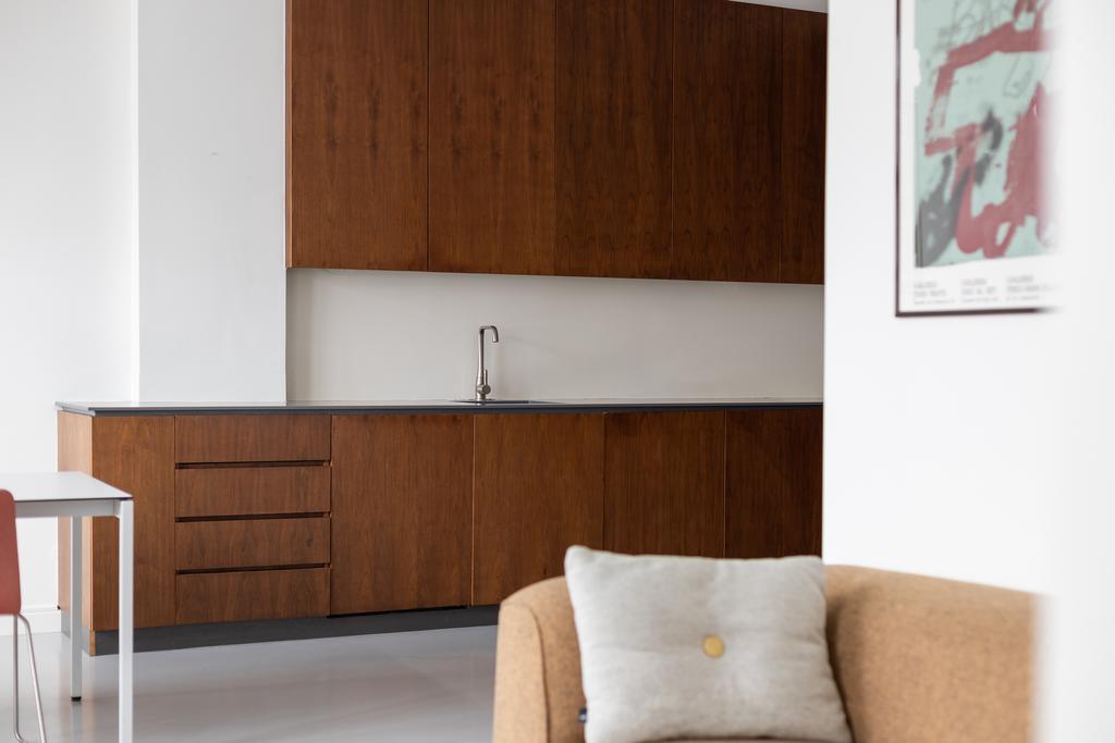 – At the front side of the apartment, there is a large and bright kitchen, living room and study. The modern, open-plan kitchen is equipped with all needed appliances.