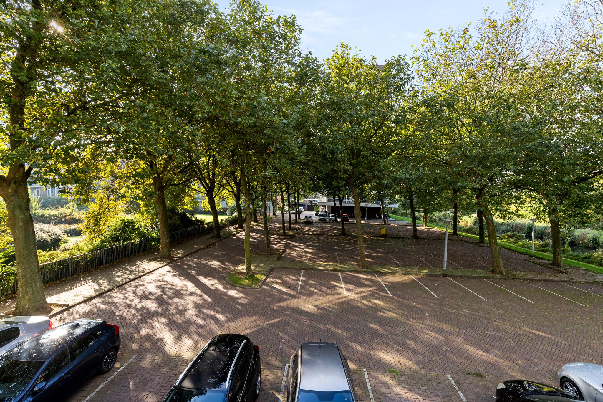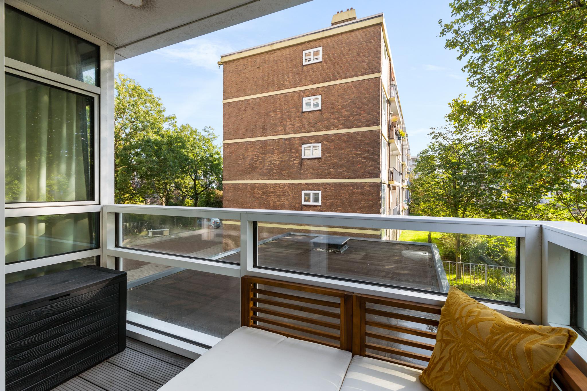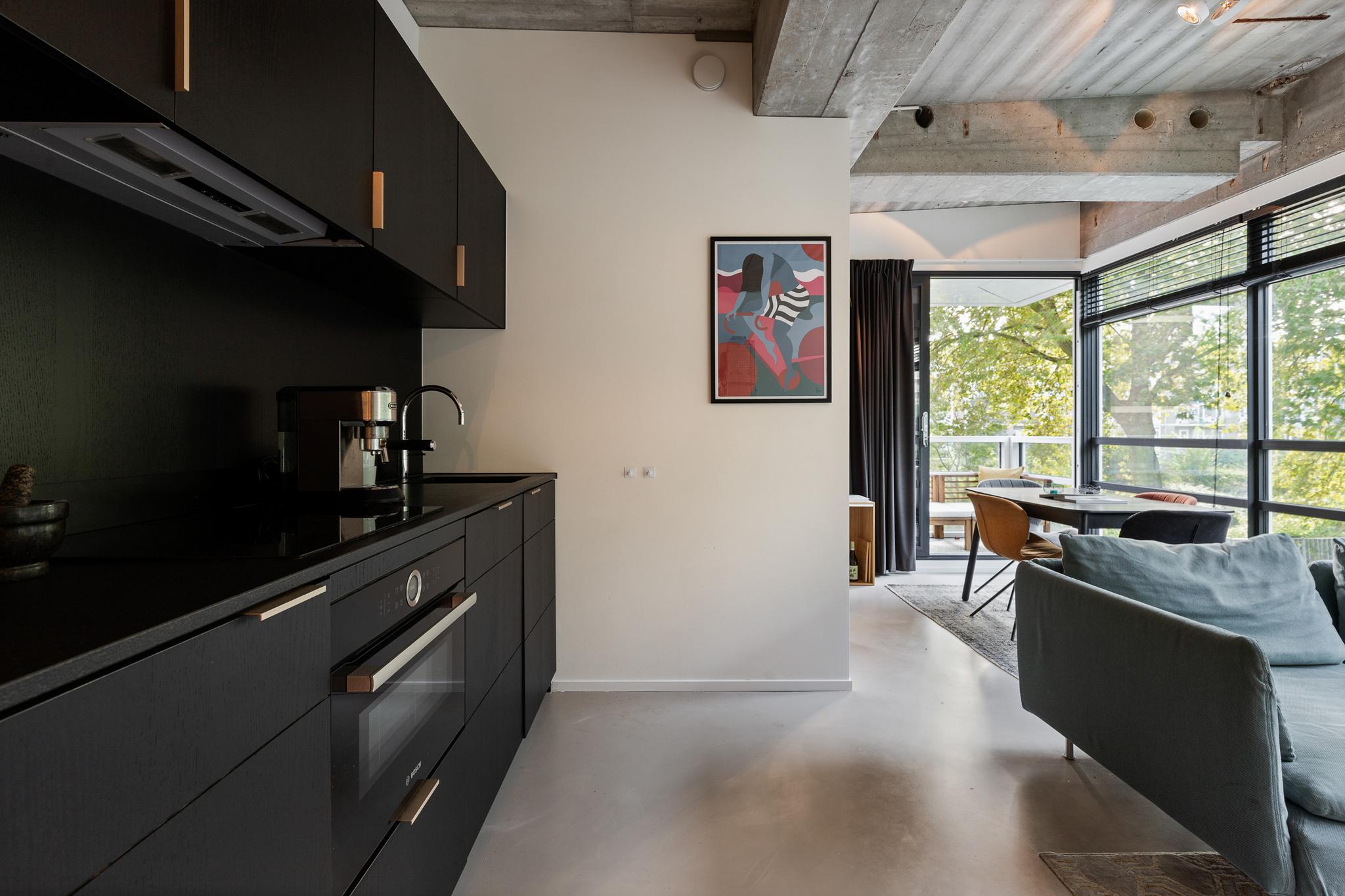 The pleasant living room features a modern open kitchen with built-in appliances, including a dishwasher and a Quooker. The room is very bright thanks to the large windows on both sides, providing a wide view of the green surroundings as well. A lovely northeast facing balcony can be accessed from the living room.