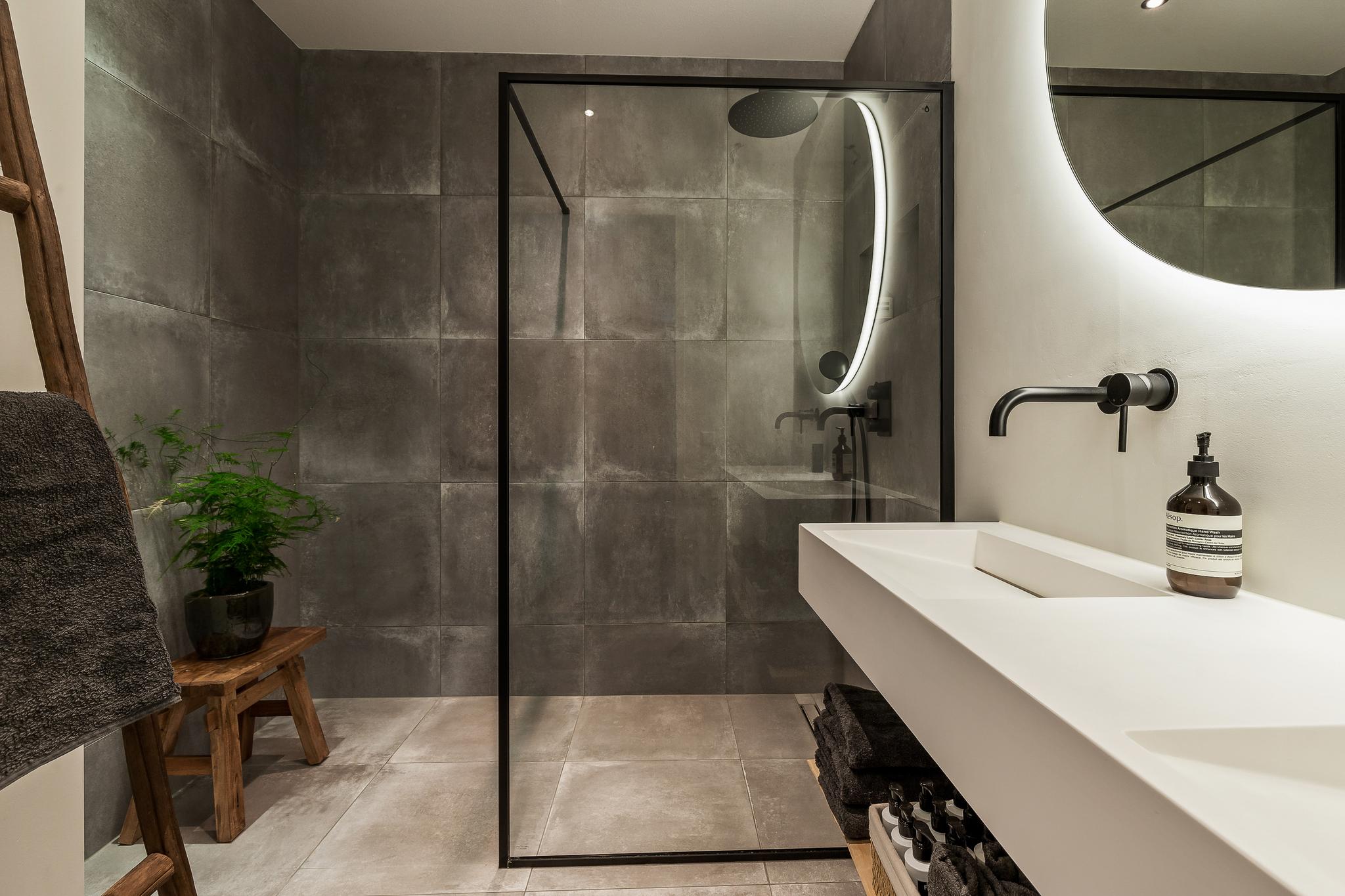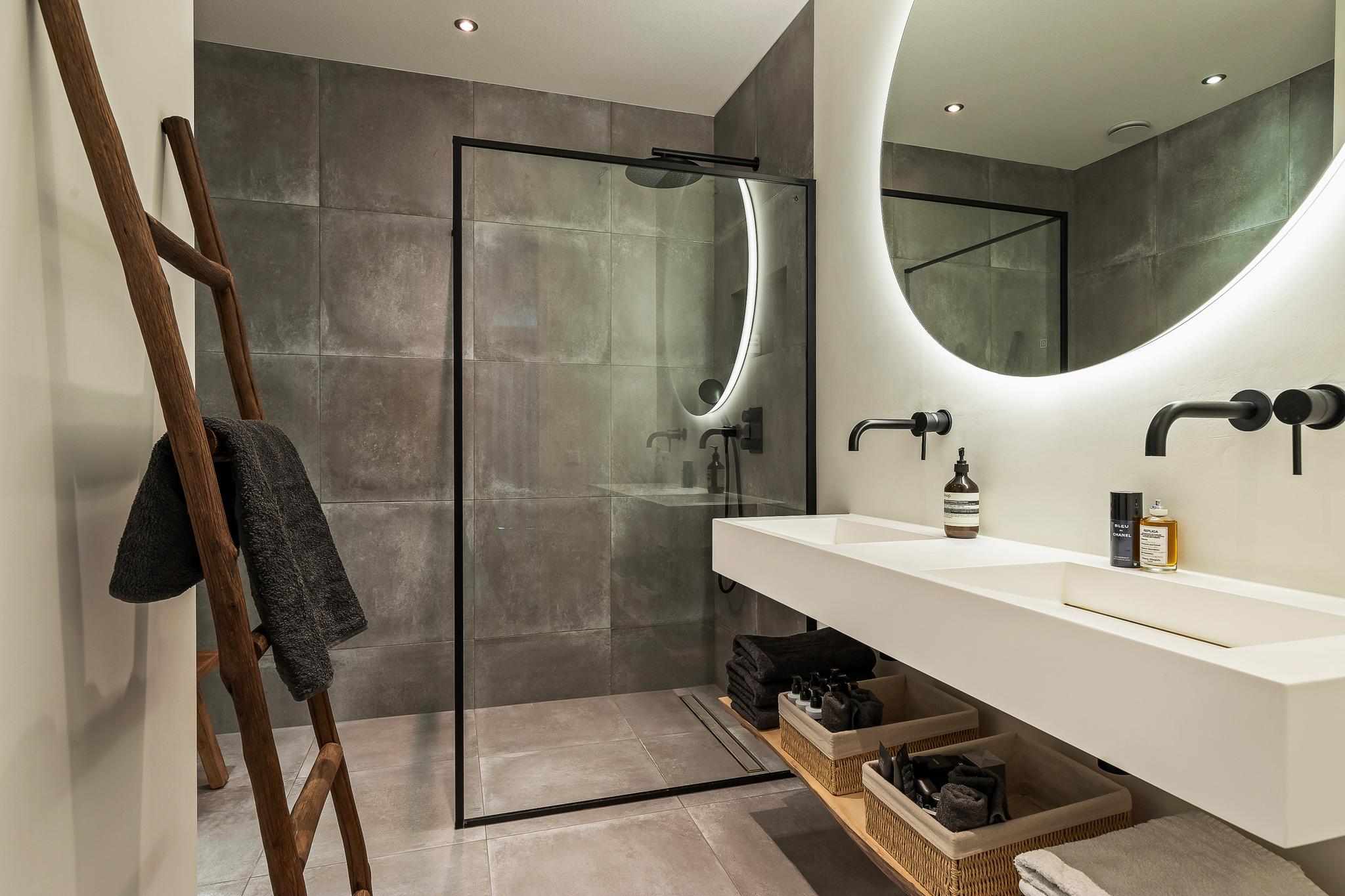 The modern bathroom is equipped with a rain shower and a double sink. There is a separate toilet. Furthermore, there is a storage room in the hallway with washer and dryer connections.