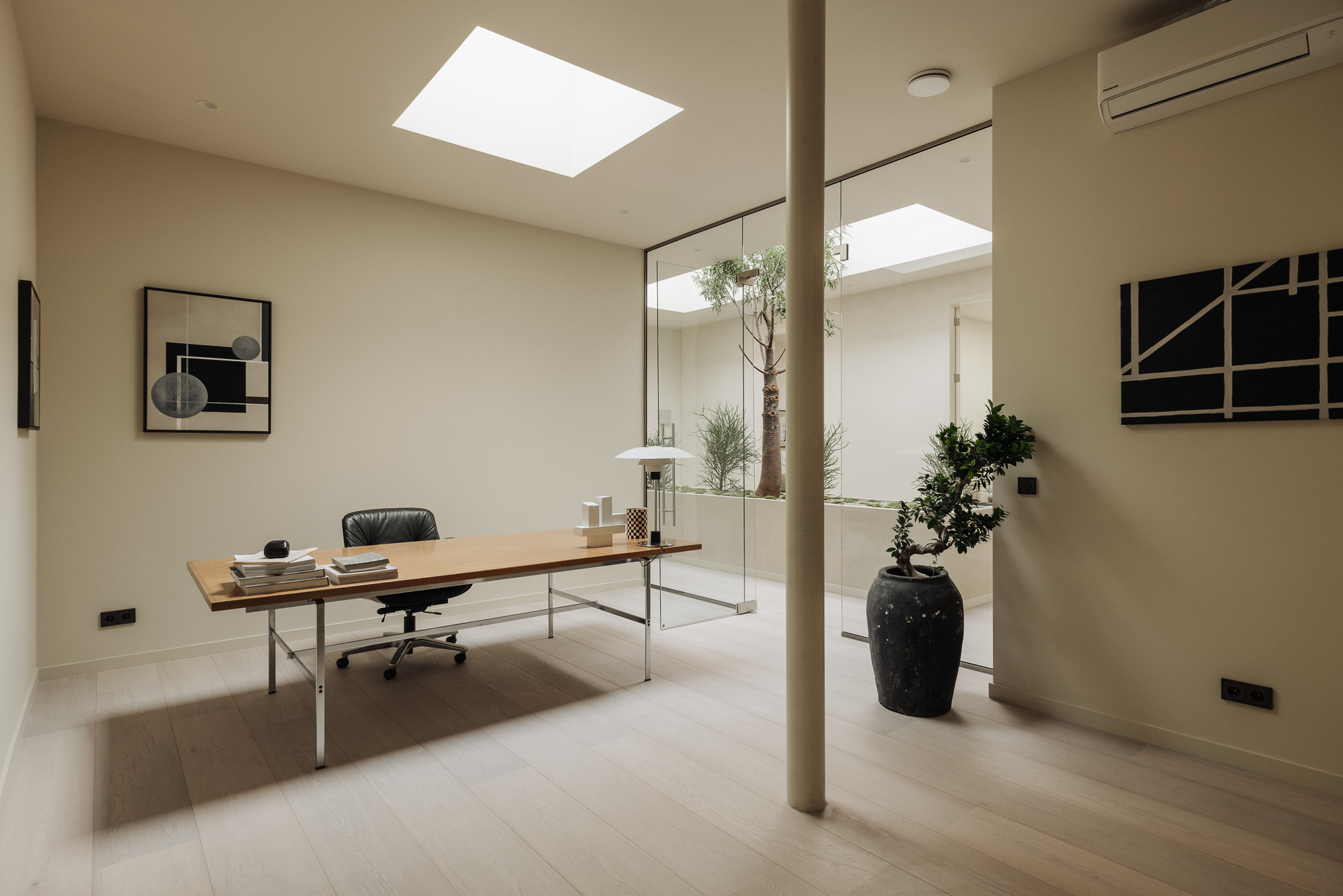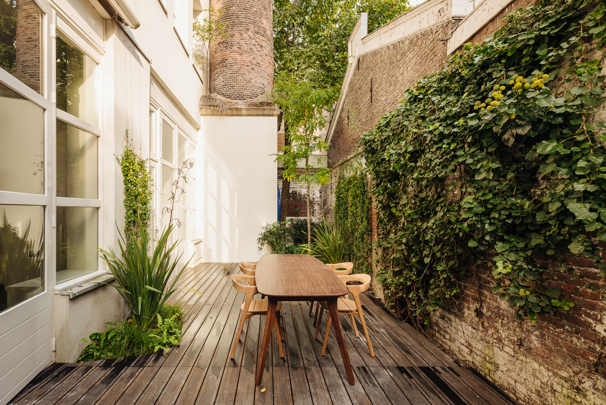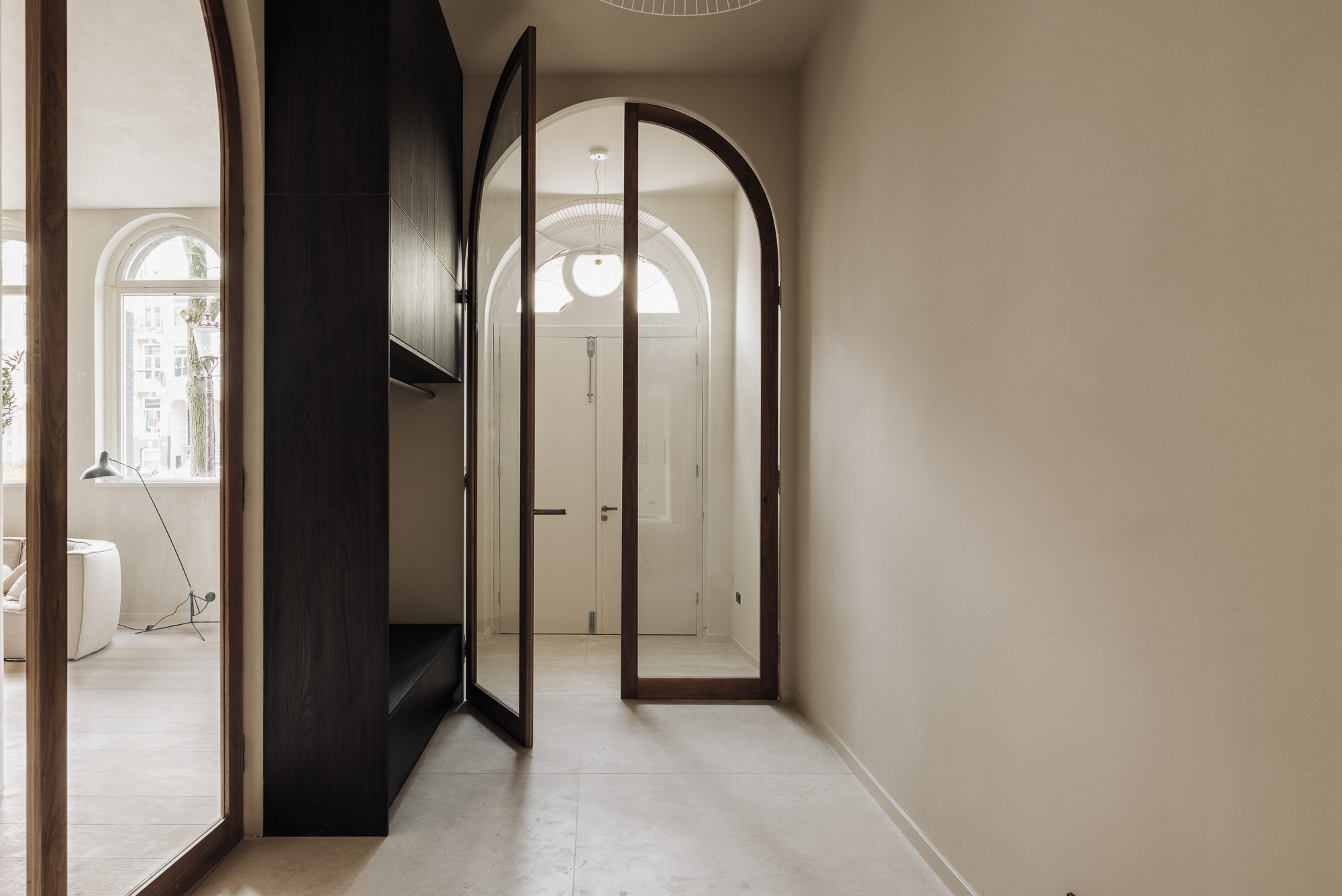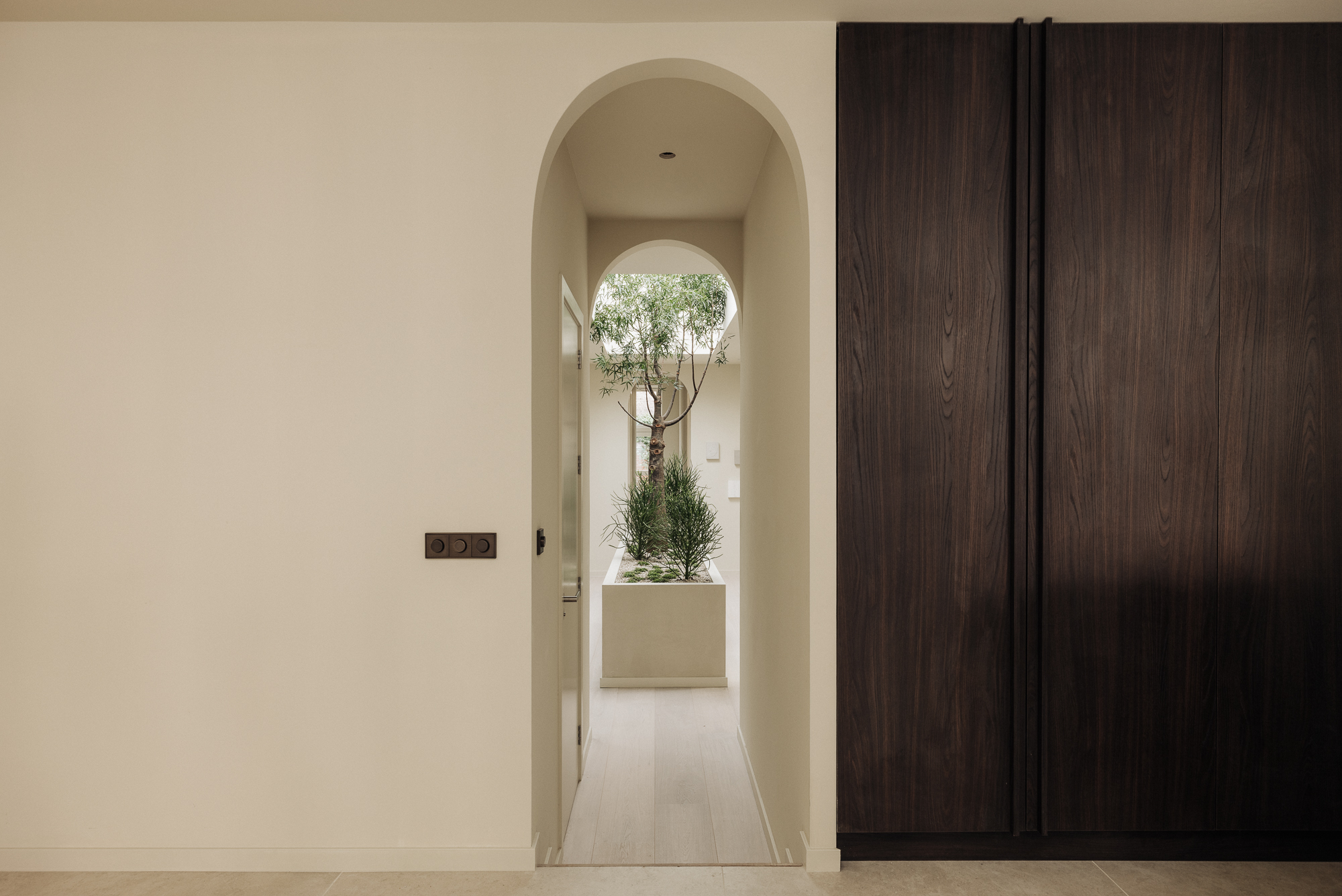Set in a former diamond polishing factory dating from the 19th century, now deemed a municipal listed monument. The stately front entrance door leads into the spacious hallway. The many windows with round arches in the front façade fit seamlessly with the round arches that have been created in the home’s interior. Not to miss: the exceptionally high ceilings (up to 3,57 meter in the living), which, combined with the six windows at the front, let in an abundance of natural light. More light flows inside through the large skylight in the center of the house, letting sunlight shine right onto the bespoke planter where a tree and other greenery grow.