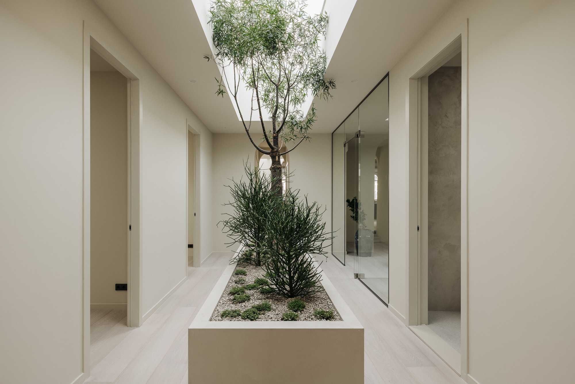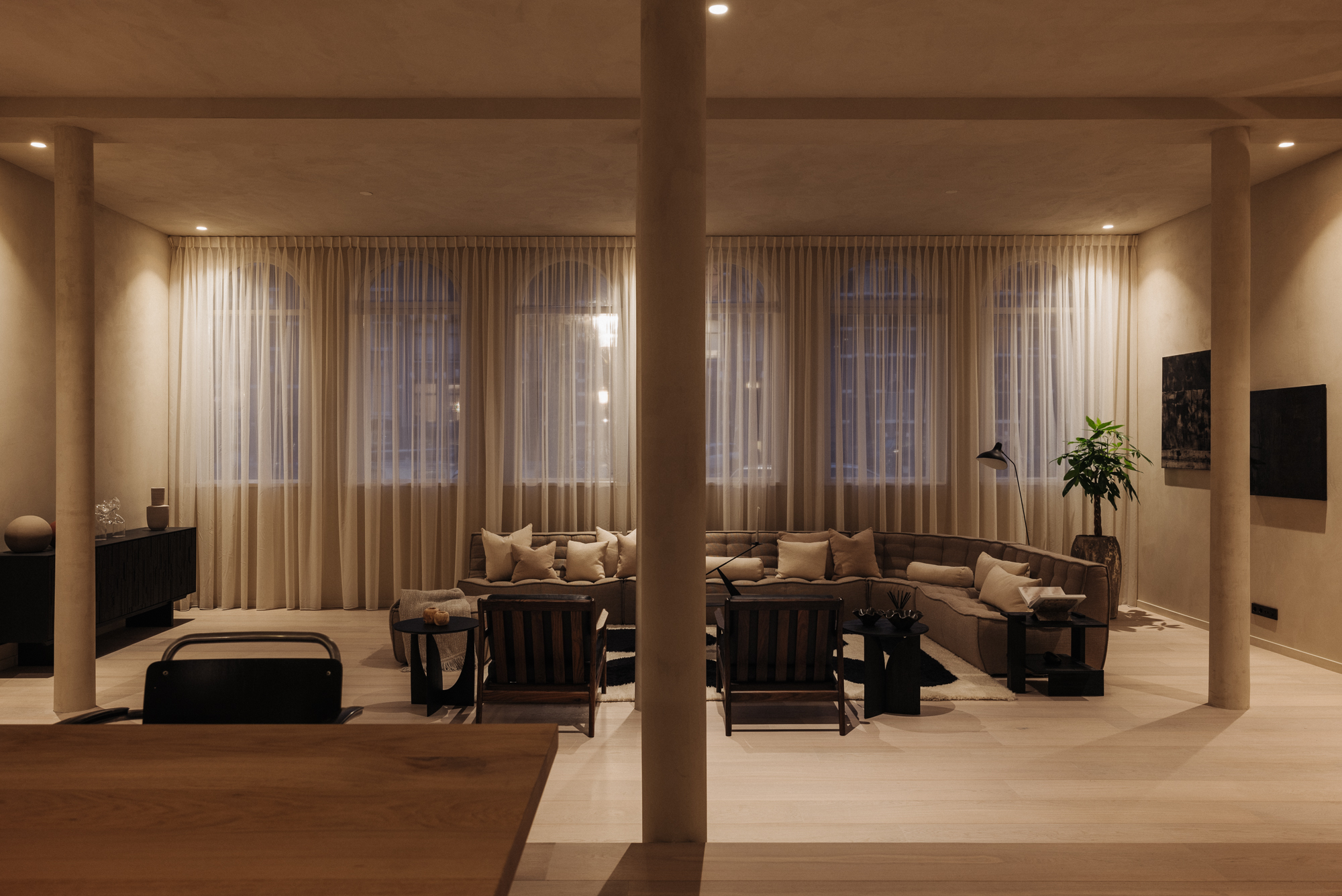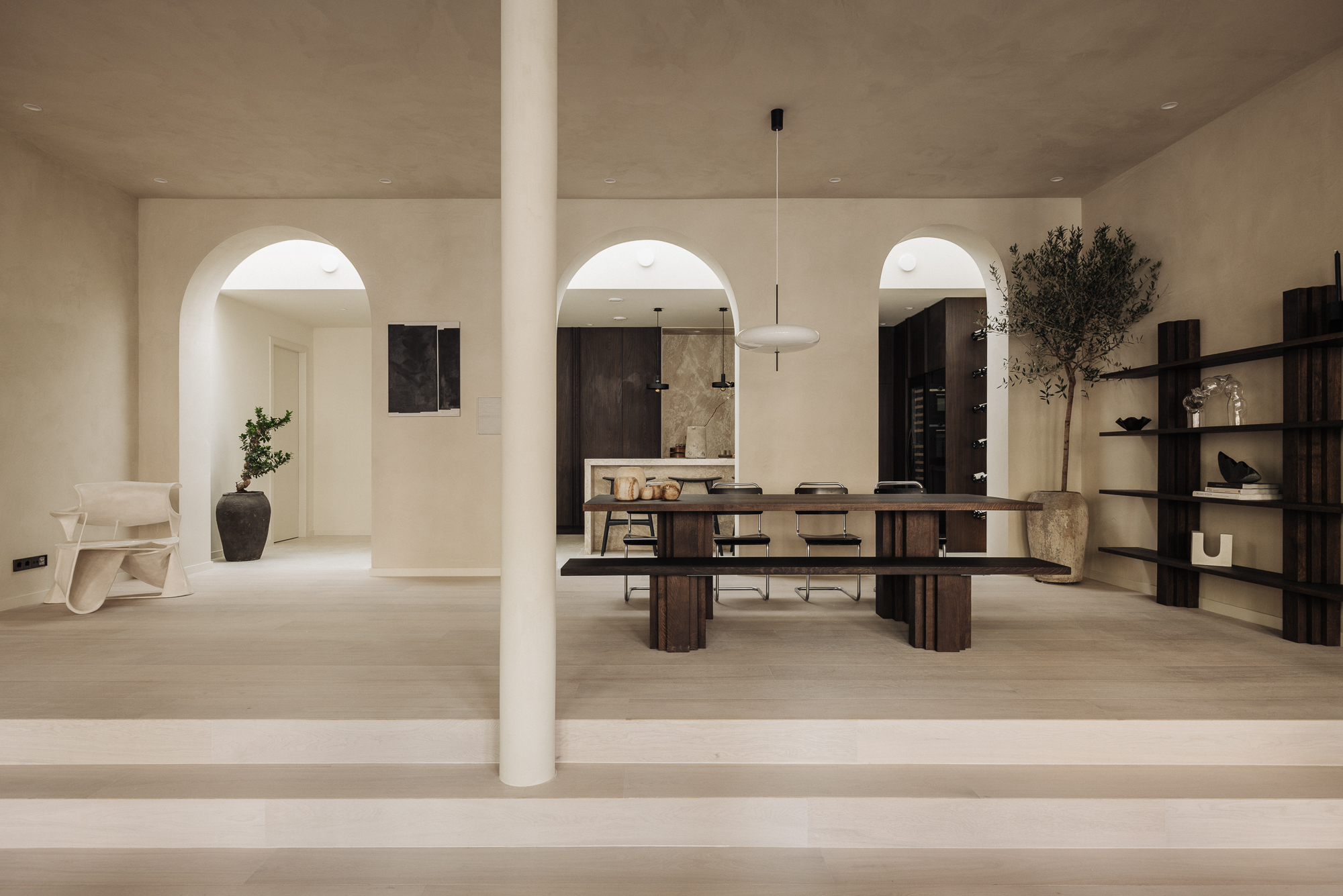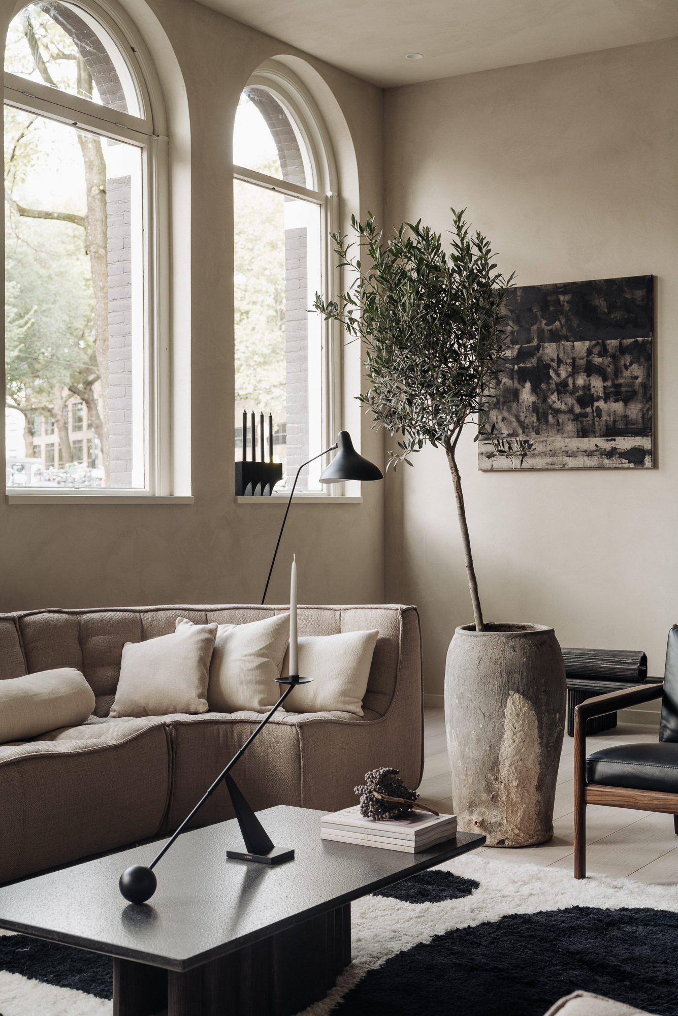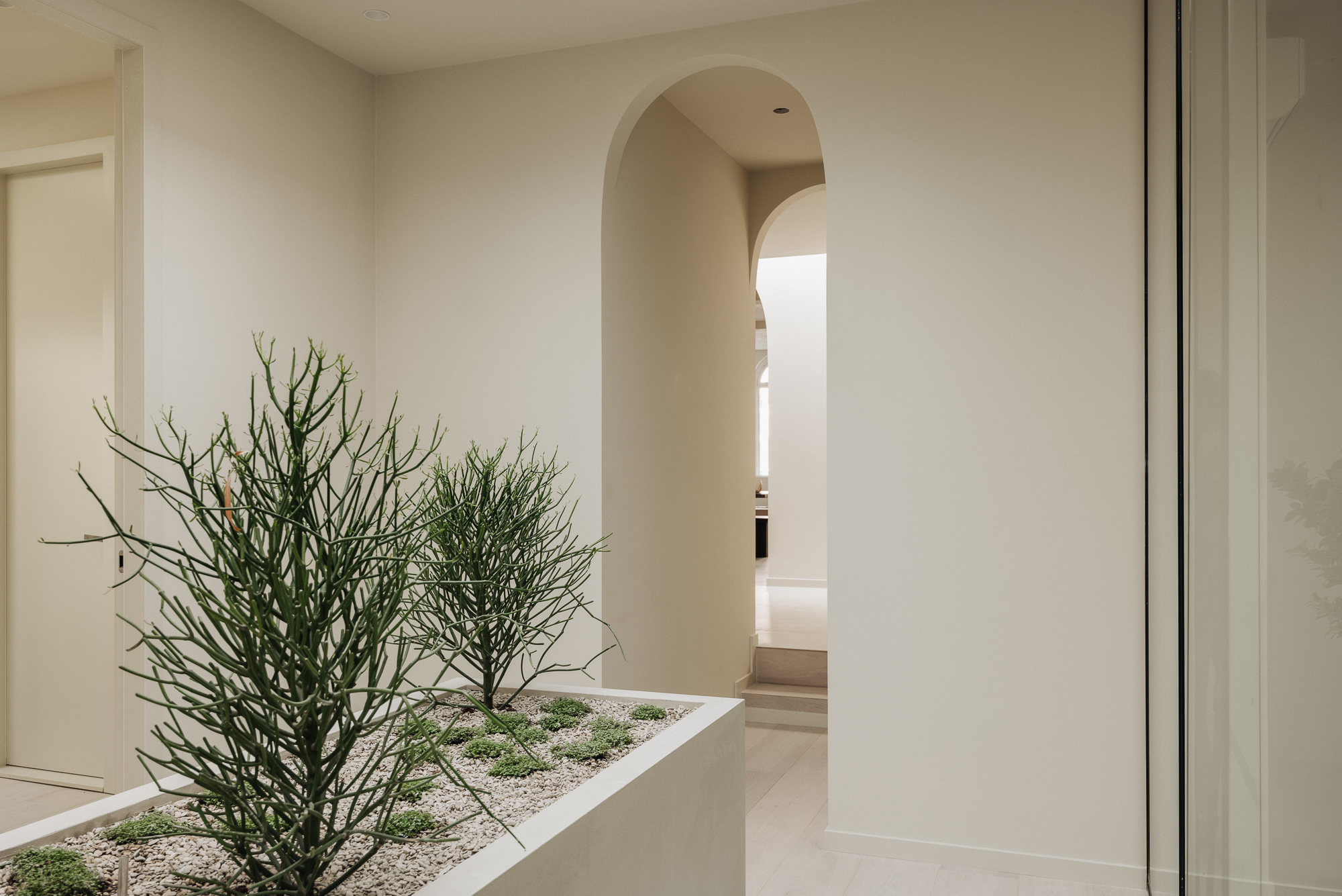 Set in a former diamond polishing factory dating from the 19th century, now deemed a municipal listed monument. The stately front entrance door leads into the spacious hallway. The many windows with round arches in the front façade fit seamlessly with the round arches that have been created in the home’s interior. Not to miss: the exceptionally high ceilings (up to 3,57 meter in the living), which, combined with the six windows at the front, let in an abundance of natural light. More light flows inside through the large skylight in the center of the house, letting sunlight shine right onto the bespoke planter where a tree and other greenery grow.