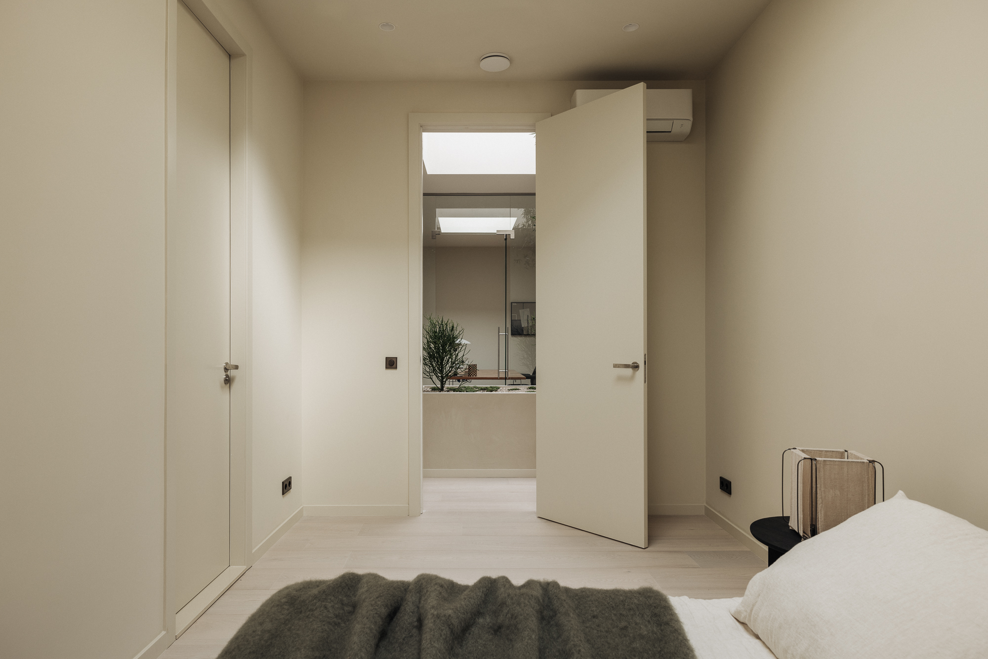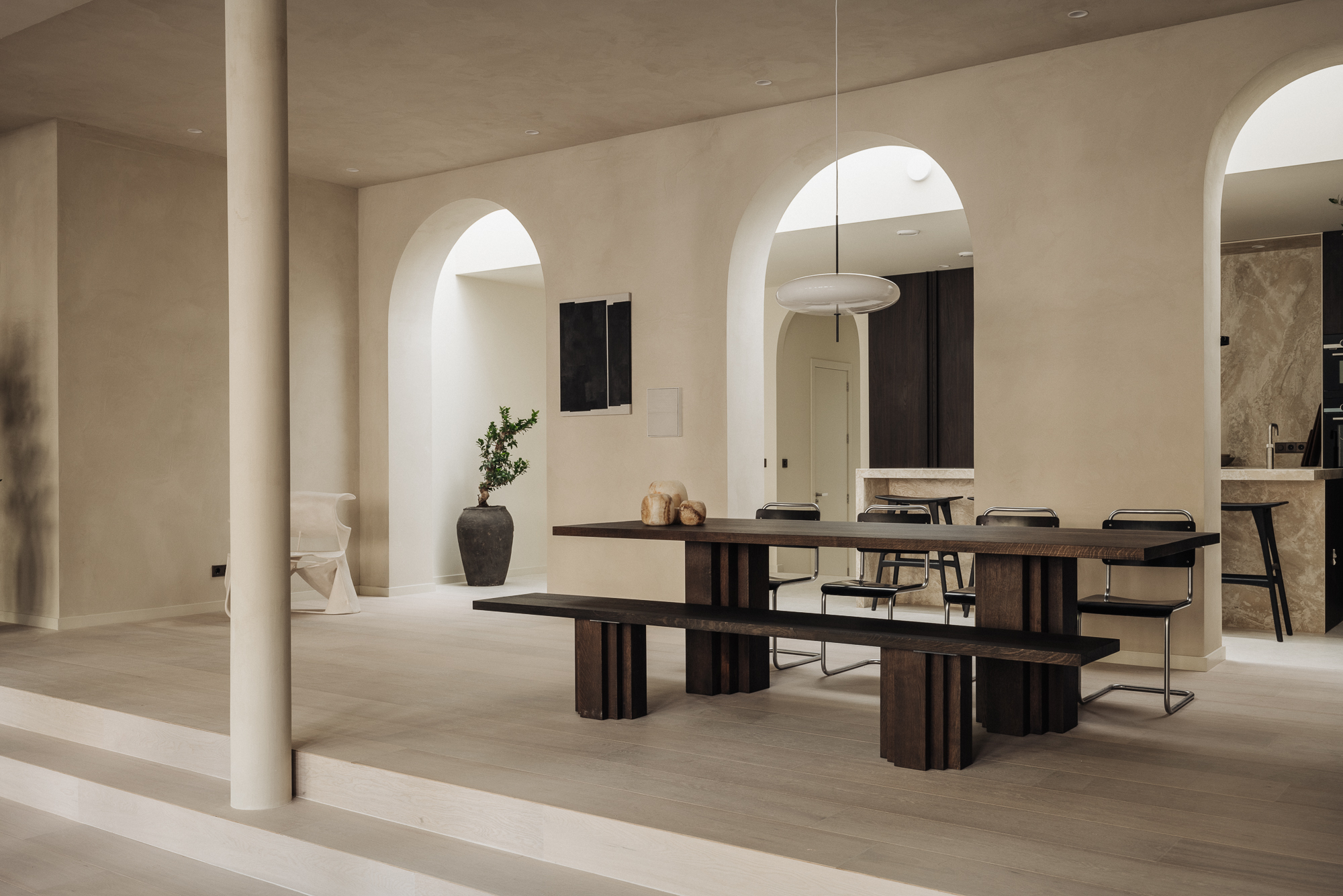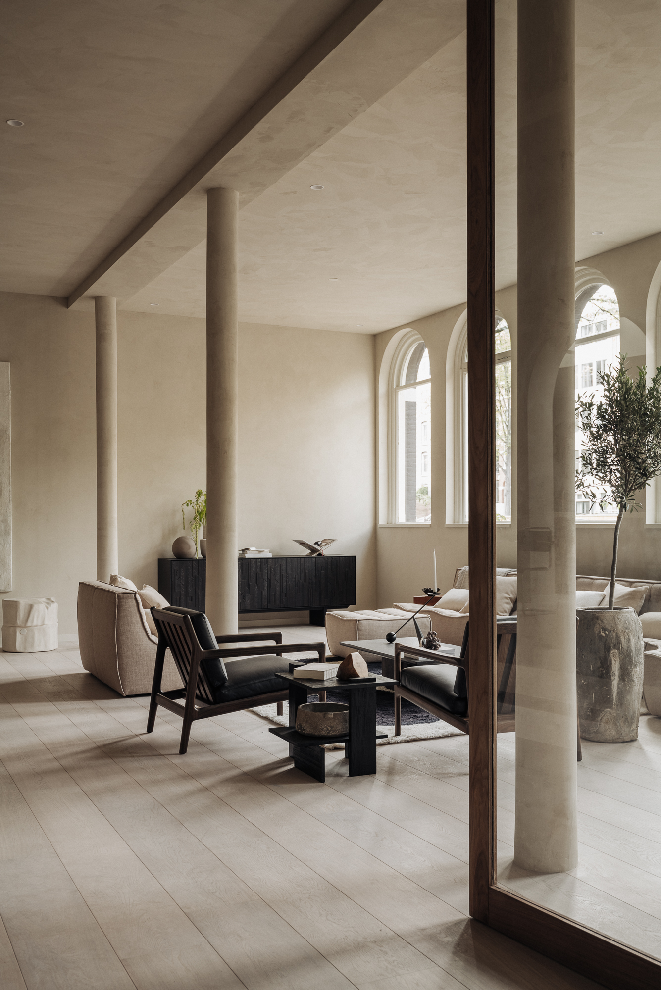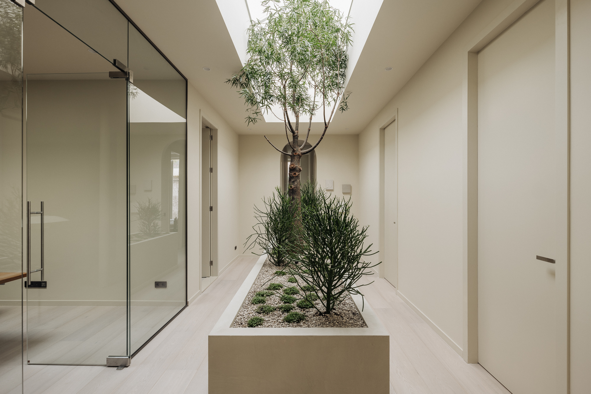 Set in a former diamond polishing factory dating from the 19th century, now deemed a municipal listed monument. The stately front entrance door leads into the spacious hallway. The many windows with round arches in the front façade fit seamlessly with the round arches that have been created in the home’s interior. Not to miss: the exceptionally high ceilings (up to 3,57 meter in the living), which, combined with the six windows at the front, let in an abundance of natural light. More light flows inside through the large skylight in the center of the house, letting sunlight shine right onto the bespoke planter where a tree and other greenery grow.