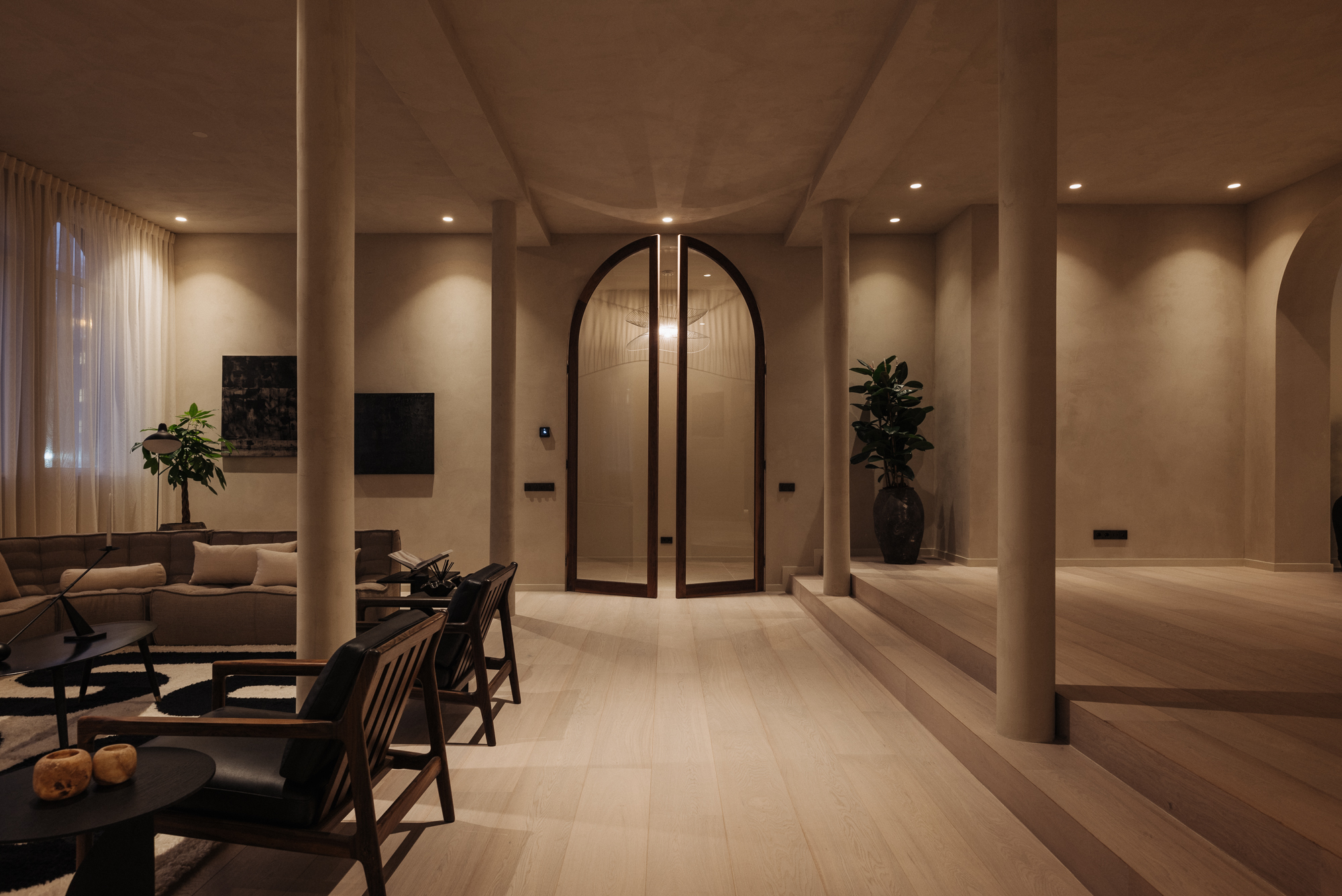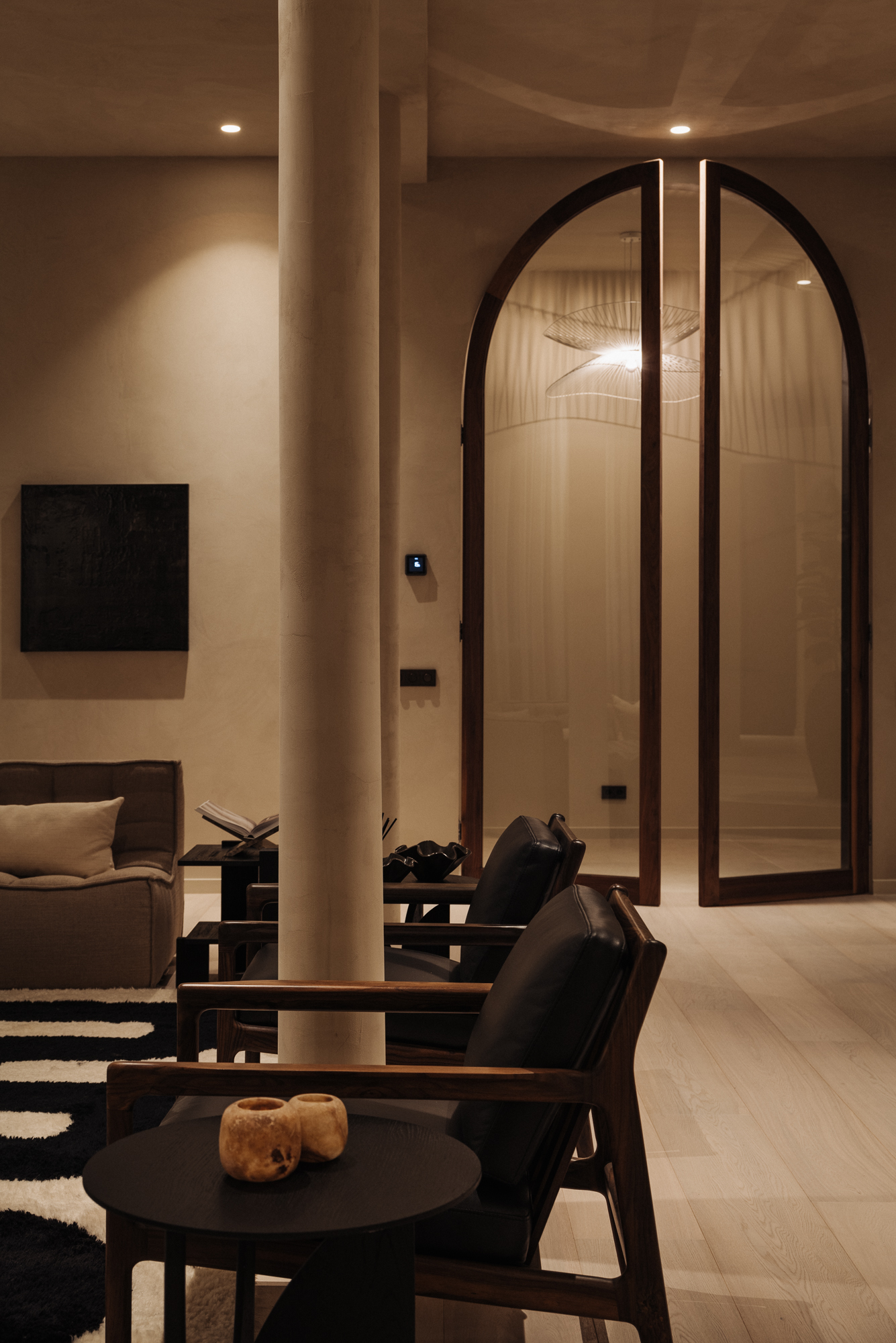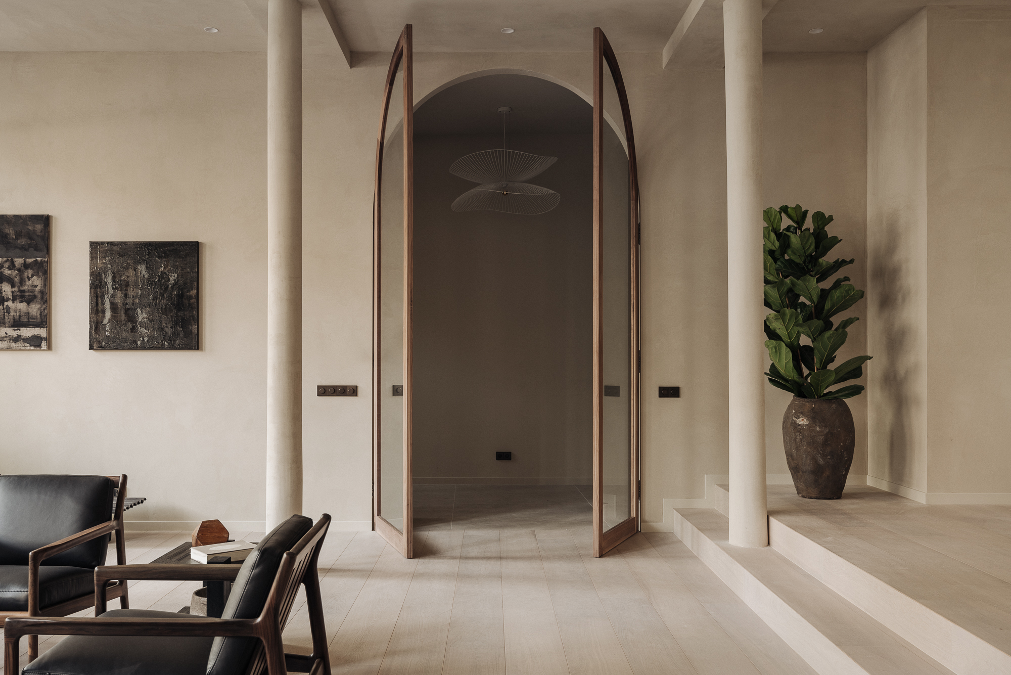 •The large, round arched interior doors are hand-made of solid walnut wood