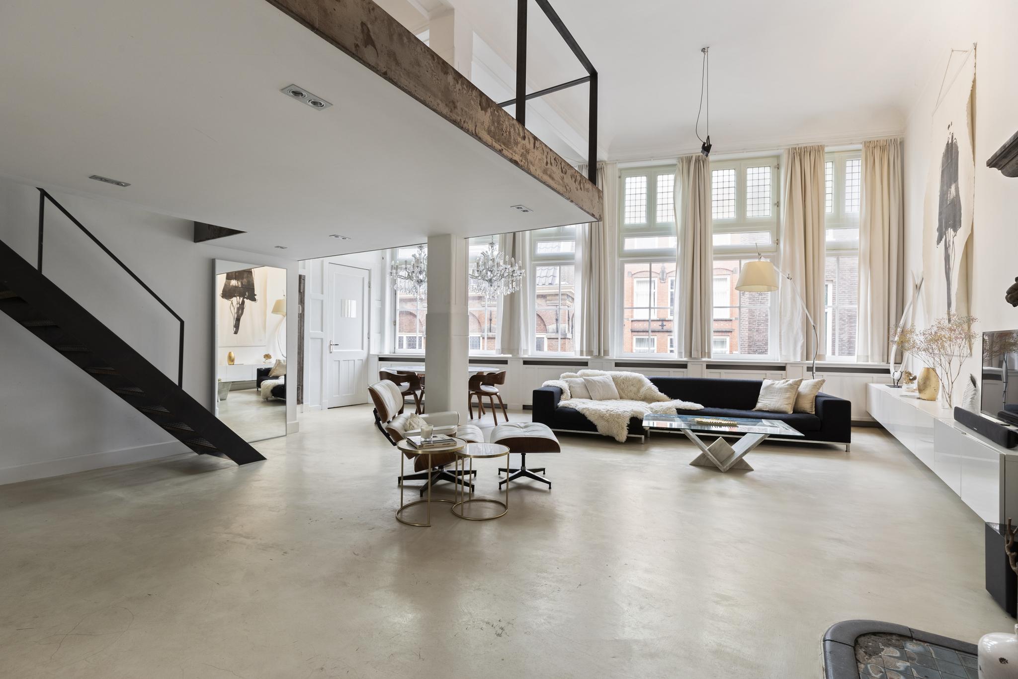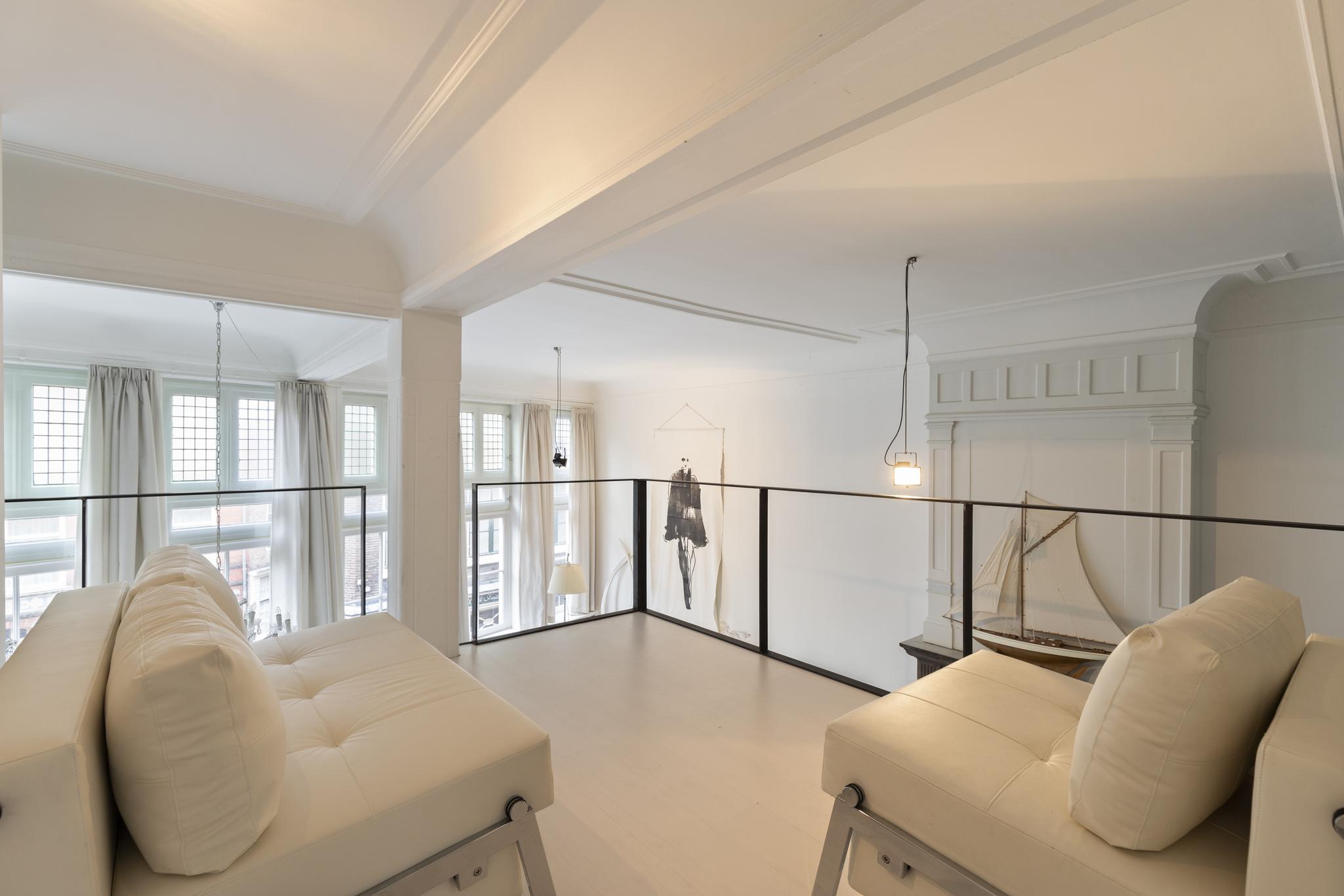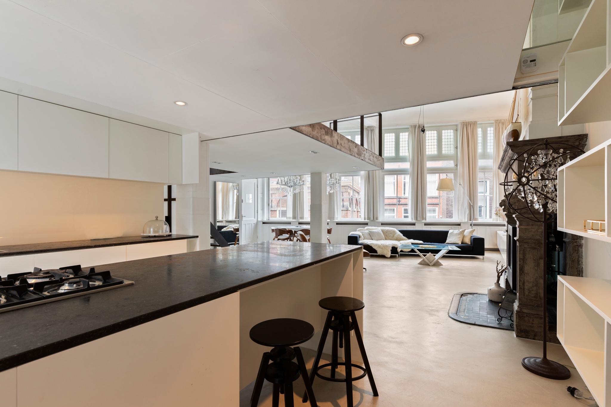 Unique and very bright loft apartment of approx. 110 m2 located in a beautiful monumental building (former liquor distillery and built on the remains of the old Amsterdam castle) in the center of Amsterdam. Inhabited since 1998 and loved for its authentic details such as a façade stone above the front door, a beautiful large fireplace, ornamental ceilings of almost 5 meters high, large windows with stained glass, a unique view, and an original bank vault.