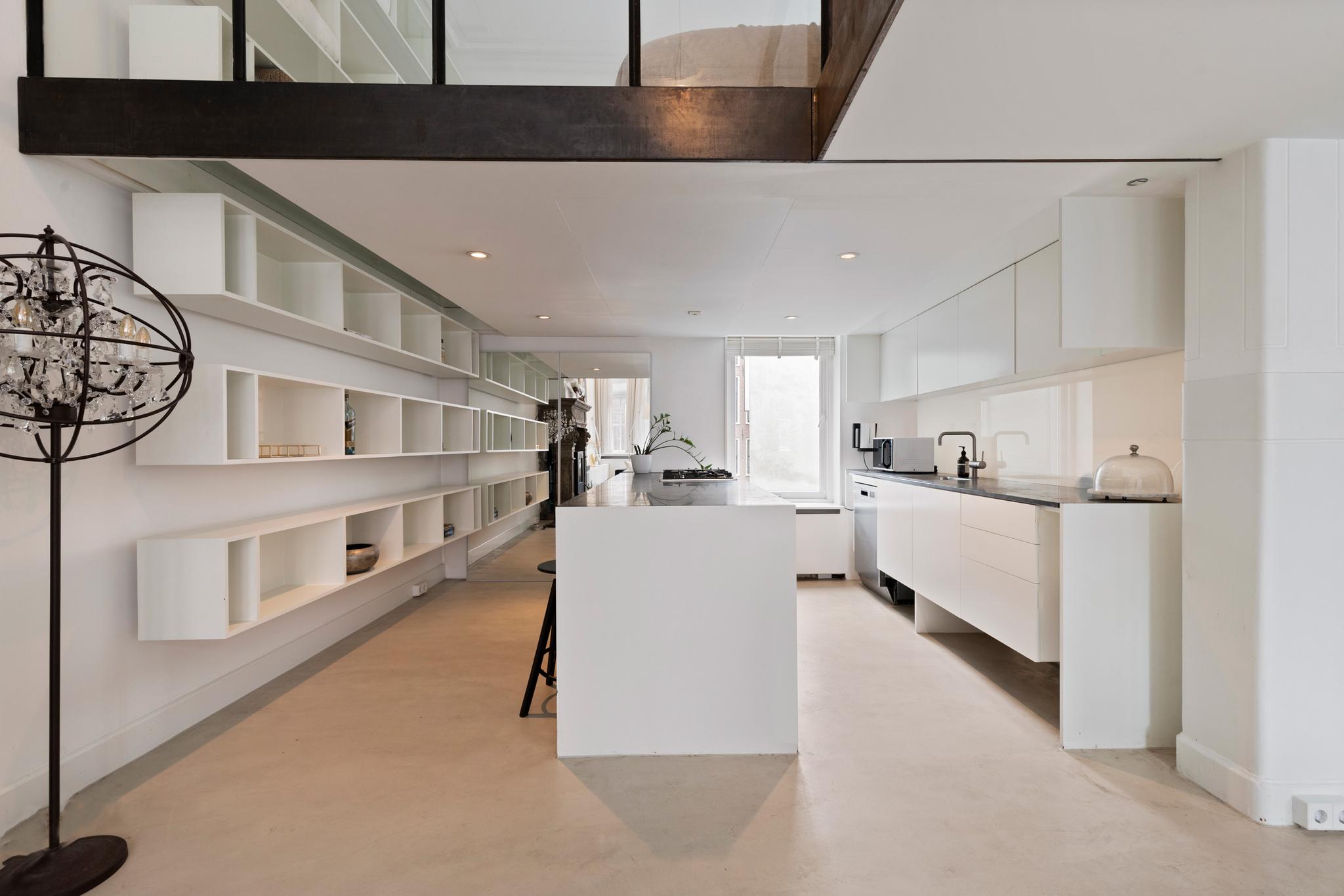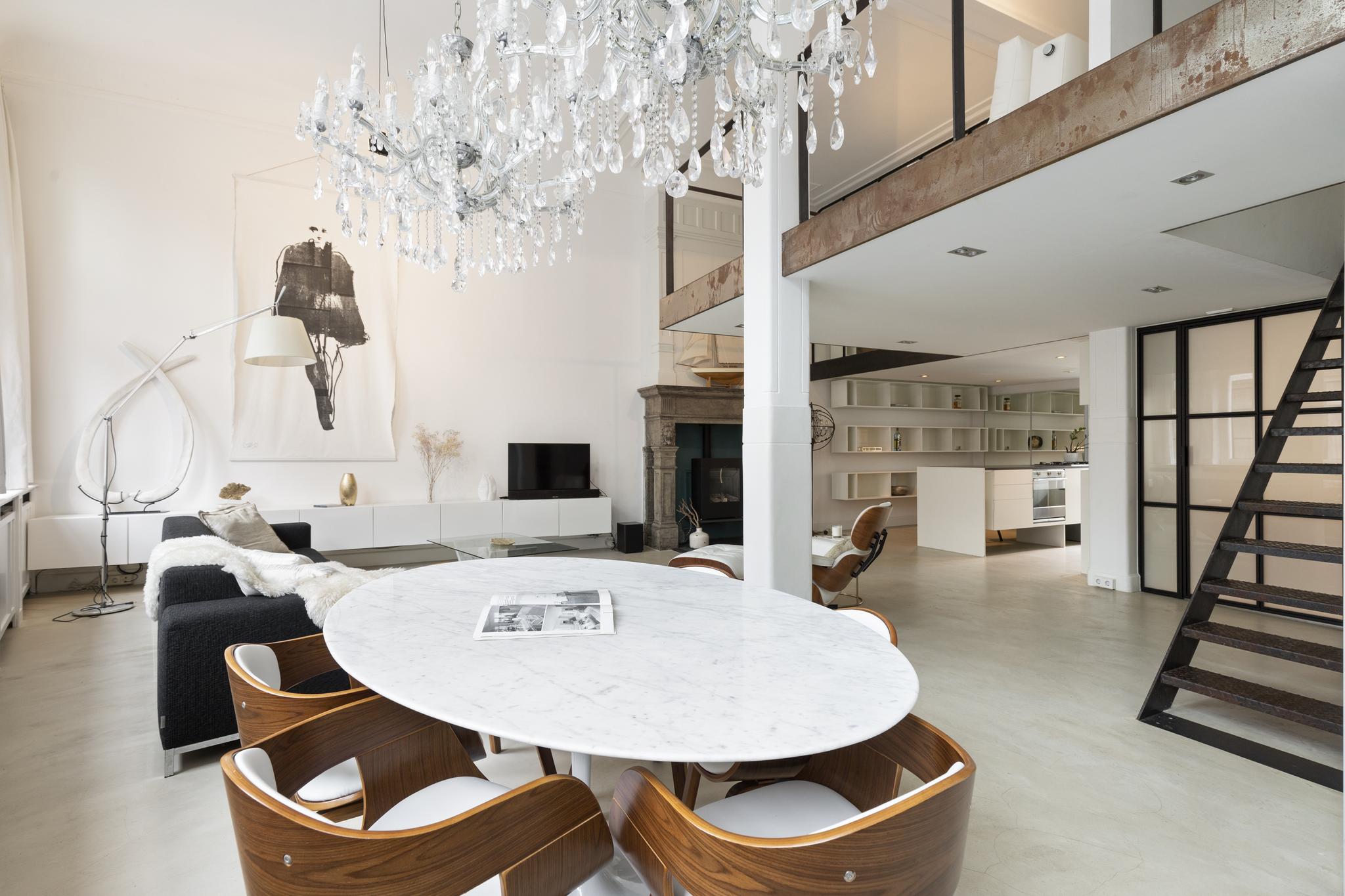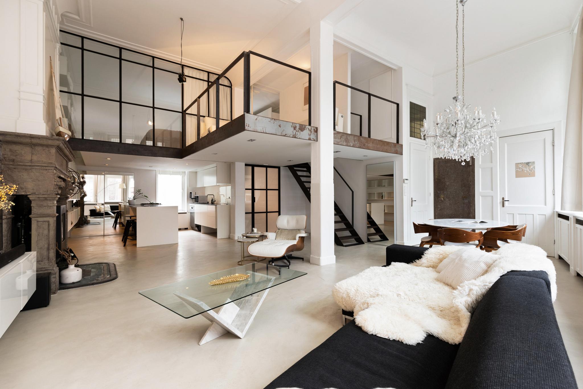 Unique and very bright loft apartment of approx. 110 m2 located in a beautiful monumental building (former liquor distillery and built on the remains of the old Amsterdam castle) in the center of Amsterdam. Inhabited since 1998 and loved for its authentic details such as a façade stone above the front door, a beautiful large fireplace, ornamental ceilings of almost 5 meters high, large windows with stained glass, a unique view, and an original bank vault.