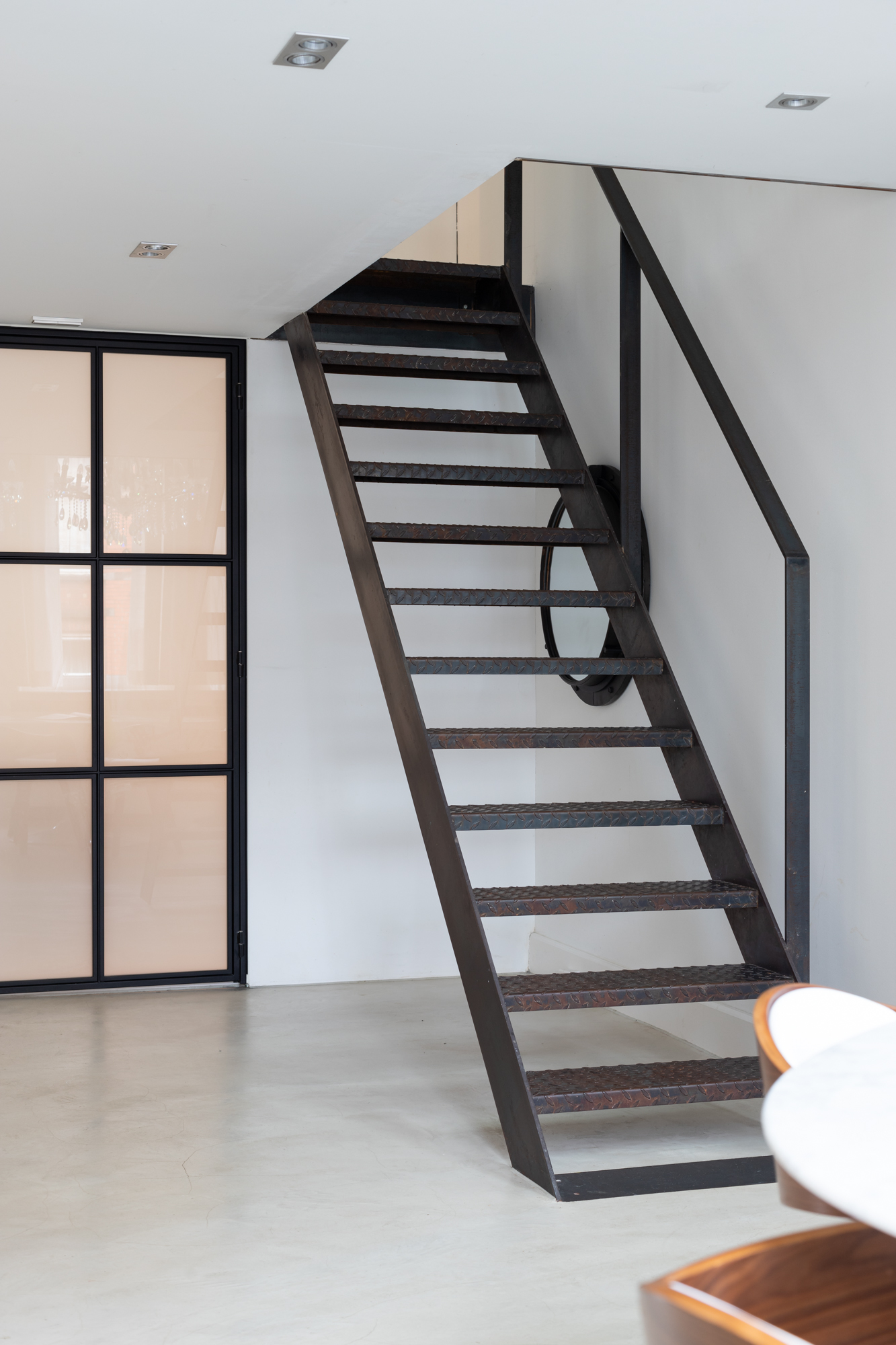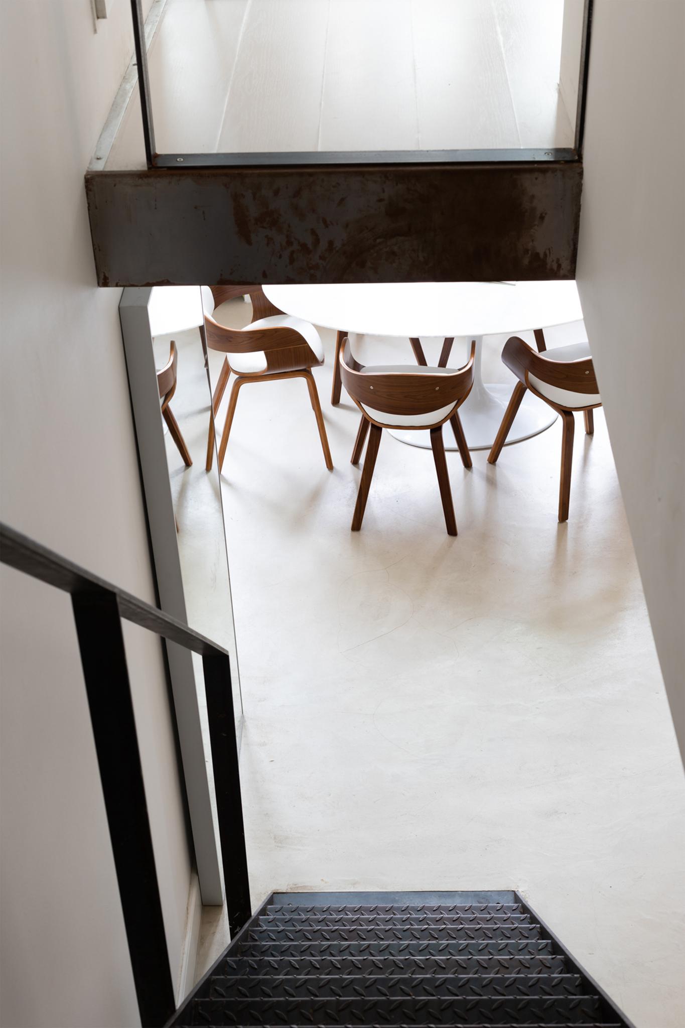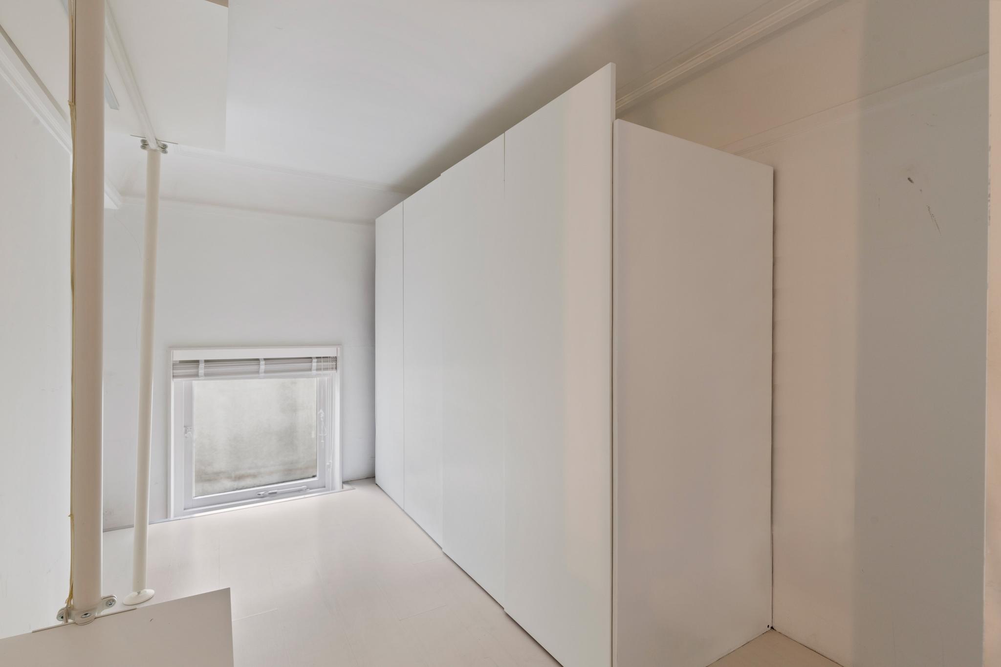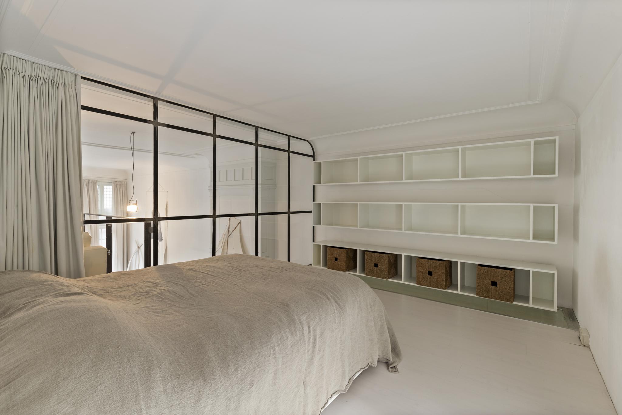 The modern steel staircase leads up to the top floor. Here you will find the bedroom with custom-made walk-in closet, an extra room that can be used in different ways (think lounge, study, or nursery), and a separate (spacious) storage room with washer & dryer connections.