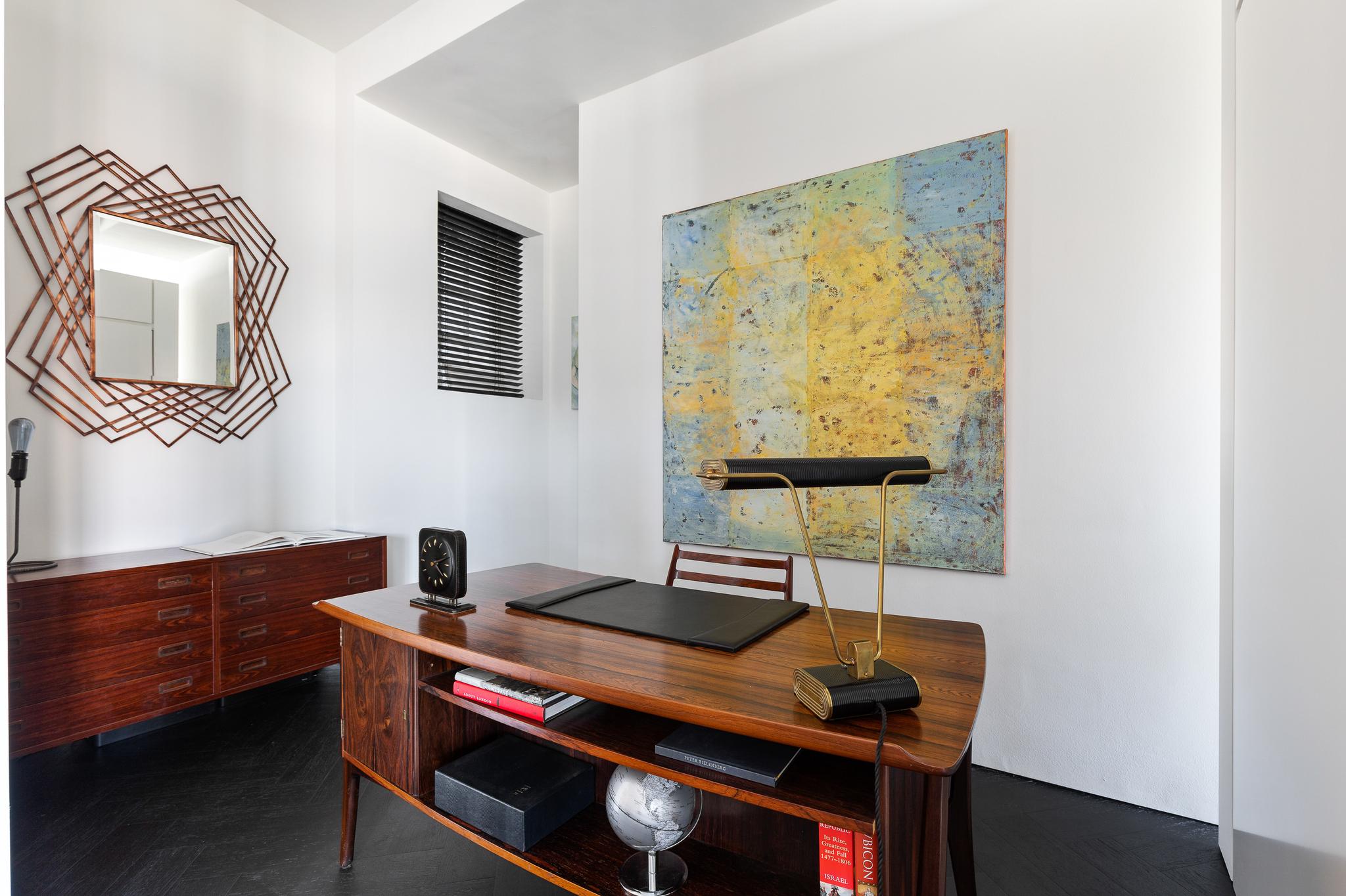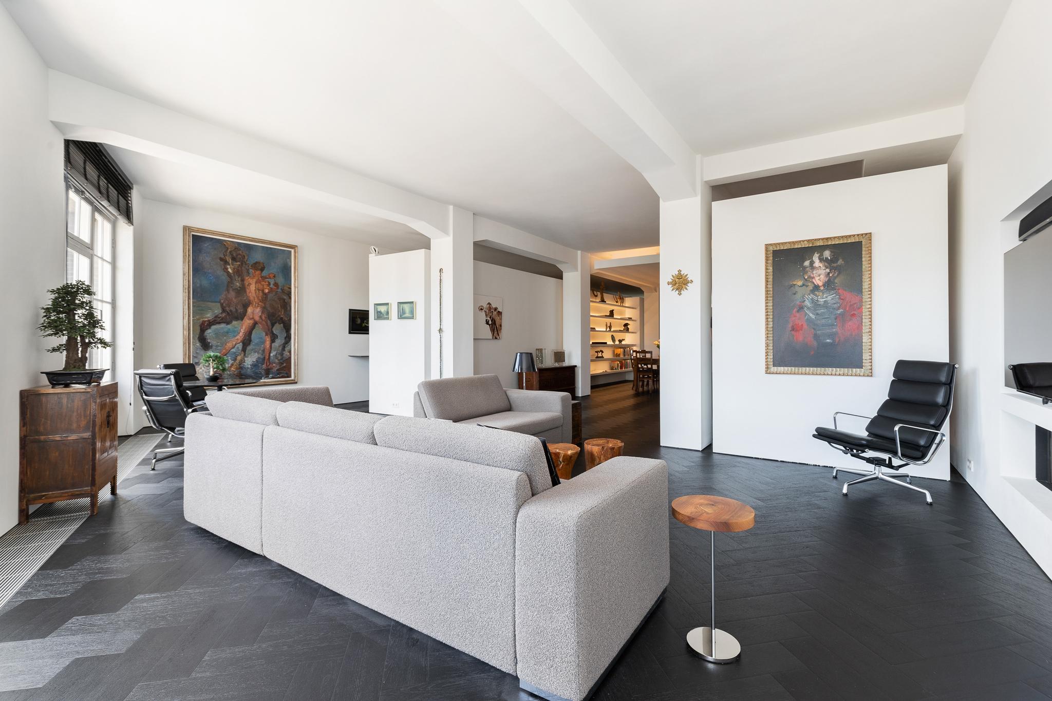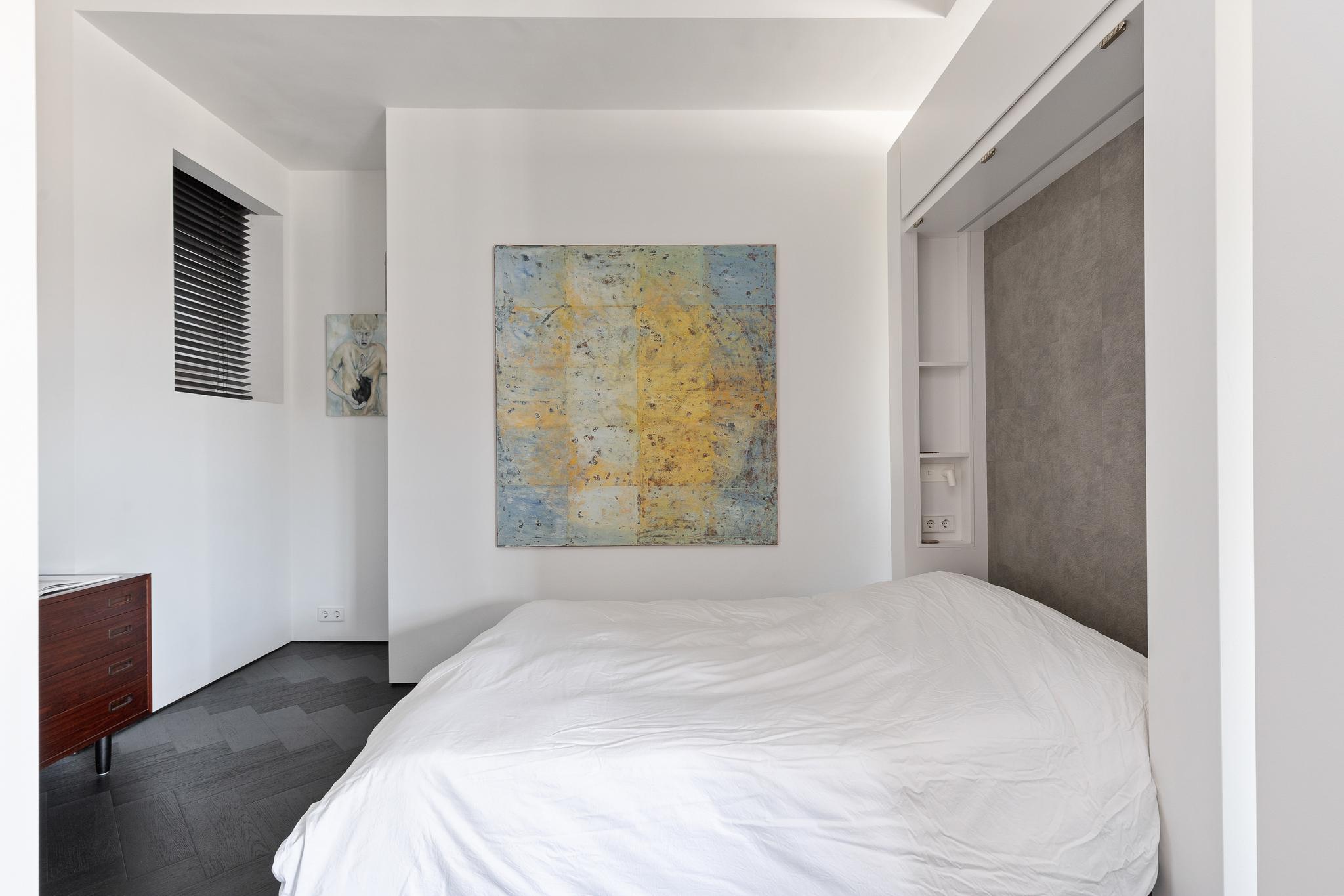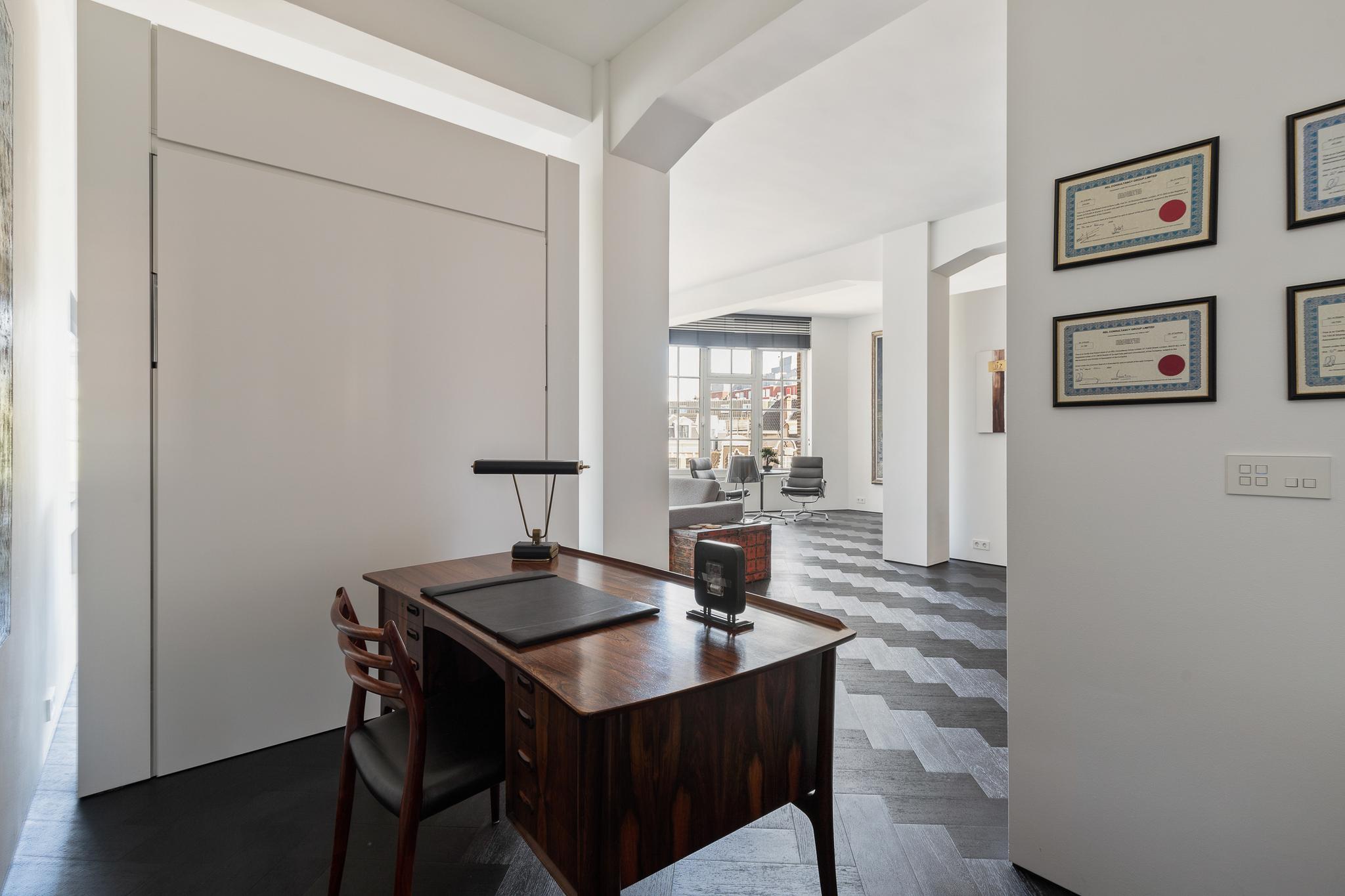The beautiful, recently renovated central Art Deco hall with its marble stairs takes you to the communal staircase. The apartment on the second floor can be reached by stairs or by lift. The lift takes you directly into the property. The first thing that strikes you about this loft apartment is the spacious open-plan layout, the high ceilings and the large windows providing oceans of daylight from both sides. The ‘floating’ wall design also stands out immediately. The living area and kitchen are at the front of the property. There is also an office/study area, which is partially screened off by a freestanding dividing wall. This wall features a fully collapsible double bed and the area could easily be converted into a full-fledged extra bedroom if required.