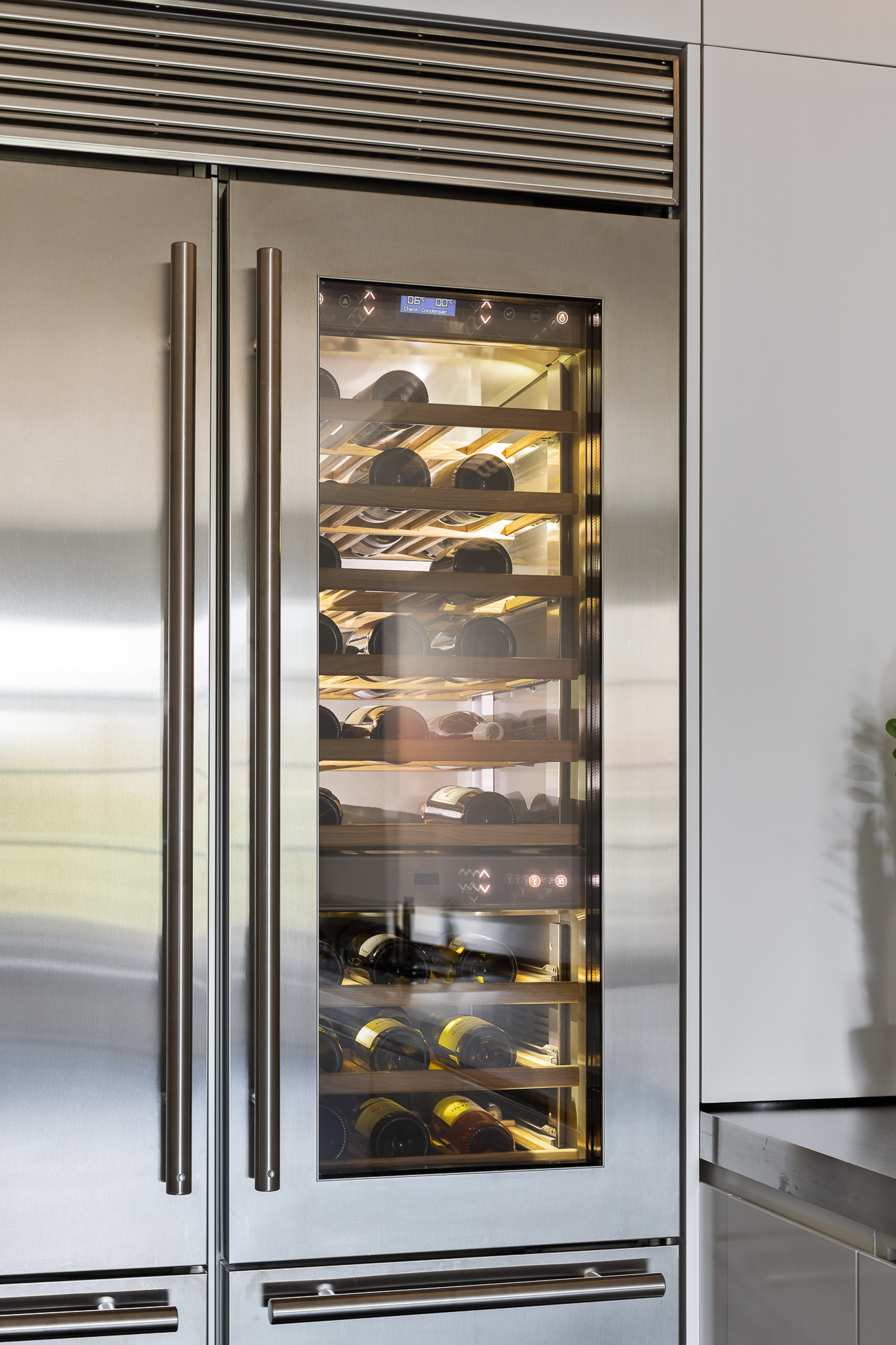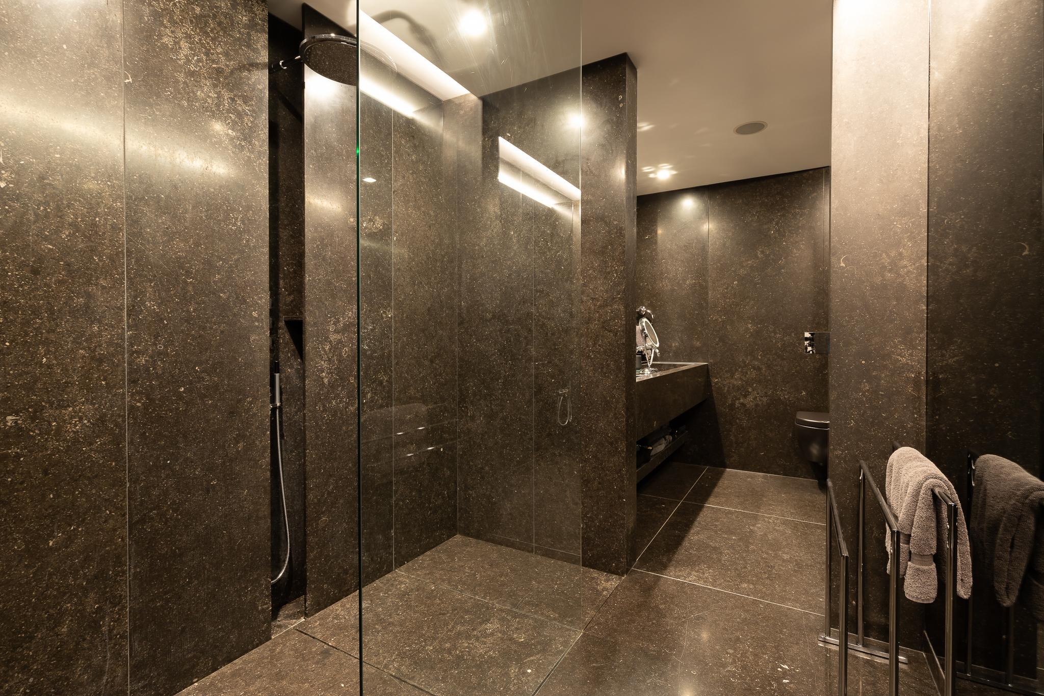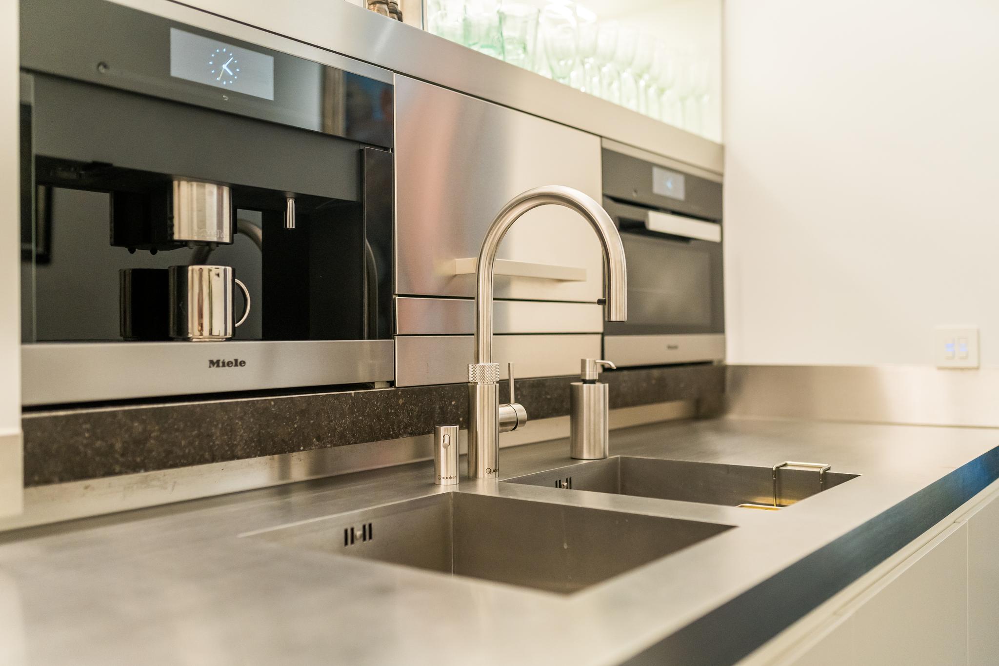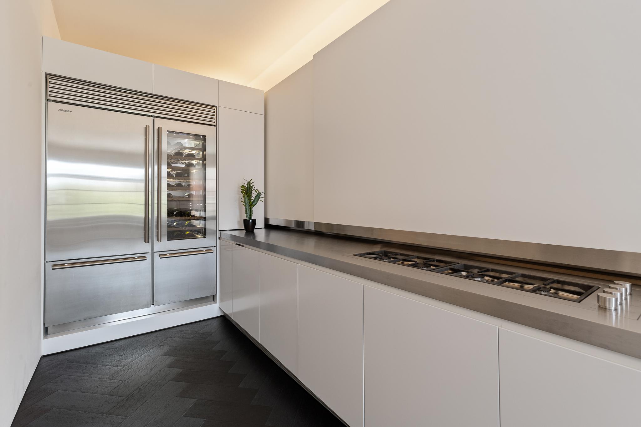 The semi-open-plan design kitchen has very luxurious built-in appliances. A Fhiaba refrigerator, freezer and wine cooler (with 6 temperature zones), 4 burner stove, stainless steel hood, Siemens dishwasher with Zeolith drying system, Insinkerator, Quooker with CUBE, Miele coffee machine, pyrolysis oven and high pressure steam oven. All kitchen cabinets are lighted and equipped with walnut wood storage systems. Two of the kitchen cabinets have washing machine and dryer connections. In the living area there are convector radiators at the front and a beautiful gas fireplace has been installed.