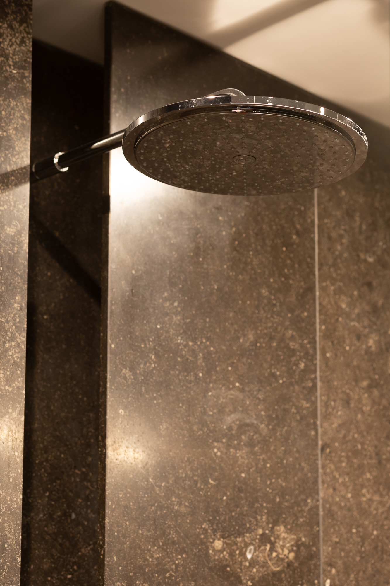 At the rear of the house is the sleeping area with lots of (clothing) closet space, a separate toilet with fountain and the spacious bathroom. Here you can easily create a third bedroom. The bathroom is fully constructed of high-quality Belgian bluestone and is equipped with a bath tub, large shower, double sink with storage, toilet and underfloor heating. There is a central water softener in the house, air extraction and all fixtures are of the Danish brand VOLA.