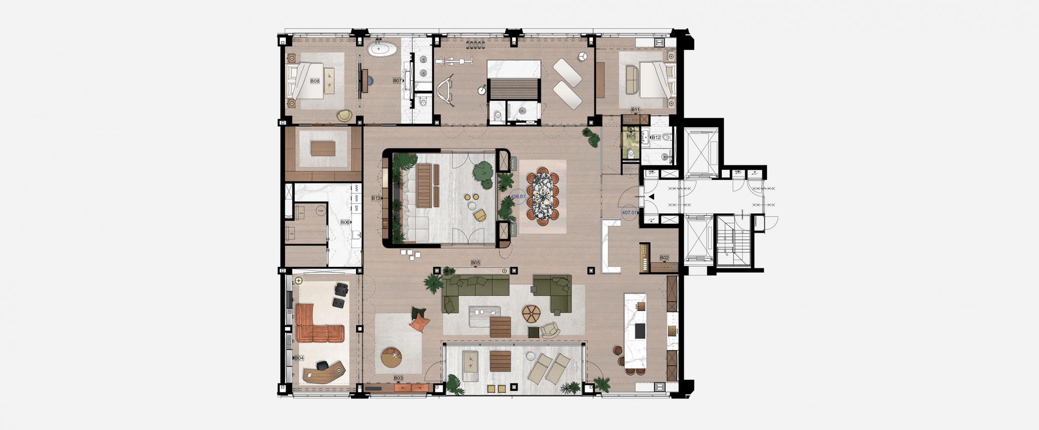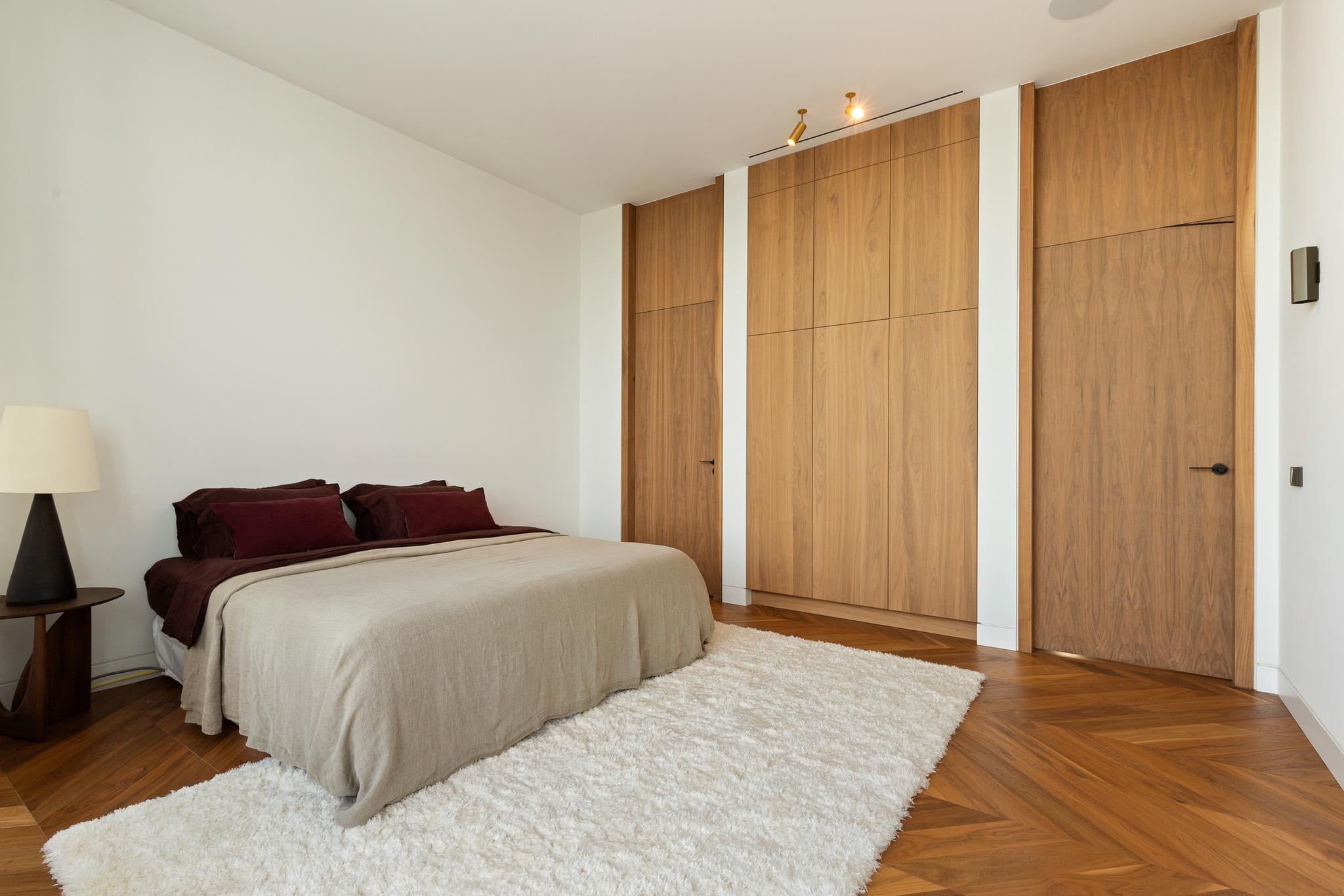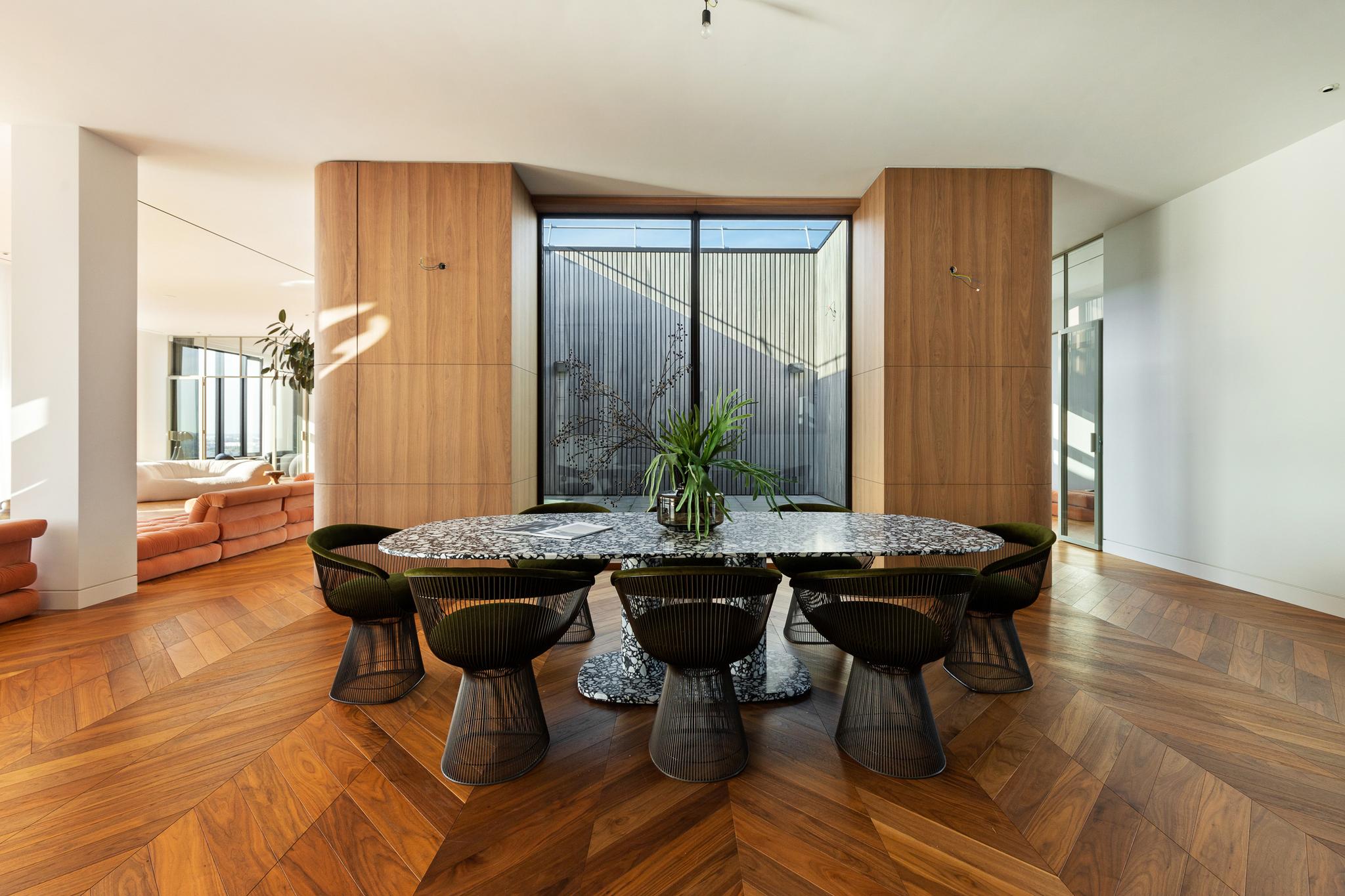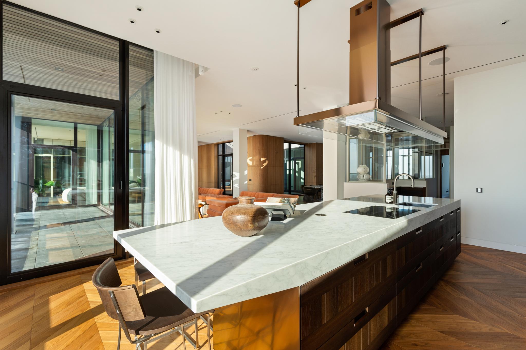 This unique penthouse offers 2-3 bedrooms, a private gym, sauna, and a yoga and meditation room. The sun flooded eat-in kitchen features a custom-made Arclinea kitchen with Calacatta marble worktop. The living area boasts an imposing custom-made marble dining table that was mindfully placed during construction. Furthermore, there is ample closet and storage space throughout the apartment.