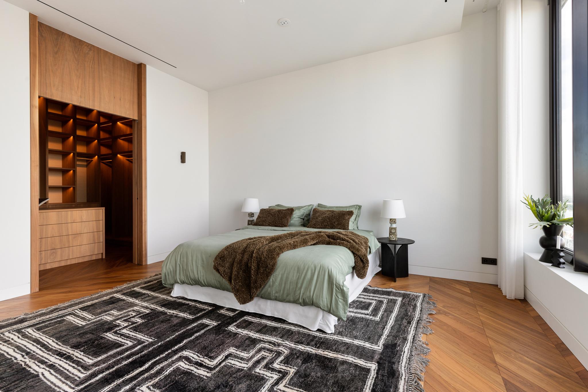 This home consists of 415 m² of same-level, bright indoor and outdoor living space, including a patio of 31 m² and a balcony of 24 m². The large patio is included in the building’s volume and is protected by glass windscreens. As a subtle reference to the location’s history as timber docks, all exterior ceilings are clad in timber, giving the building a warm atmosphere.