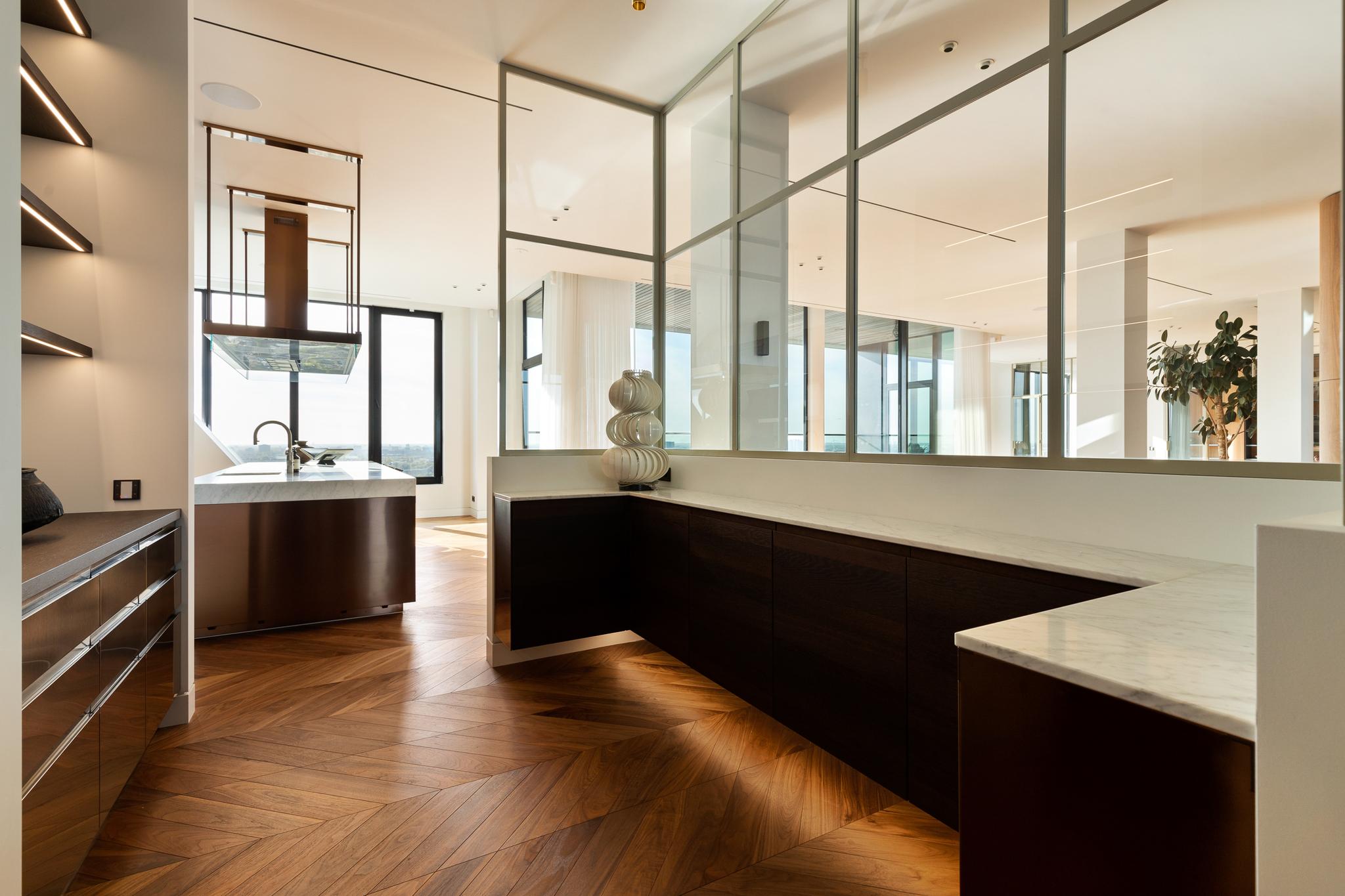The ground floor resident lift offers a stunning outside view while taking you up to the penthouse floor. Upon entering the home, you immediately experience the beautiful, extra-high ceilings and large windows that open up the penthouse to the spectacular views all around it.
