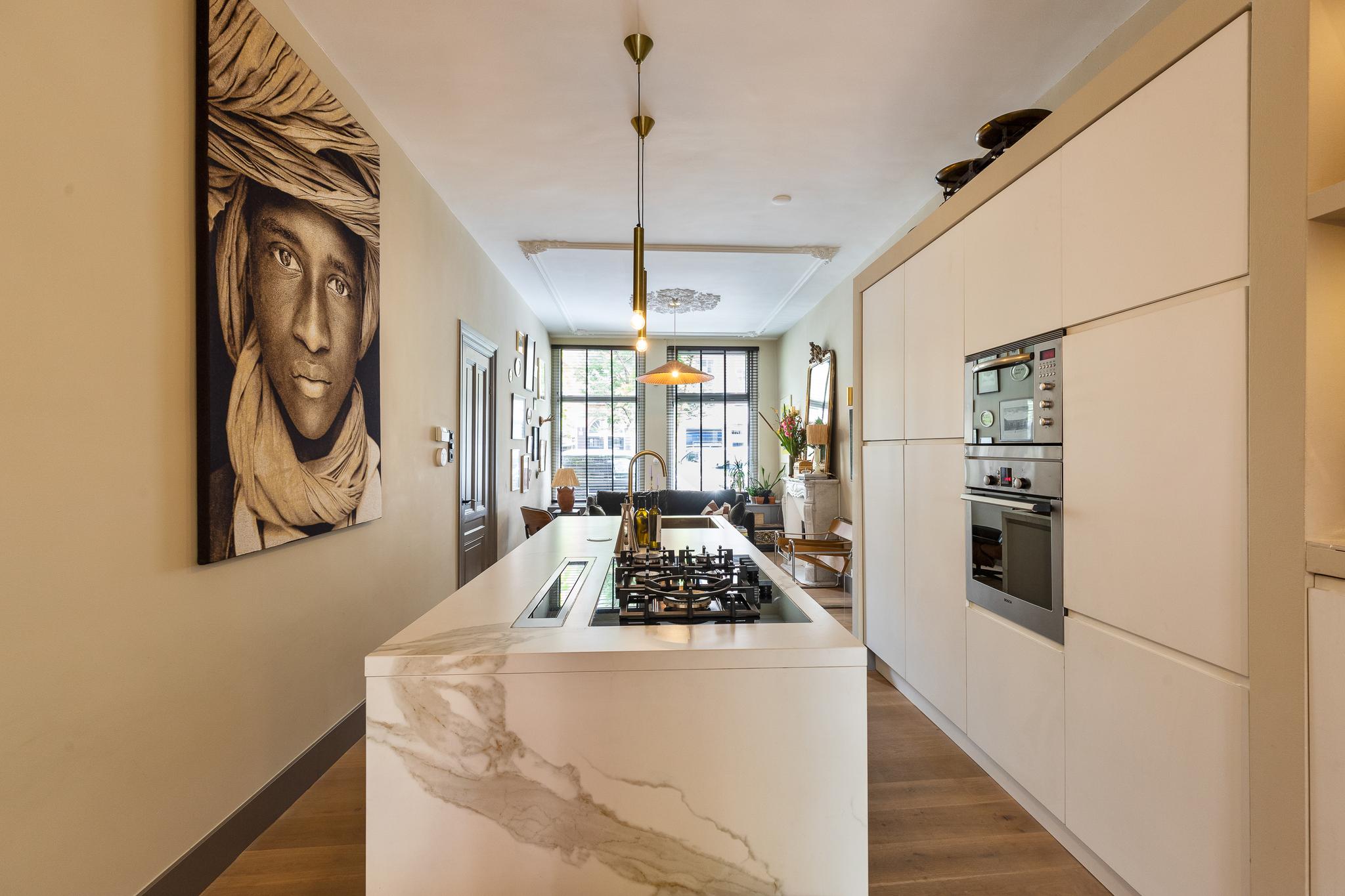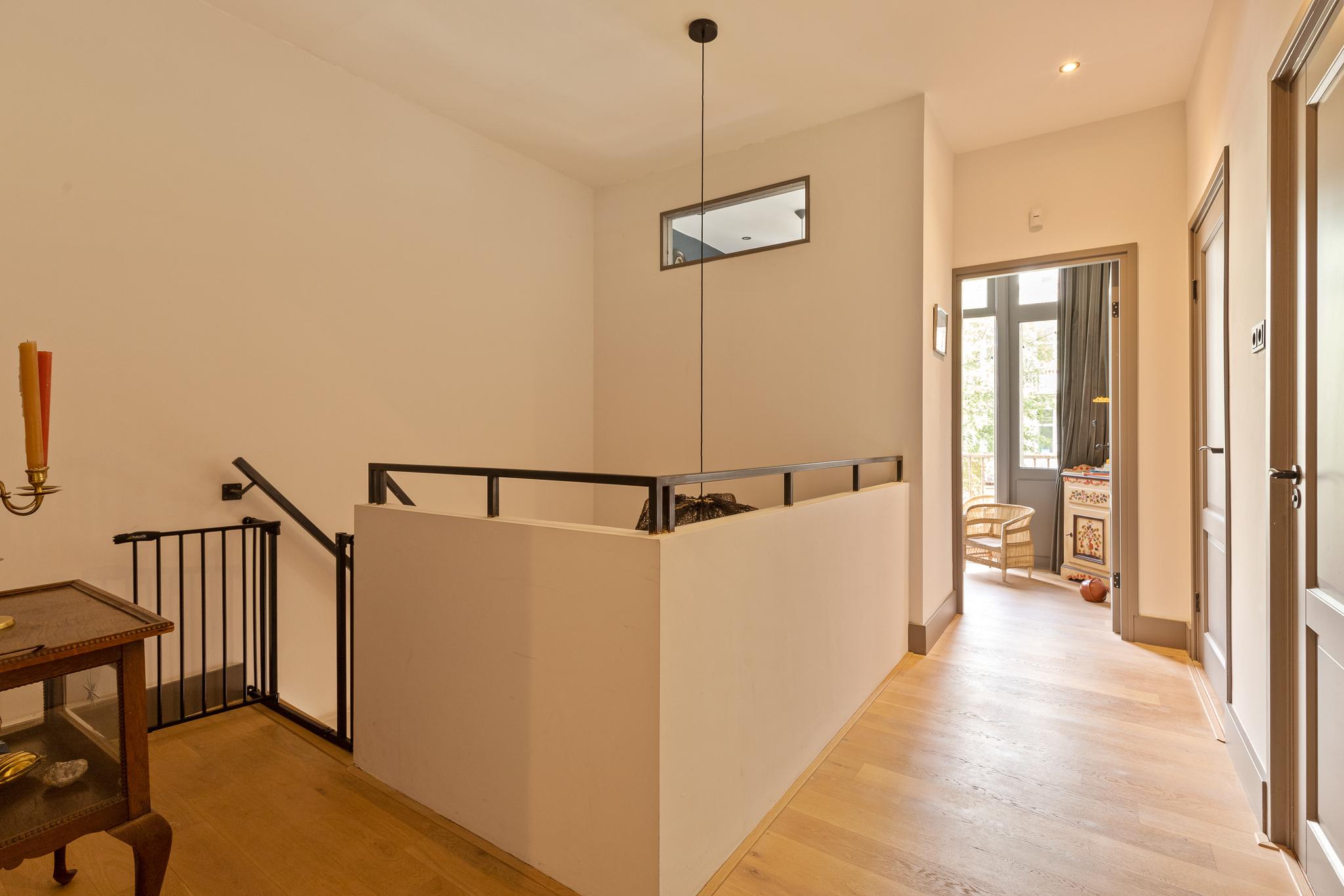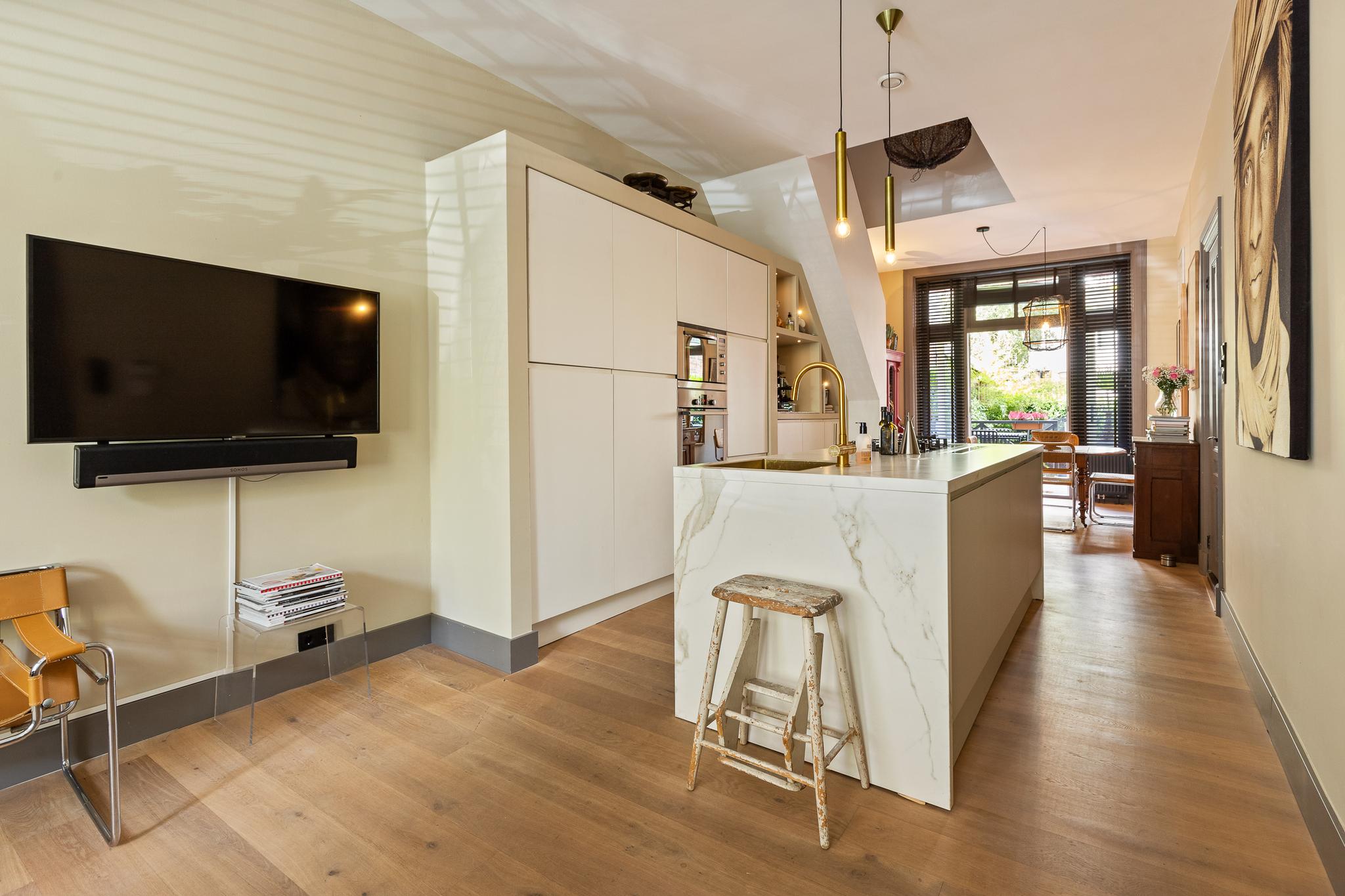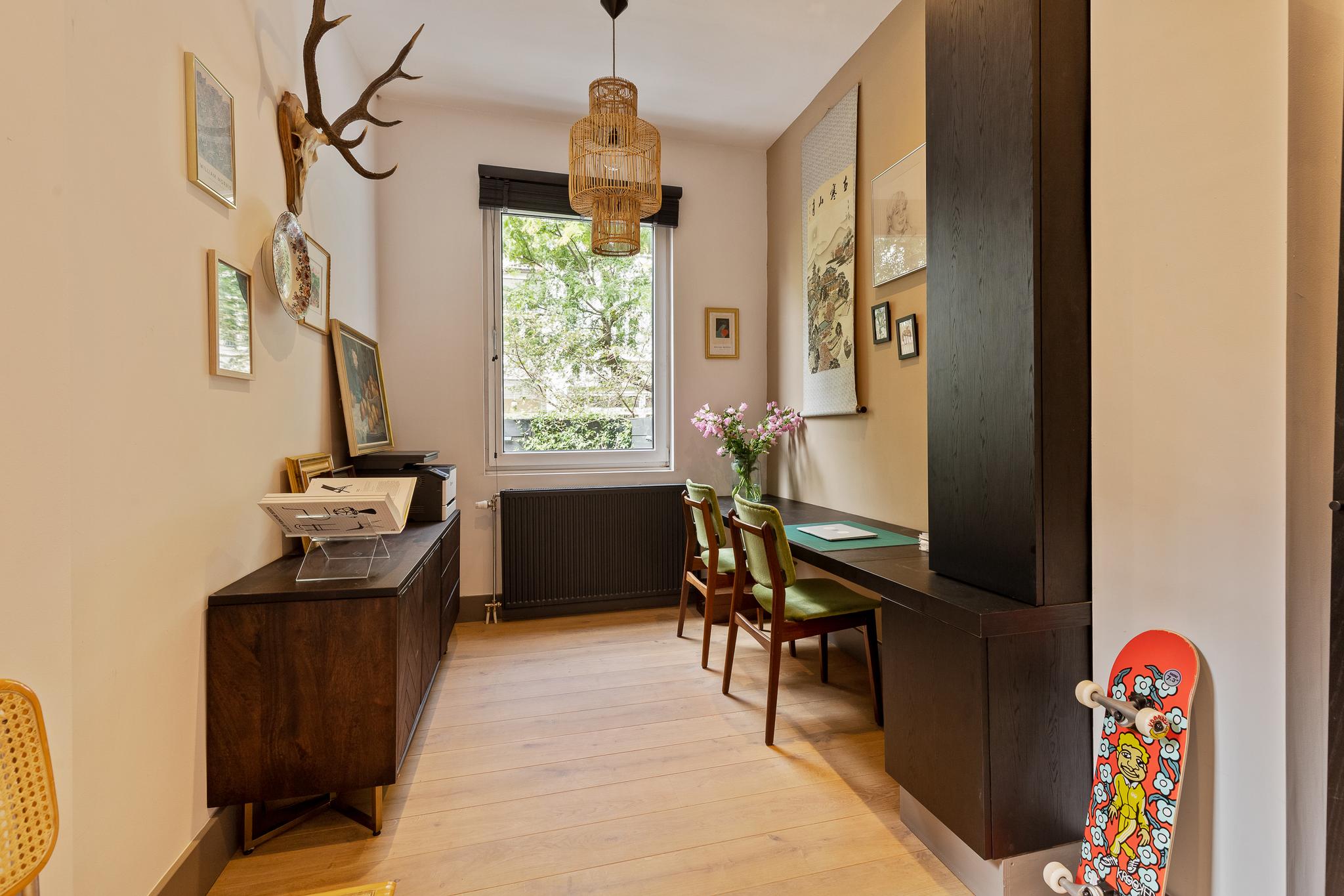 In the center of the living room, the luxury open kitchen (2020) with cooking island is situated. At the front side, there is a cozy sitting room with two large windows overlooking the wide street. Double doors at the rear give direct access to a spacious porch with sunny garden of approximately 30 m2, facing northwest.