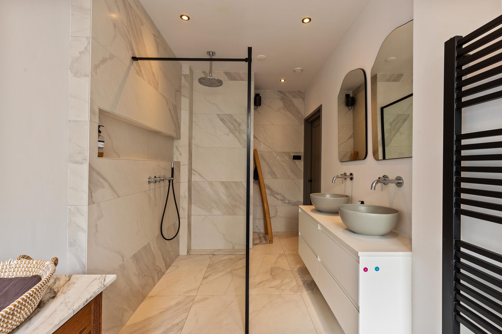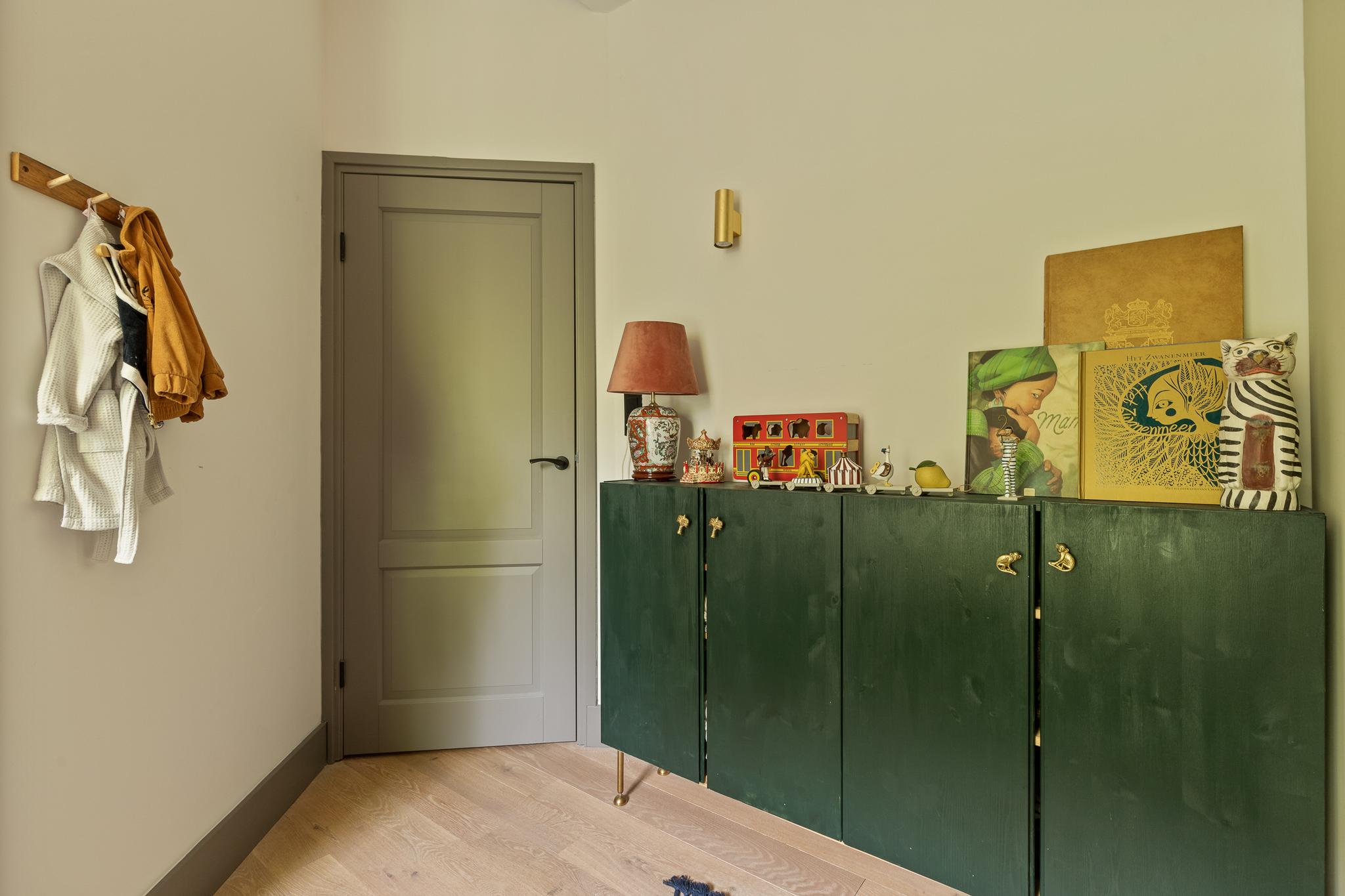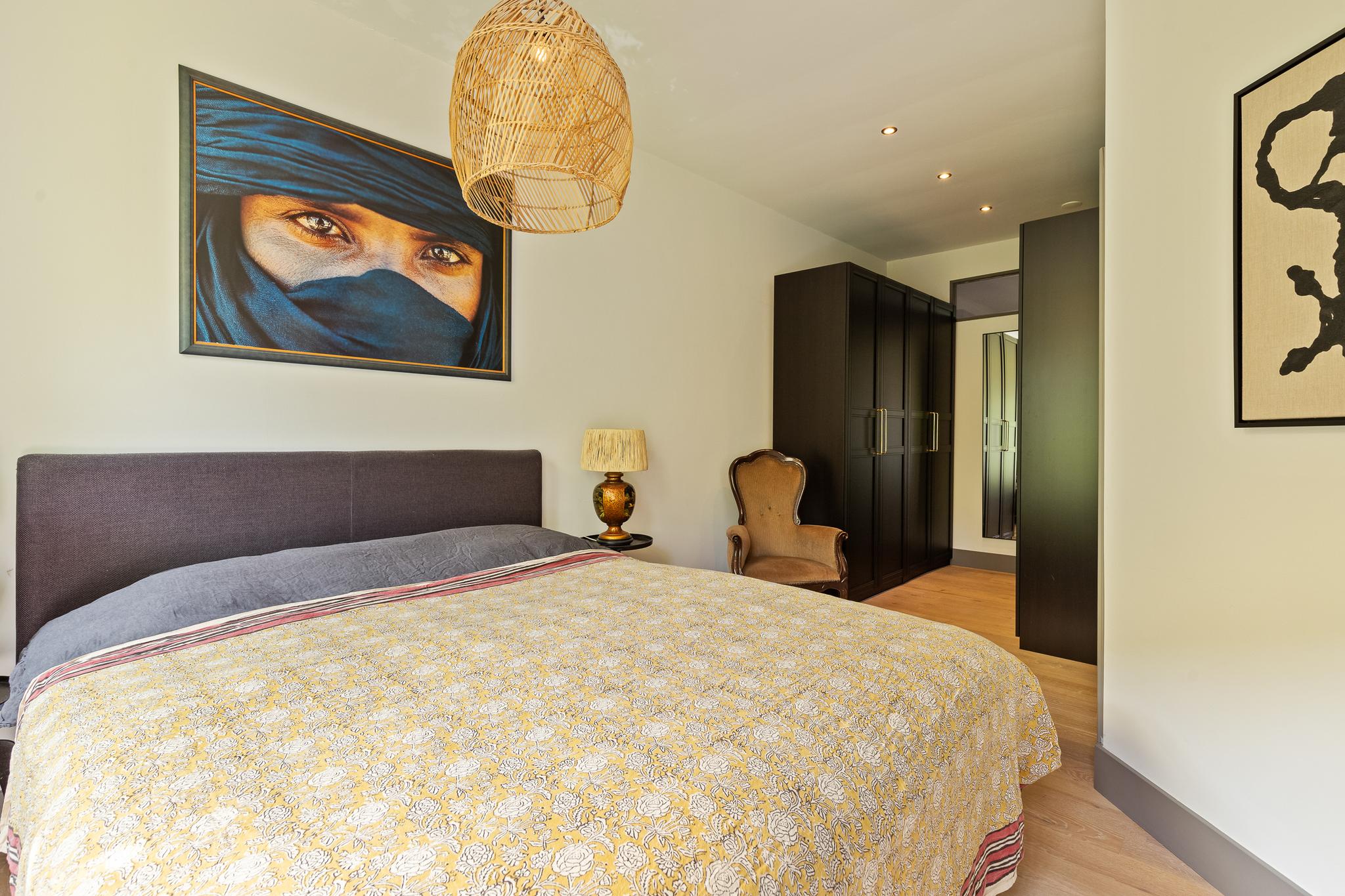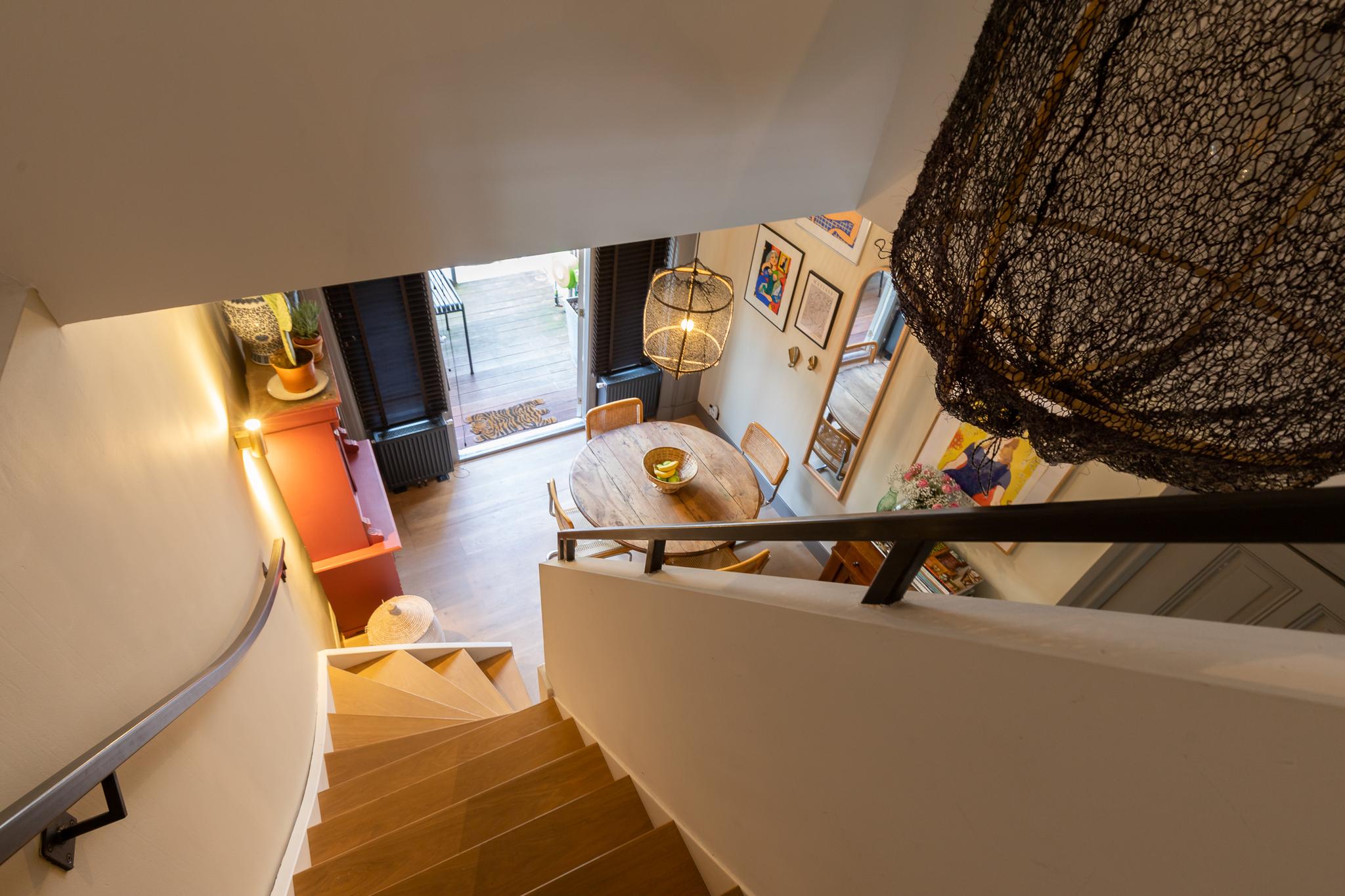 In the center of the living room, the luxury open kitchen (2020) with cooking island is situated. At the front side, there is a cozy sitting room with two large windows overlooking the wide street. Double doors at the rear give direct access to a spacious porch with sunny garden of approximately 30 m2, facing northwest.