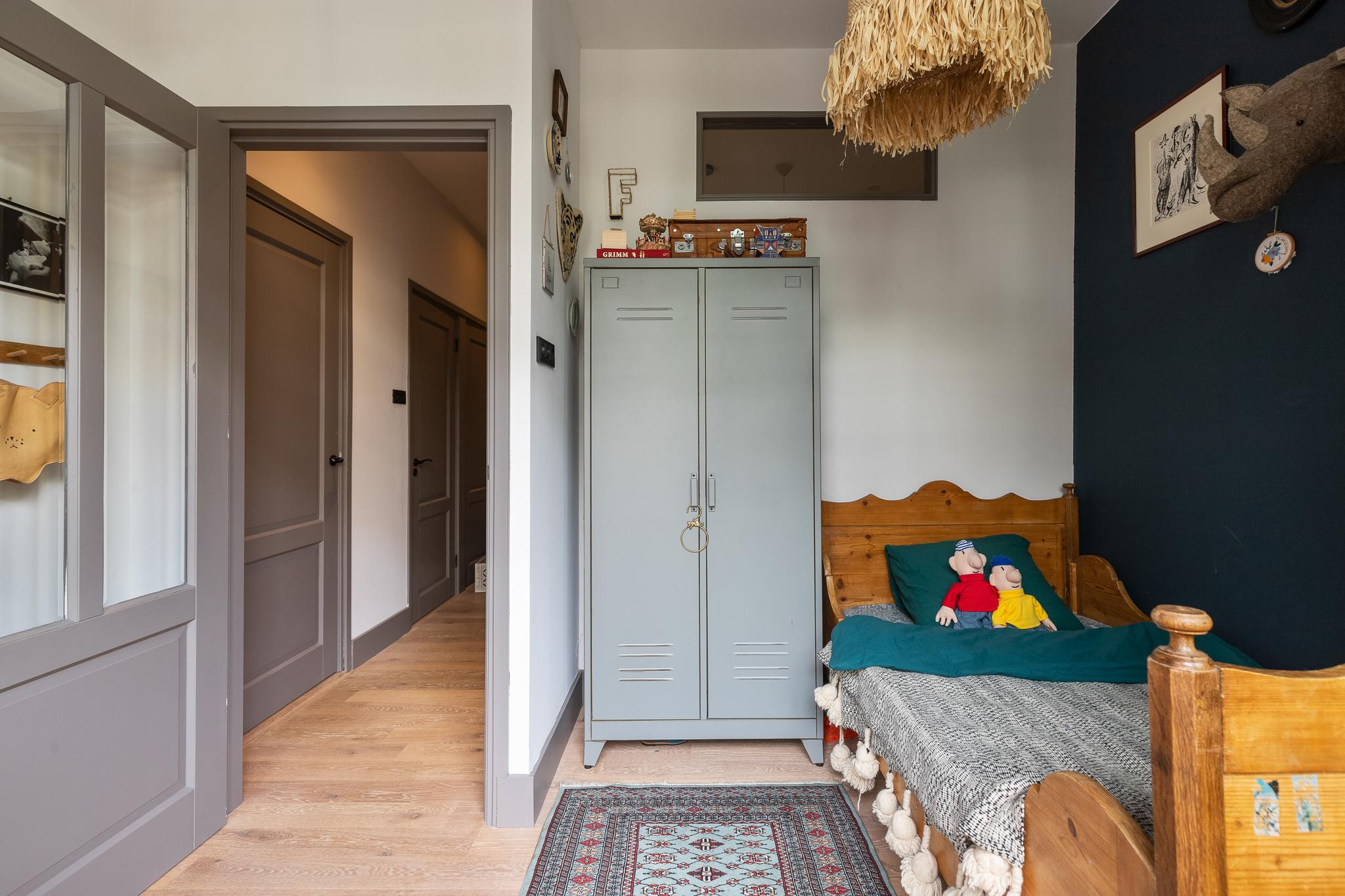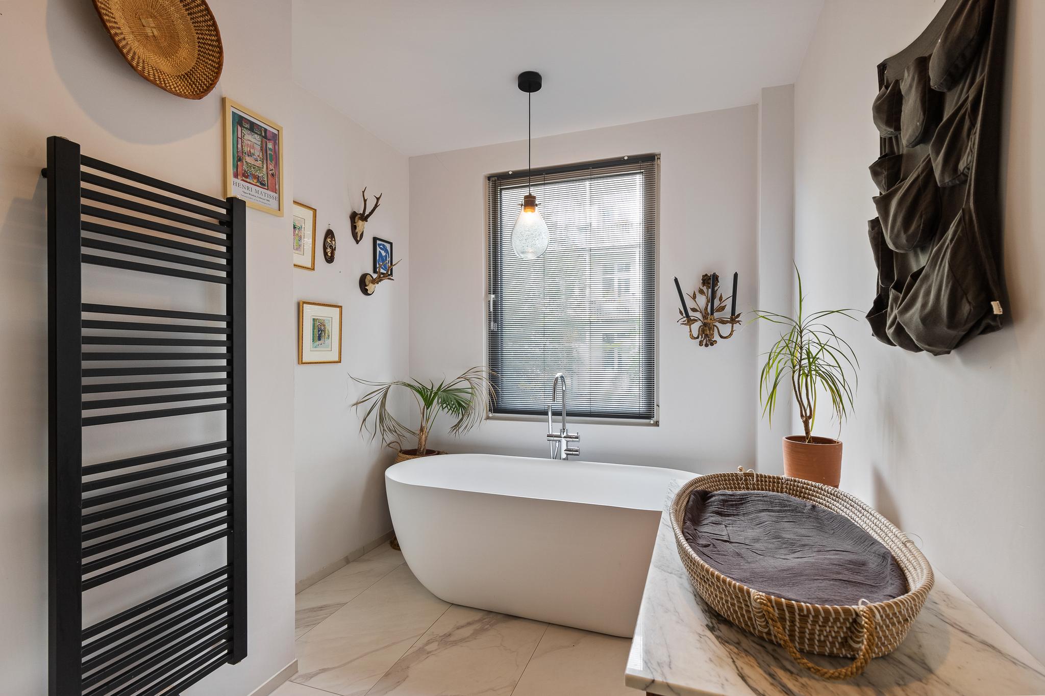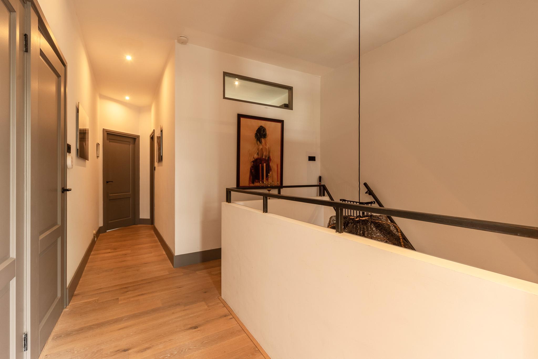 From the living room, a large staircase leads up to the second floor. The spacious hallway and open mezzanine provide a spacious effect. There are three well-sized bedrooms on this floor, of which two have their own balcony. The modern bathroom (2020) has a freestanding bathtub, shower, and double sink with furniture piece. Also, a second separate toilet and a second storage room are located on this floor.