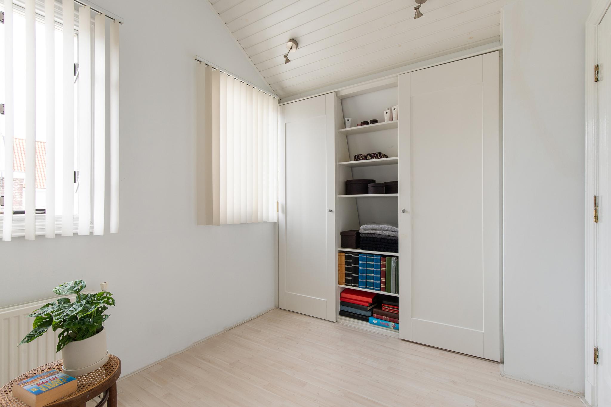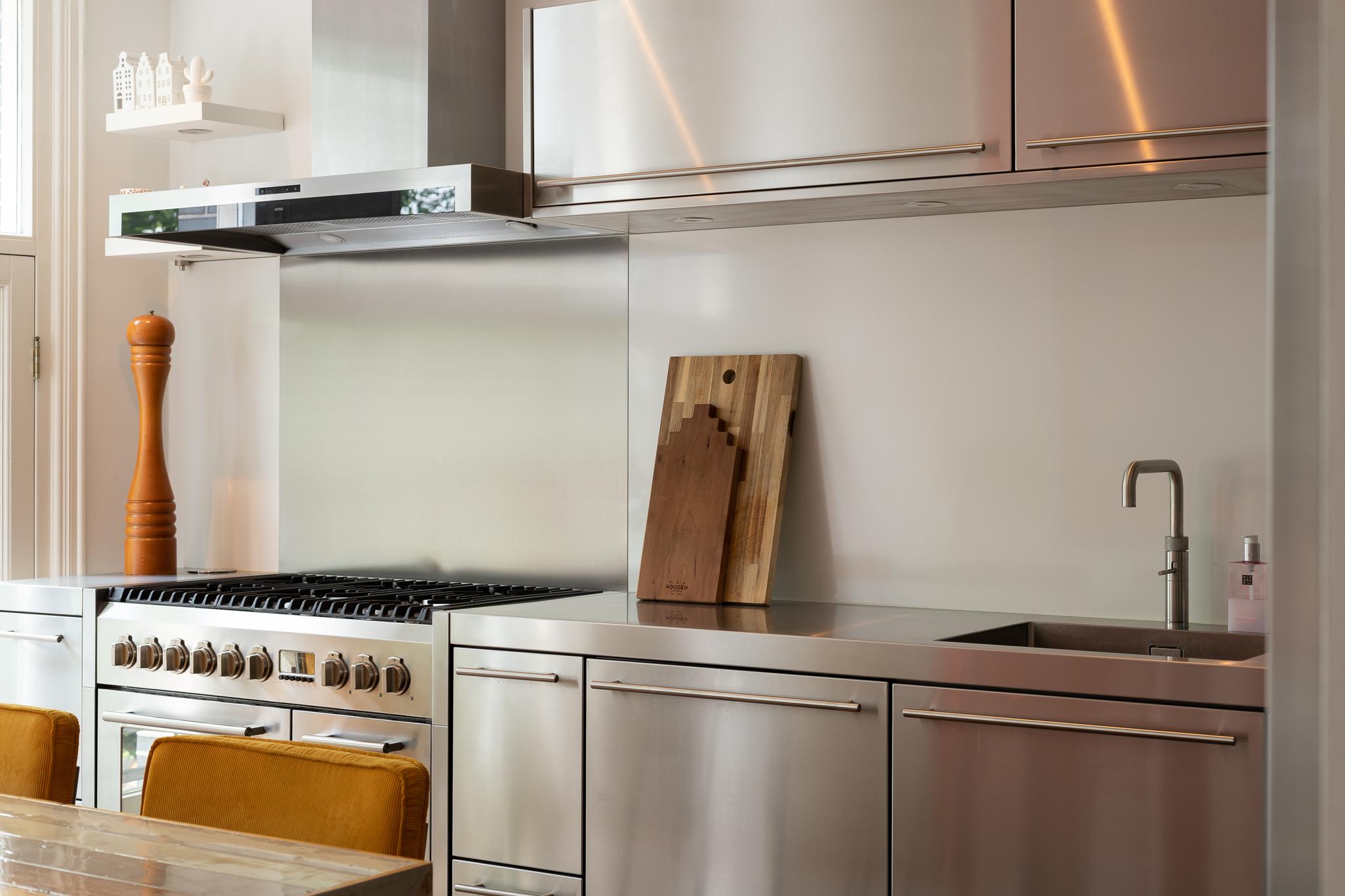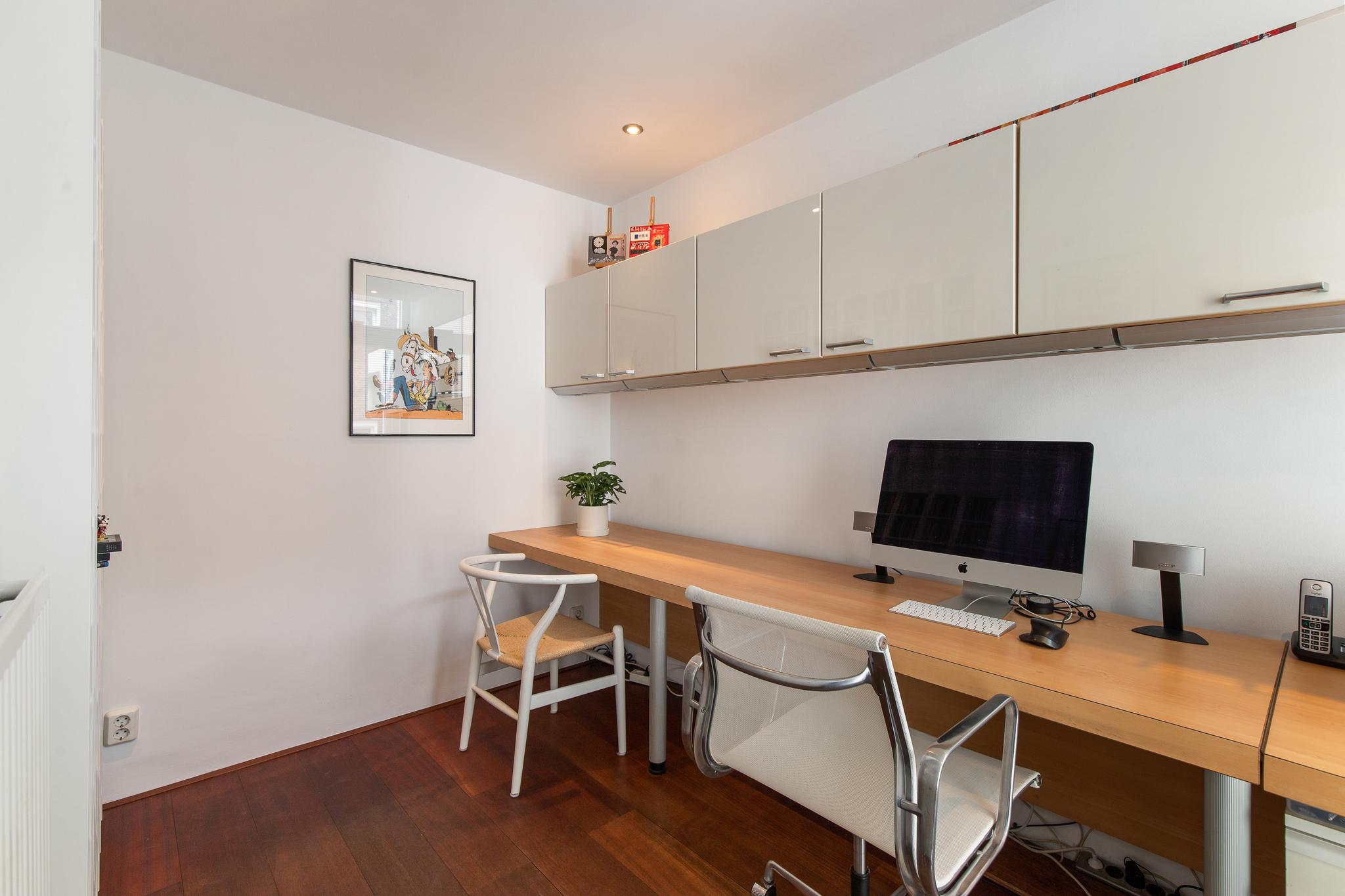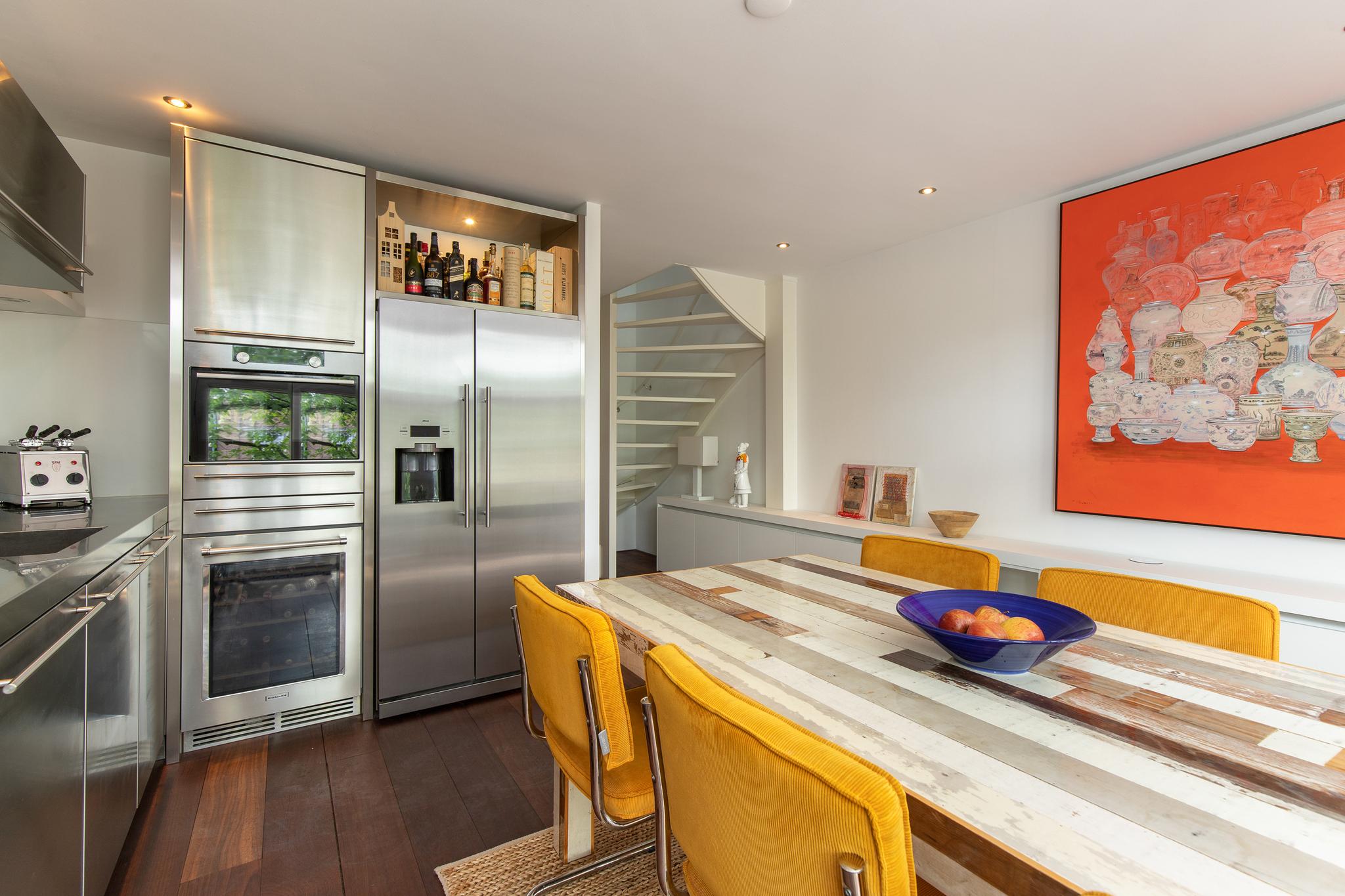 At the front of the house is the luxurious and custom stainless-steel kitchen which features appliances and a 6-burner stove with double oven from the brand ATAG. The (bed) room – now used as an office – is adjacent to a sunny terrace. There is a bathroom, a separate toilet and two storage rooms.